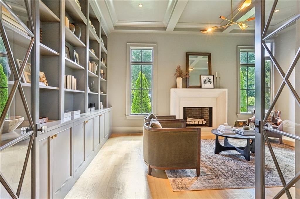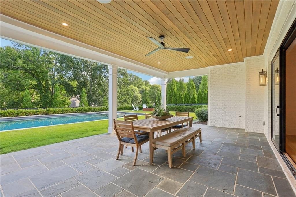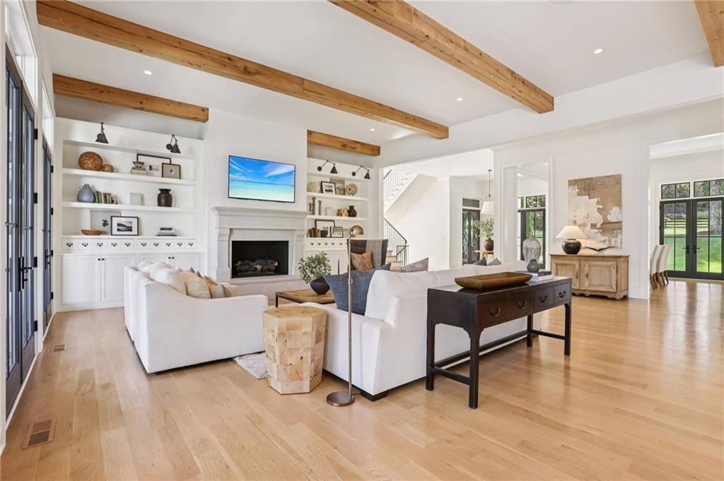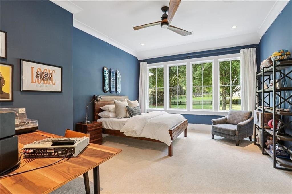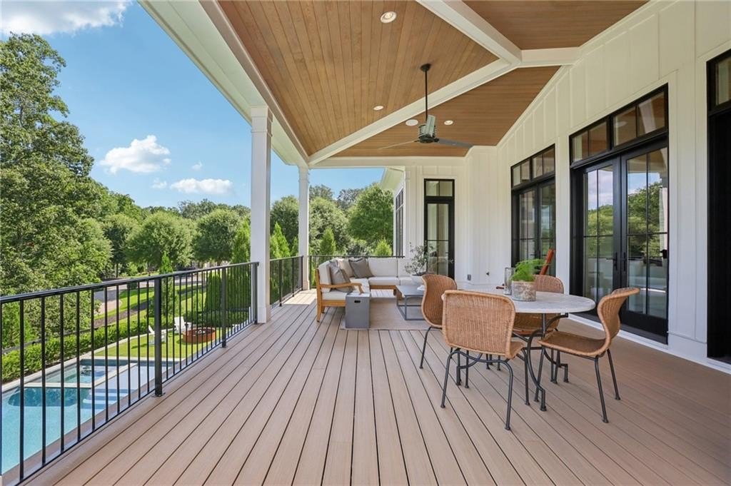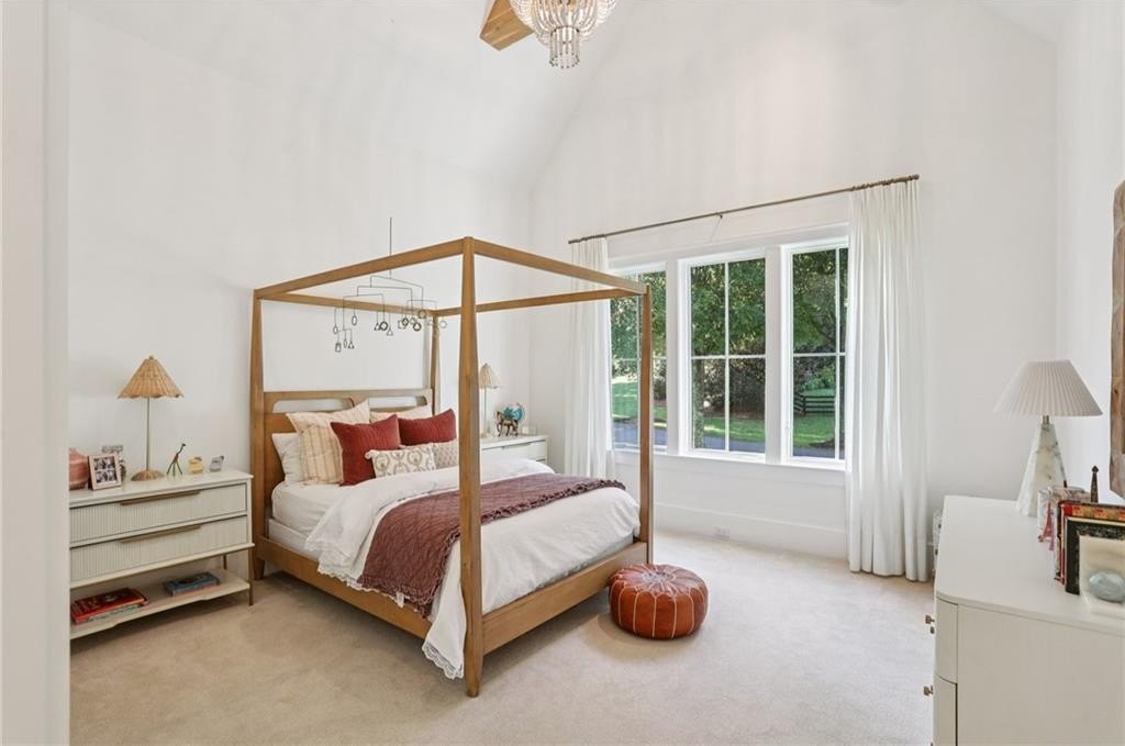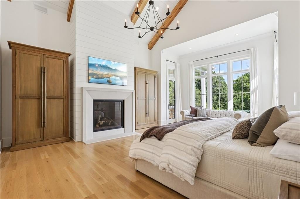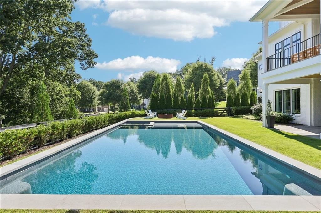 The main level includes a dramatic vaulted primary suite overlooking the pool, with private deck access and a spa-inspired bath complete with marble herringbone floors, a freestanding soaking tub, floating white oak vanities, and an oversized shower. An open-concept chef’s kitchen, perfect for entertaining features custom-built cabinetry, marble countertops, and 200-year-old reclaimed white oak beams. Enjoy the great room anchored by a custom limestone fireplace, one of three fireplaces (two gas, one wood burning) throughout the home. Additional features of this home include: A 6-car garage with 14-foot ceilings, epoxy floors, and ample space for car lifts; An elevator-ready shaft is centrally located for convenience; A large mudroom with a secondary staircase leading to a bonus suite with a kitchenette, beverage fridge, sink, and full bath—ideal for guests or an au pair; A fully finished daylight basement with a full kitchen, a built-in 4-bed bunk room, and direct walkout access to the pool; A 20’ x 40’ saltwater pool with an integrated spa, tanning ledge, and adjacent pool bath and natural blue stone patio. Enjoy the charming streetscape of Hayfield, with gas lanterns, granite curbing, copper mailboxes, and a stone's throw access to The Union Restaurant, Posie Fields, and Collab Kids Enrichment Center. This is more than a home—it’s a statement of refined living in one of North Atlanta’s most exclusive enclaves.