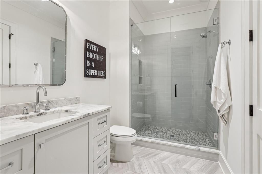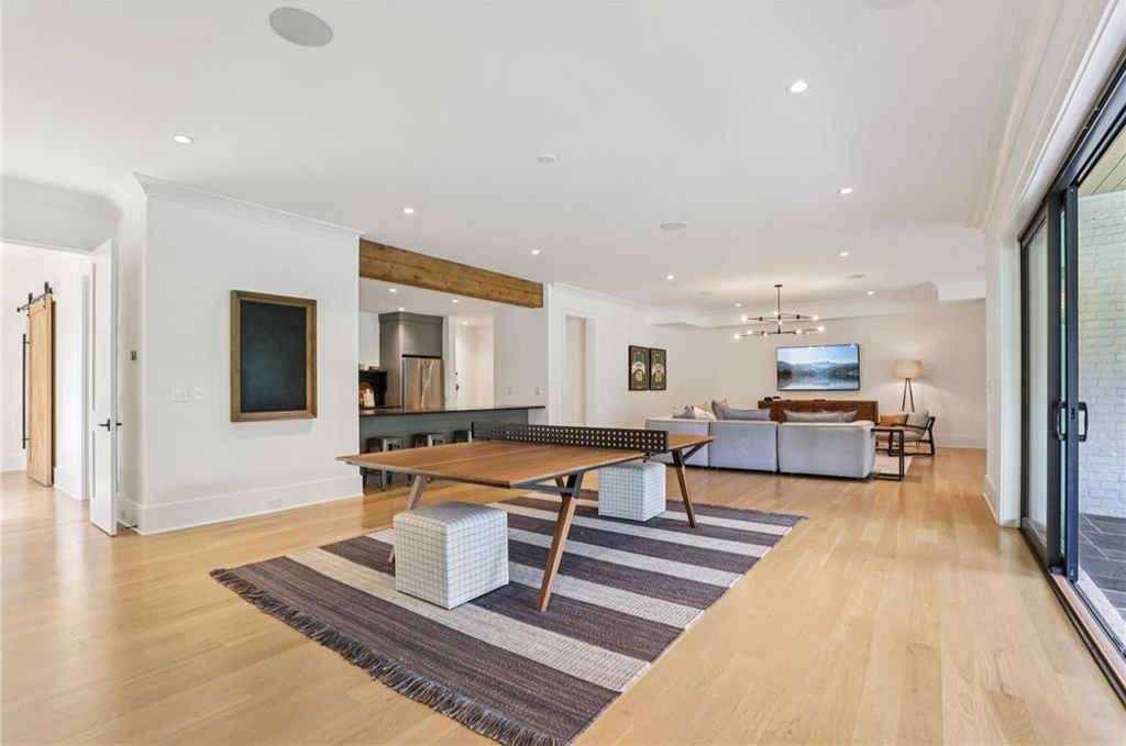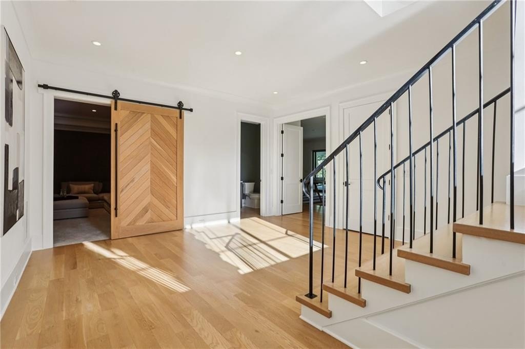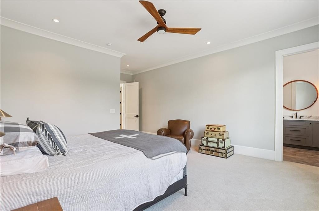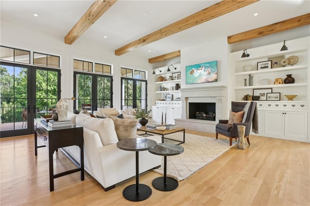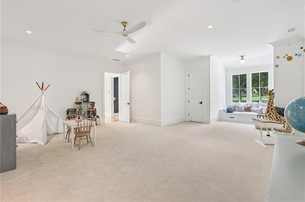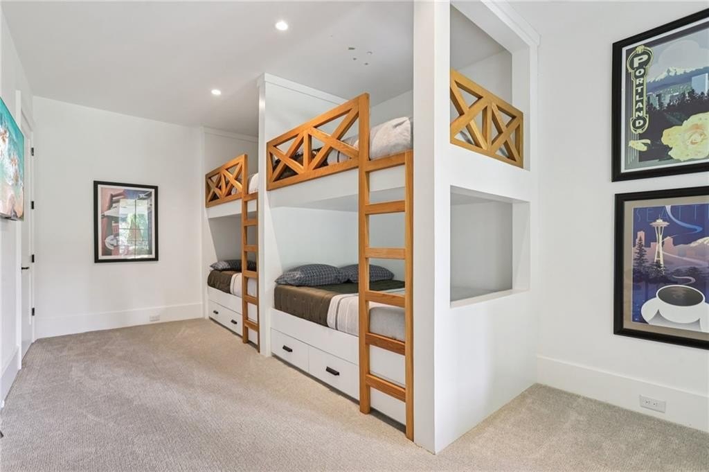 The main level includes a dramatic vaulted primary suite overlooking the pool, with private deck access and a spa-inspired bath complete with marble herringbone floors, a freestanding soaking tub, floating white oak vanities, and an oversized shower. An open-concept chef’s kitchen, perfect for entertaining features custom-built cabinetry, marble countertops, and 200-year-old reclaimed white oak beams. Enjoy the great room anchored by a custom limestone fireplace, one of three fireplaces (two gas, one wood burning) throughout the home. Additional features of this home include: A 6-car garage with 14-foot ceilings, epoxy floors, and ample space for car lifts; An elevator-ready shaft is centrally located for convenience; A large mudroom with a secondary staircase leading to a bonus suite with a kitchenette, beverage fridge, sink, and full bath—ideal for guests or an au pair; A fully finished daylight basement with a full kitchen, a built-in 4-bed bunk room, and direct walkout access to the pool; A 20’ x 40’ saltwater pool with an integrated spa, tanning ledge, and adjacent pool bath and natural blue stone patio. Enjoy the charming streetscape of Hayfield, with gas lanterns, granite curbing, copper mailboxes, and a stone's throw access to The Union Restaurant, Posie Fields, and Collab Kids Enrichment Center. This is more than a home—it’s a statement of refined living in one of North Atlanta’s most exclusive enclaves.