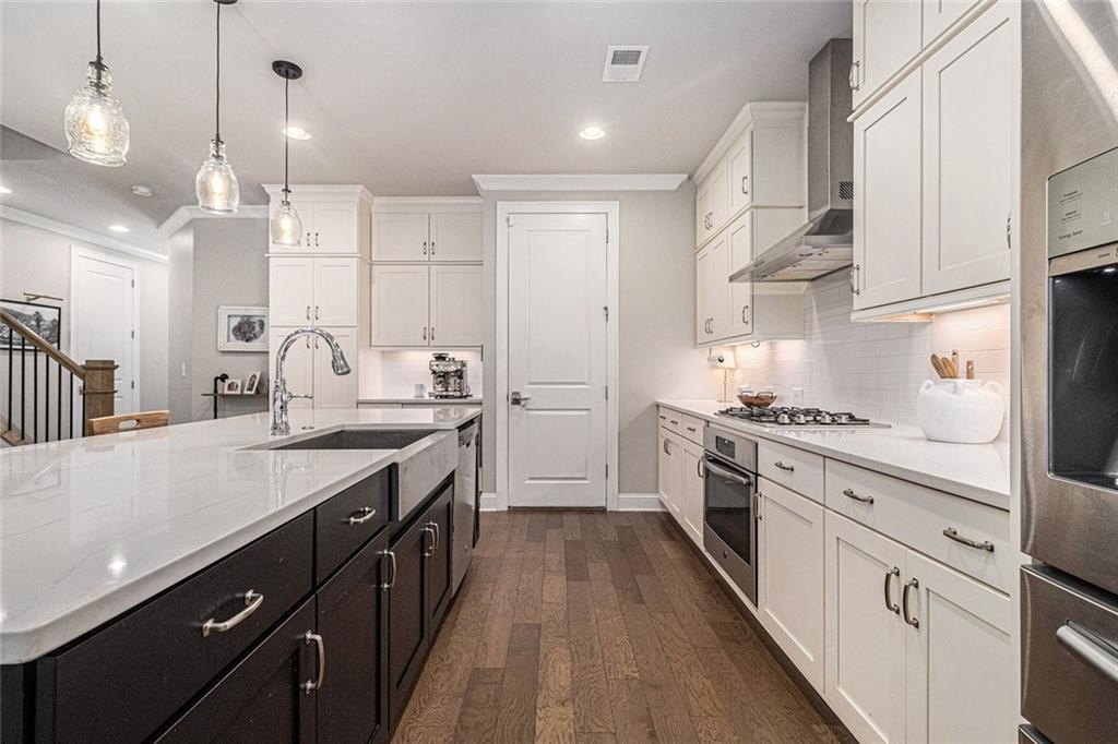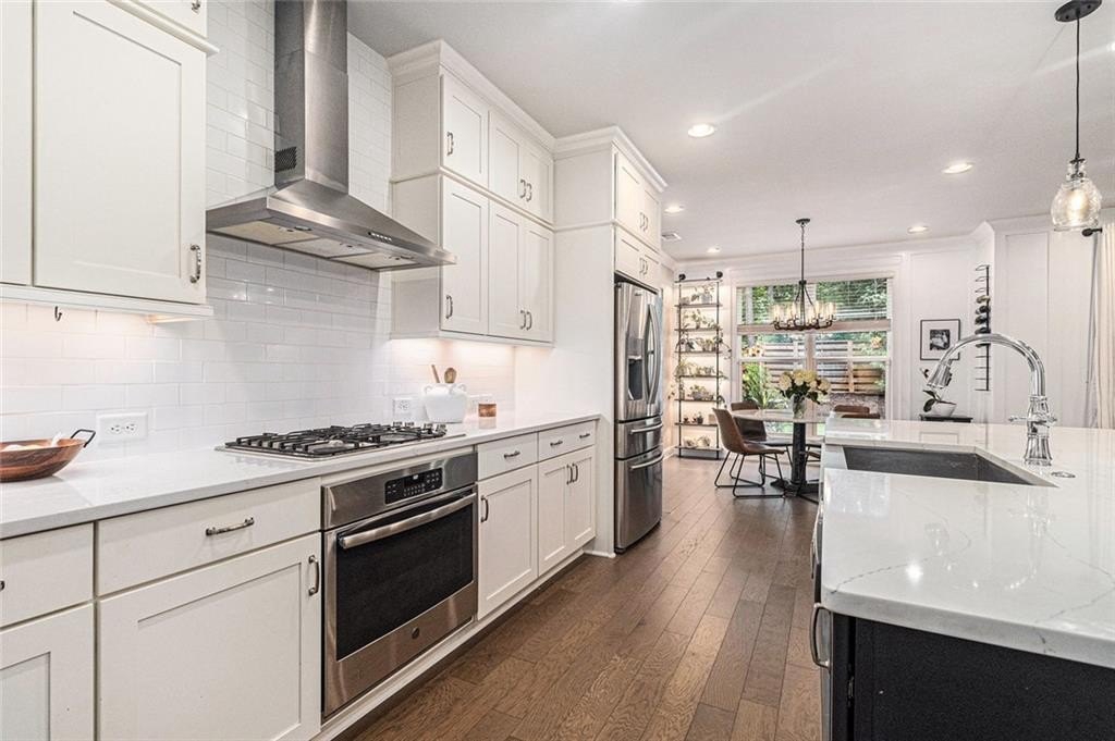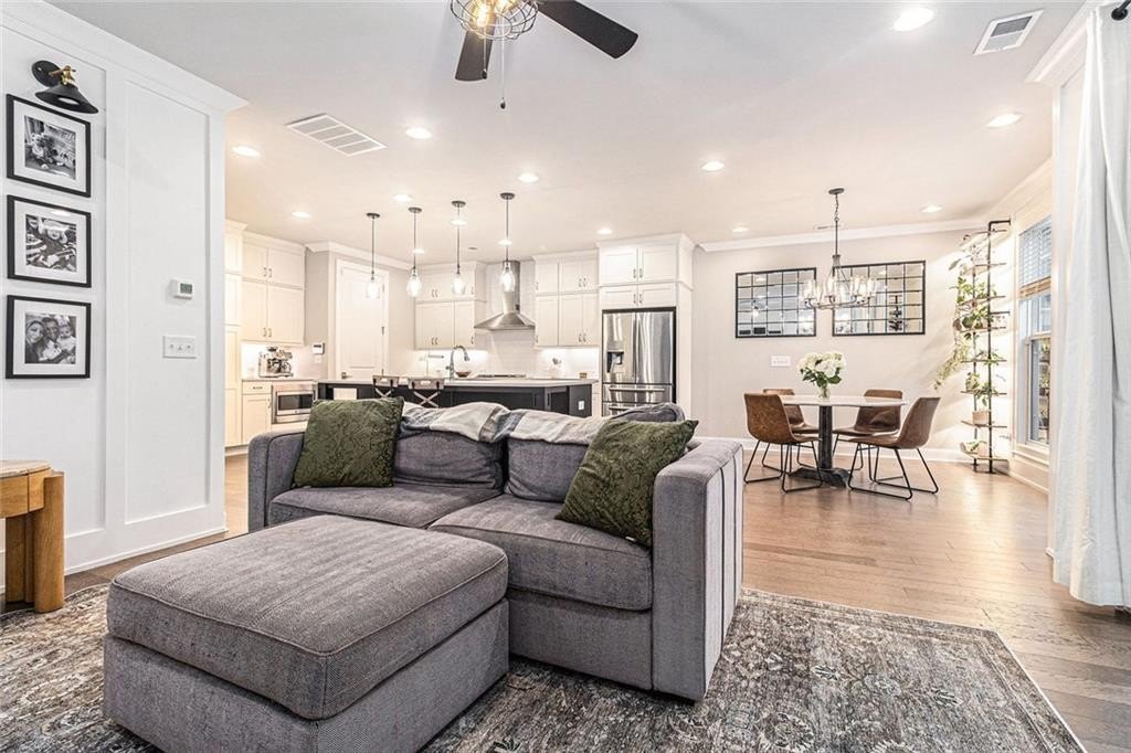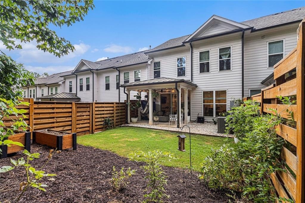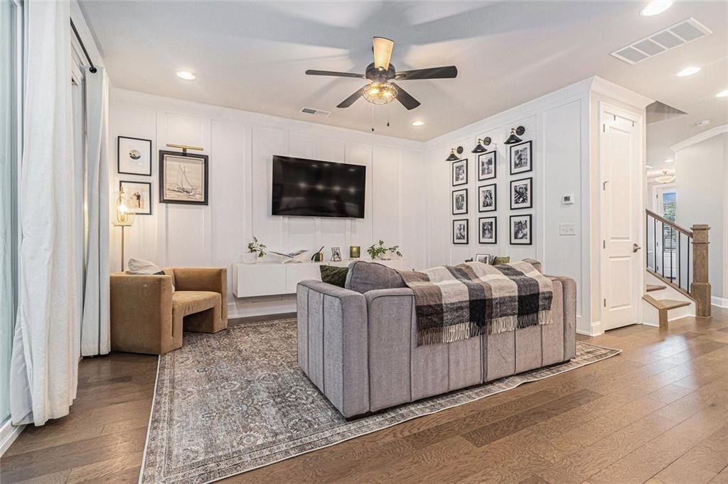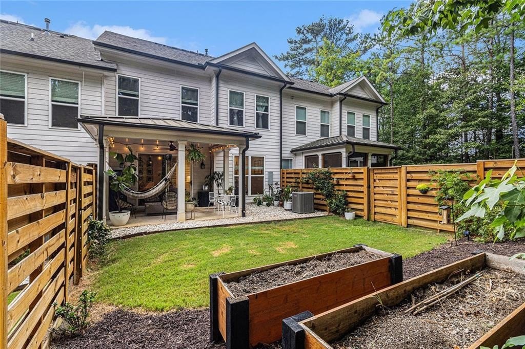 Stunning Farmhouse-Inspired Townhome! You'll approach through the gated entry to this immaculate, architecturally stunning community. Home features wide plank hardwood floors balanced with silvery-white living spaces including chef's kitchen w/ sleek quartz countertops, stainless appliances, subway tile, gas cooking w stainless vent, massive breakfast bar, island with sink, pendant lighting, large open dining, family room w/ batton board millwork and wall of windows overlooking the ultra private fenced backyard. Entertaining expands to covered patio, custom fencing lined by a canopy of trees. Owners suite w trey ceiling, double french doors to tile bath, massive spa shower, separate quartz vanities, two secondary bedrooms and bath with double sinks, carriage style 2 car garage with additional storage added by Seller. Imagine owning this stunning home in the best spot in this quiet neighborhood with walking path and pond, minutes to Roswell Area Park, Downtown Roswell, Crabapple, Alpharetta and Avalon. All this and more with Top Rated Schools.