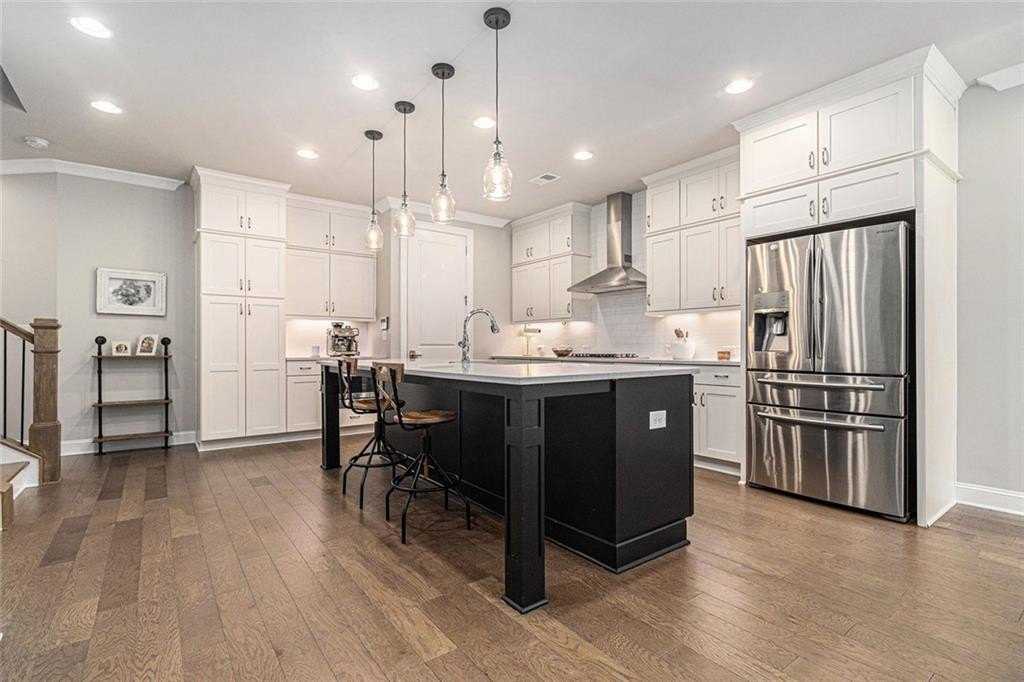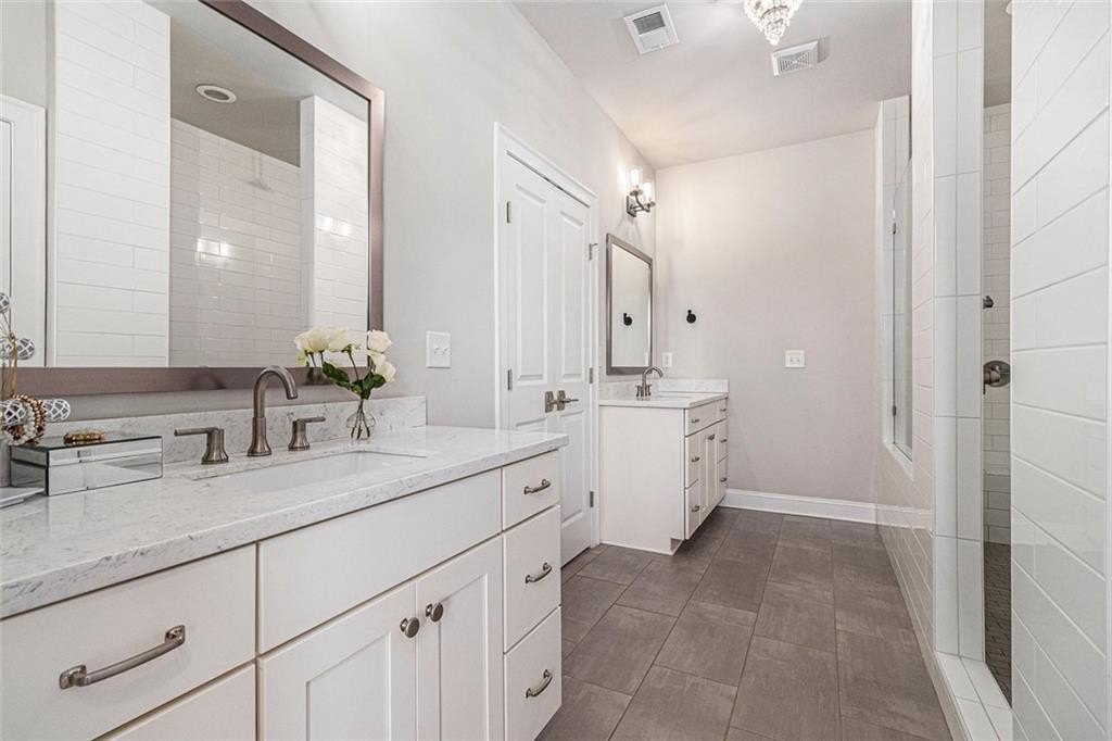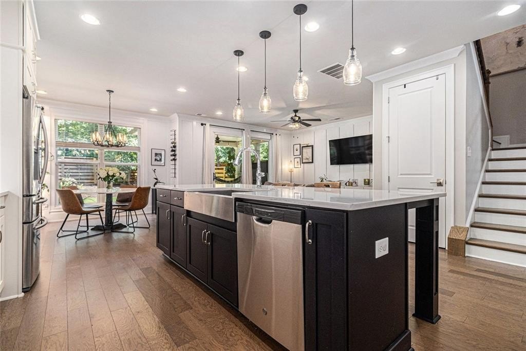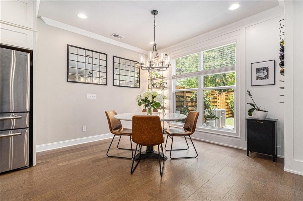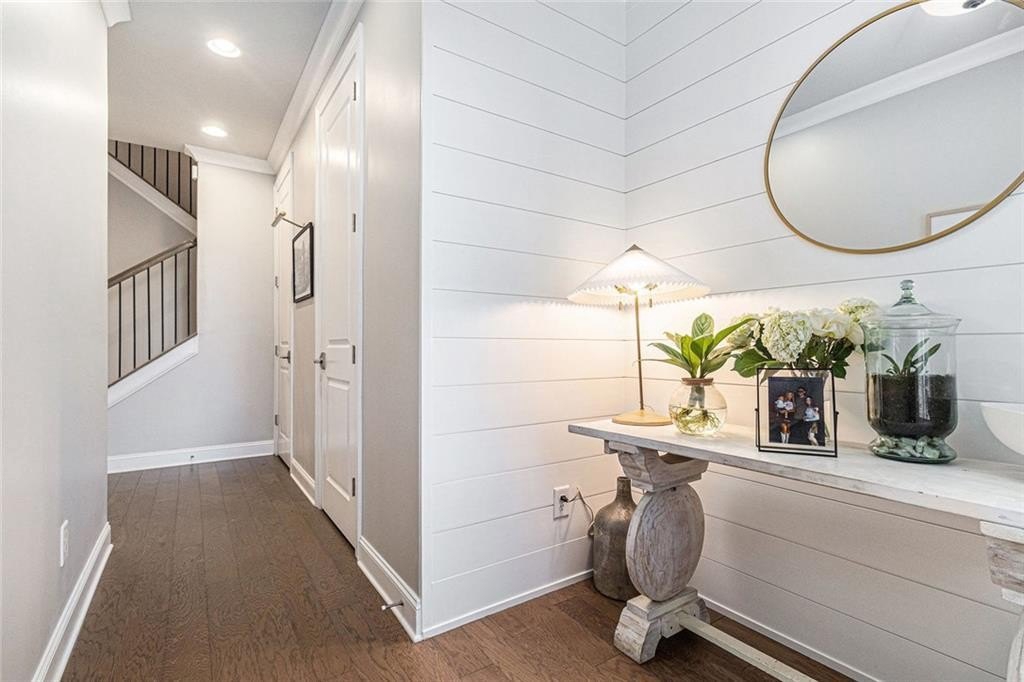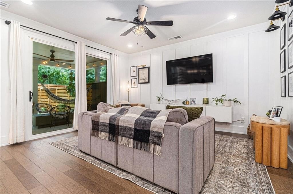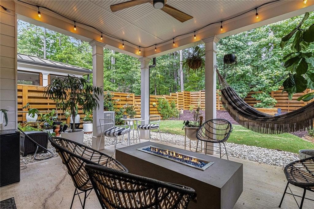 Stunning Farmhouse-Inspired Townhome! You'll approach through the gated entry to this immaculate, architecturally stunning community. Home features wide plank hardwood floors balanced with silvery-white living spaces including chef's kitchen w/ sleek quartz countertops, stainless appliances, subway tile, gas cooking w stainless vent, massive breakfast bar, island with sink, pendant lighting, large open dining, family room w/ batton board millwork and wall of windows overlooking the ultra private fenced backyard. Entertaining expands to covered patio, custom fencing lined by a canopy of trees. Owners suite w trey ceiling, double french doors to tile bath, massive spa shower, separate quartz vanities, two secondary bedrooms and bath with double sinks, carriage style 2 car garage with additional storage added by Seller. Imagine owning this stunning home in the best spot in this quiet neighborhood with walking path and pond, minutes to Roswell Area Park, Downtown Roswell, Crabapple, Alpharetta and Avalon. All this and more with Top Rated Schools.