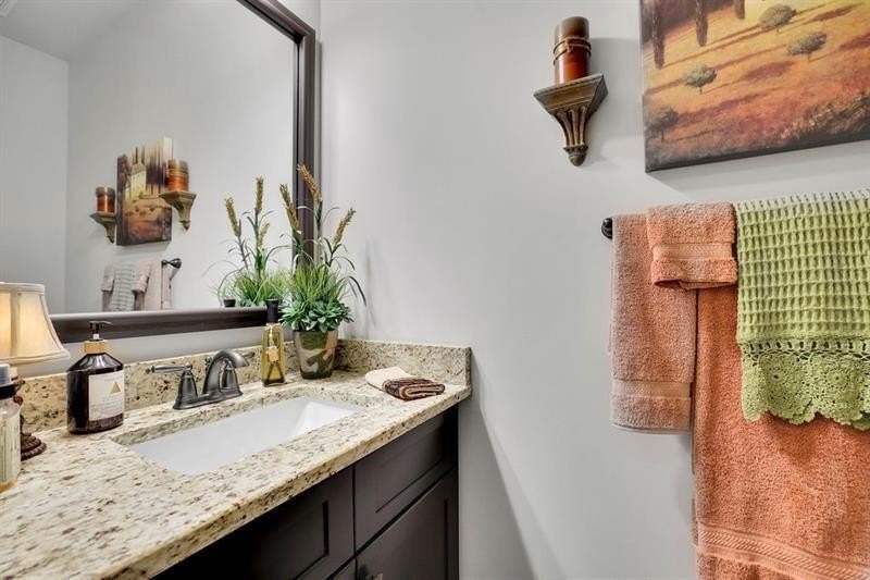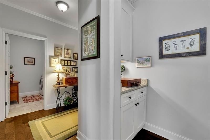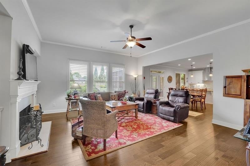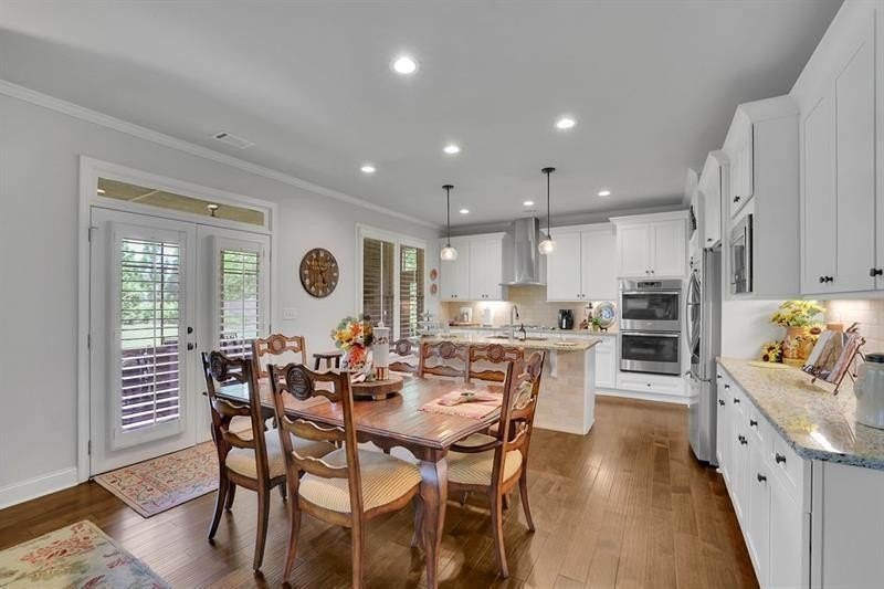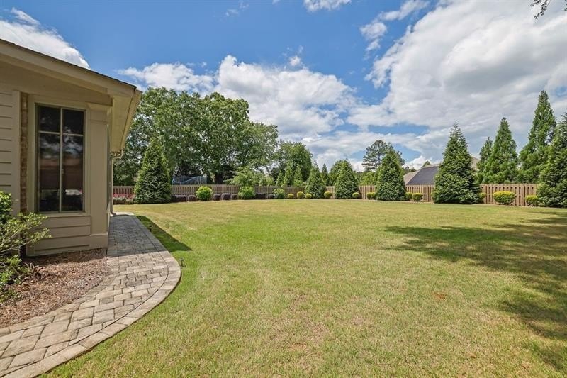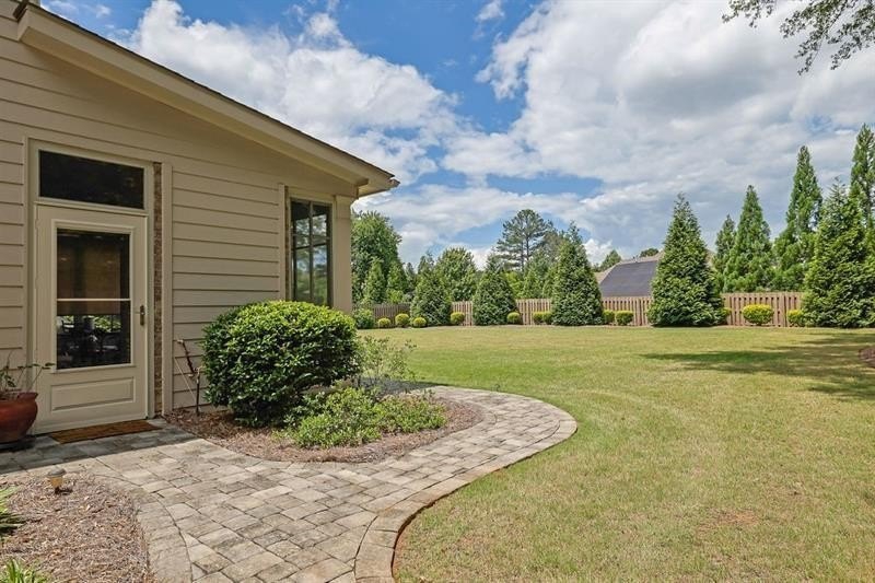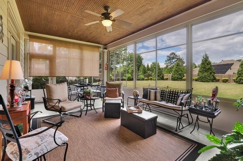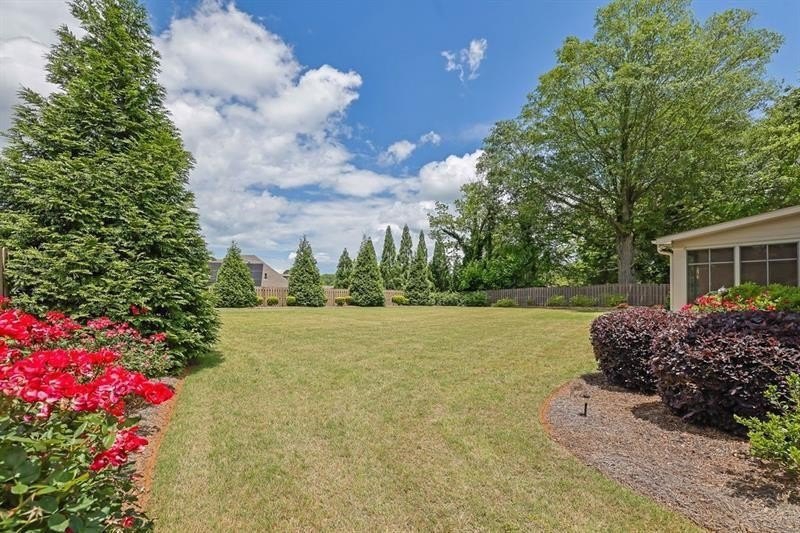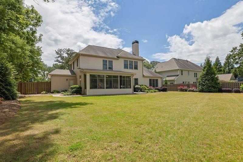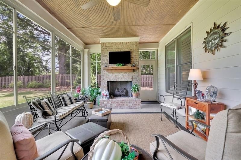 Just off the breakfast room, French doors lead you to the show-stopping four-seasons room, featuring its own outdoor gas fireplace. It’s the ideal spot to sip coffee or host friends while overlooking one of the most spacious and level backyards in all of East Cobb.