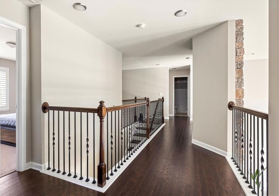 in, creating a bright and welcoming atmosphere. Gleaming hardwood floors run throughout the main level, upper hallway, and the serene