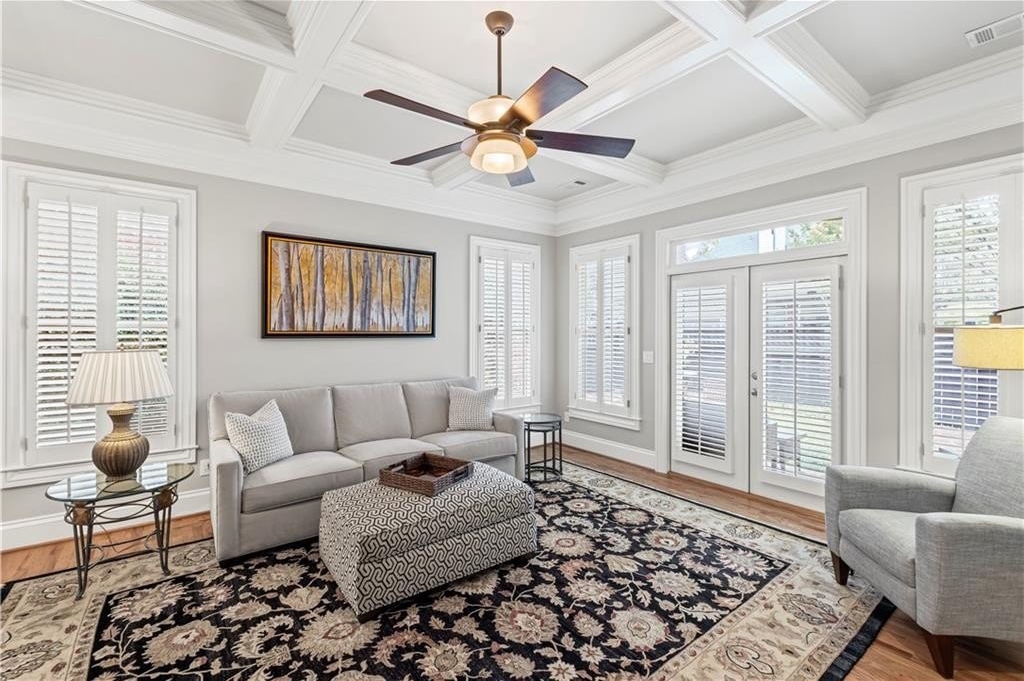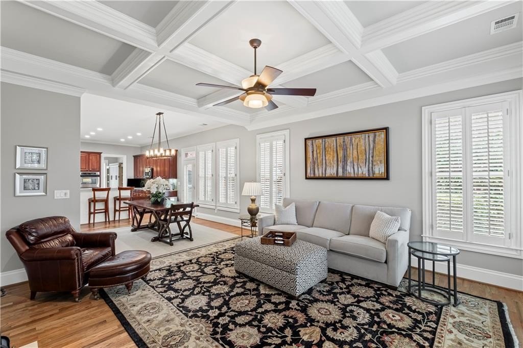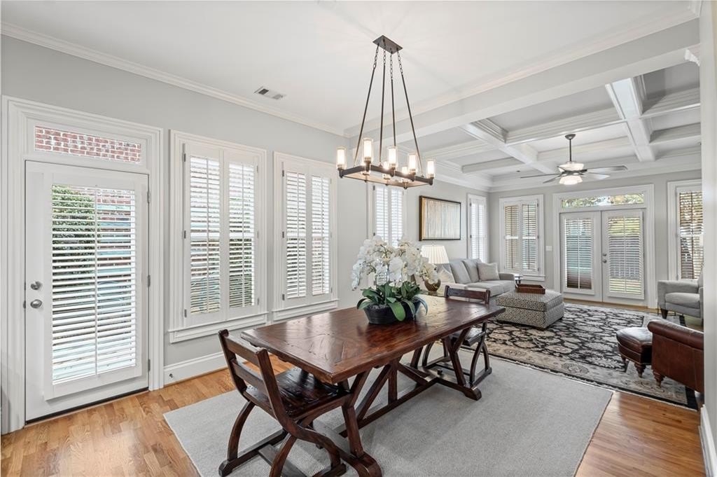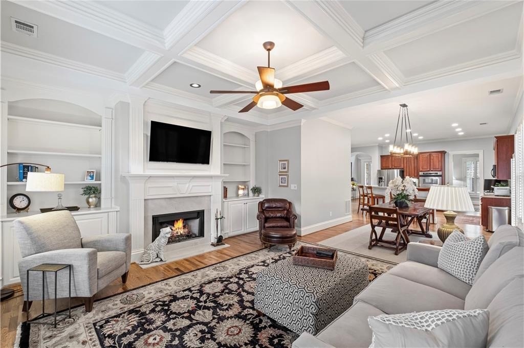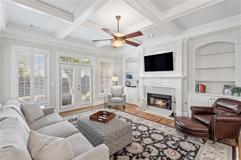 Stunning Home in Prime Alpharetta Location! Welcome to this beautifully appointed home that blends timeless elegance with modern comfort nestled in a private neighborhood just minutes from all Alpharetta has to offer. Step through the elegant foyer into a light-filled space featuring recently refinished hardwood floors, a formal dining room that can double as a home office, and a spacious living room with a gas fireplace, custom built-ins, and a striking coffered panel ceiling. The heart of the home is the expansive kitchen, complete with rich wood cabinetry, ample counter space, a large island with seating for five and a cozy breakfast area perfect for informal dining or entertaining. French doors lead to a private covered patio and backyard, ideal for relaxing.
