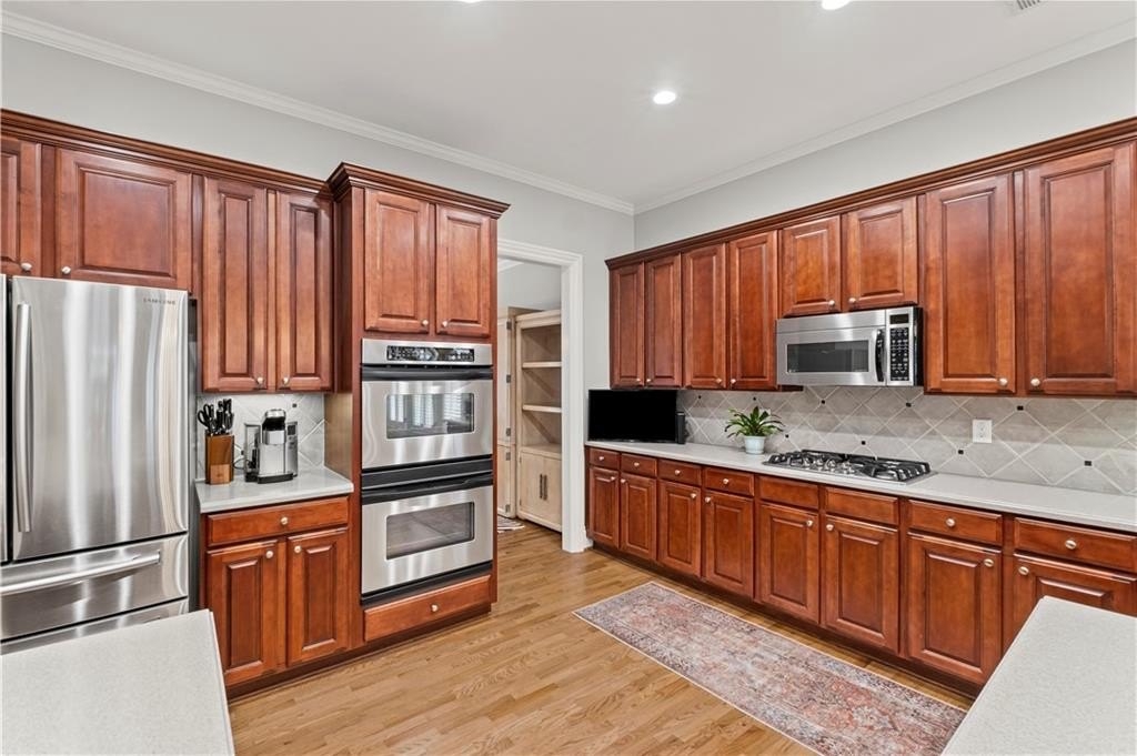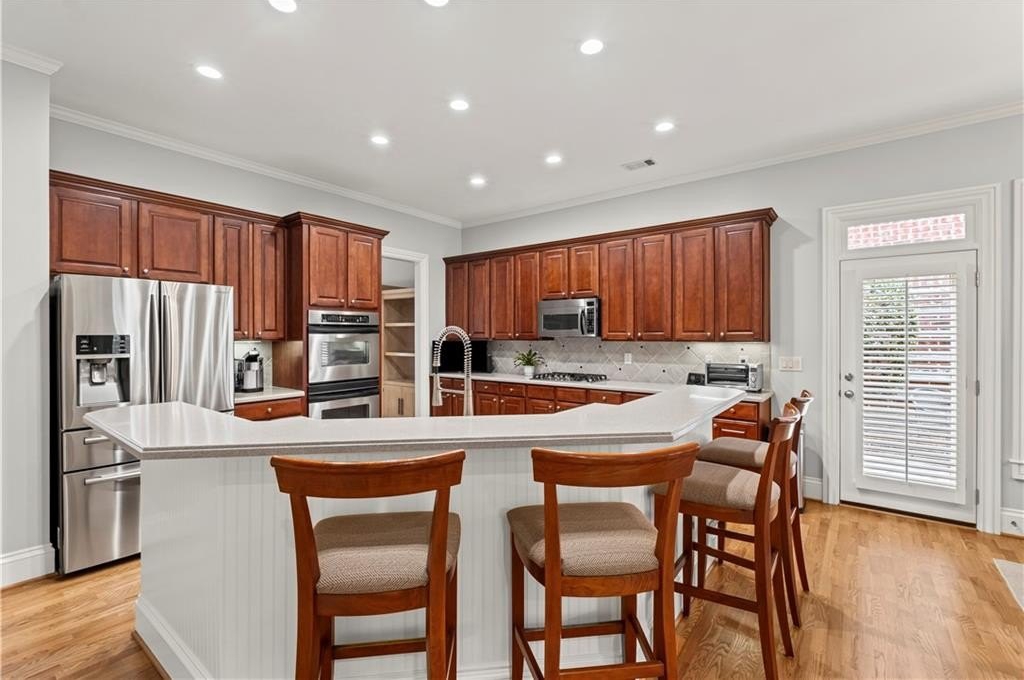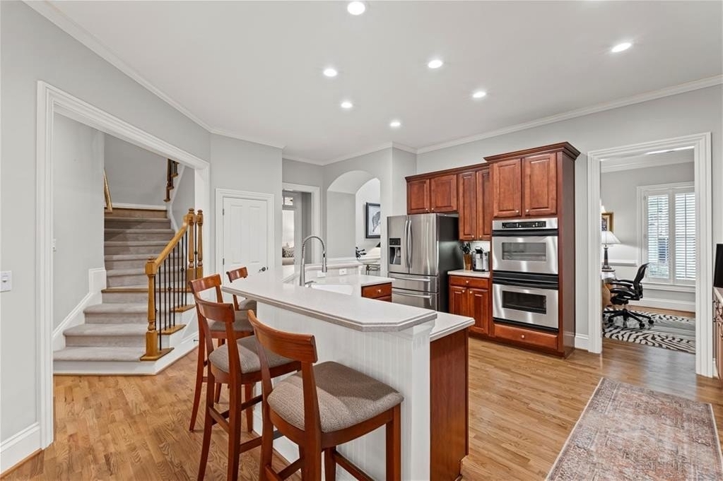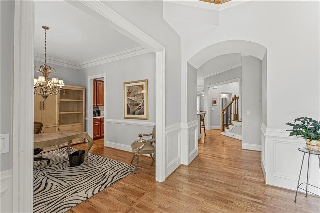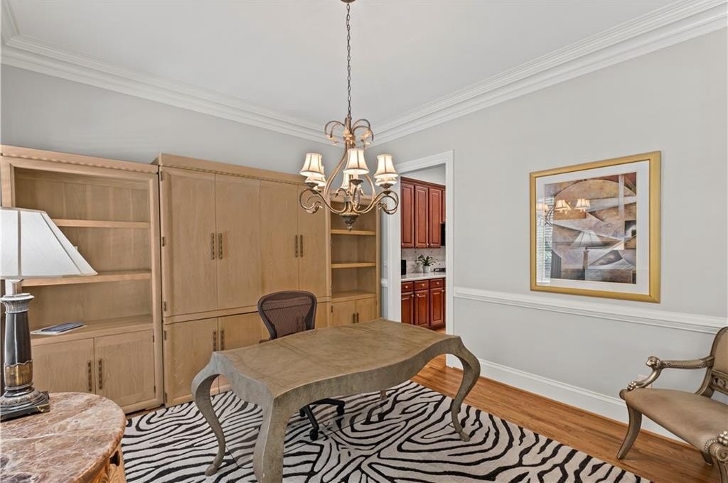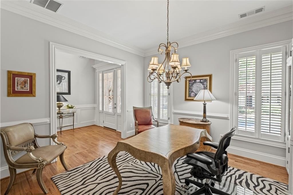 Stunning Home in Prime Alpharetta Location! Welcome to this beautifully appointed home that blends timeless elegance with modern comfort nestled in a private neighborhood just minutes from all Alpharetta has to offer. Step through the elegant foyer into a light-filled space featuring recently refinished hardwood floors, a formal dining room that can double as a home office, and a spacious living room with a gas fireplace, custom built-ins, and a striking coffered panel ceiling. The heart of the home is the expansive kitchen, complete with rich wood cabinetry, ample counter space, a large island with seating for five and a cozy breakfast area perfect for informal dining or entertaining. French doors lead to a private covered patio and backyard, ideal for relaxing.