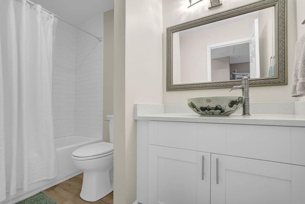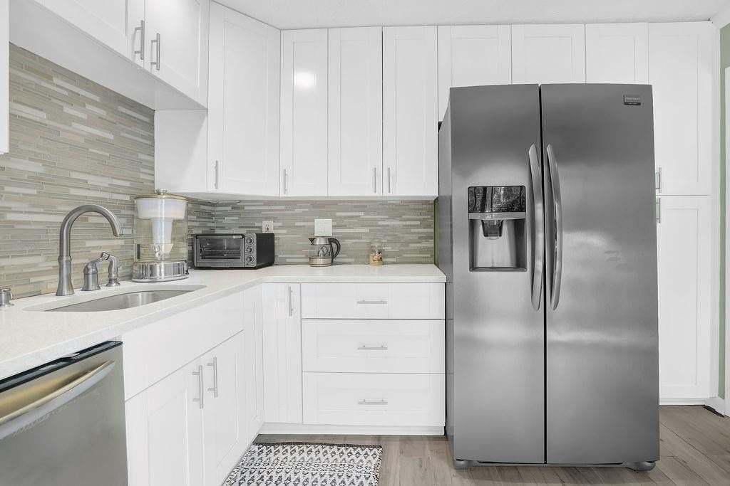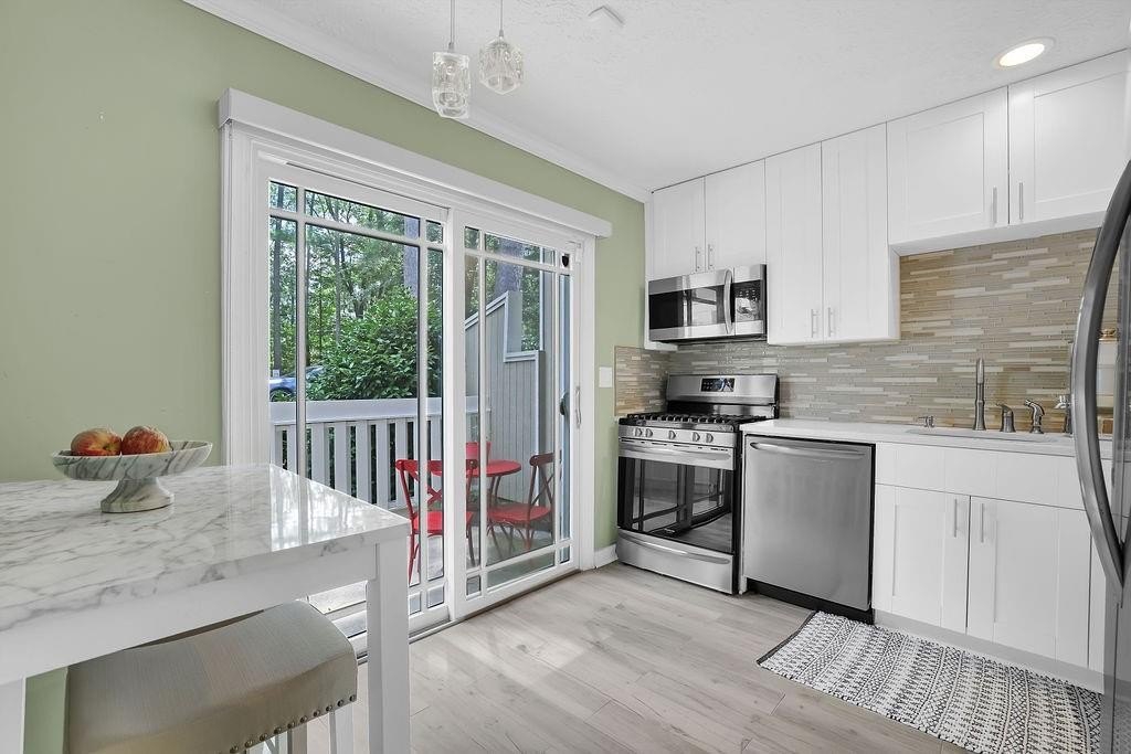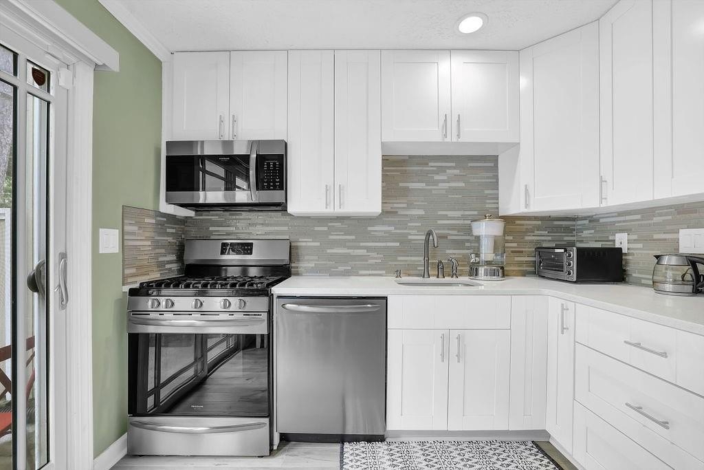 As you enter, you'll be greeted by an open-concept layout filled with natural light, showcasing gleaming hardwood floors, high ceilings, and elegant designer details throughout. The spacious living and dining areas are anchored by a cozy fireplace, creating an ideal setting for both relaxation and entertaining. The renovated kitchen is a true highlight, featuring granite countertops, stainless steel appliances, a custom tile backsplash, and sleek white cabinetry—combining beauty and functionality.