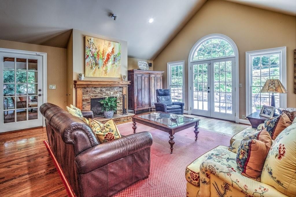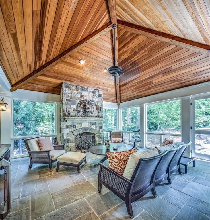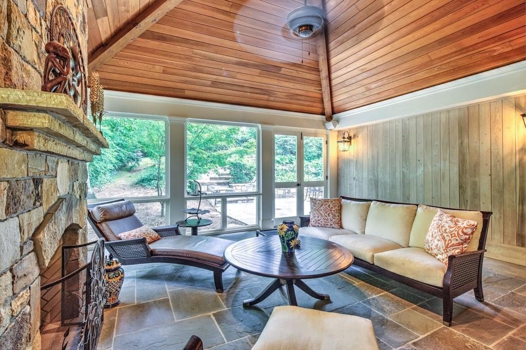 The main level boasts a bright and spacious layout ideal for everyday living and entertaining. You’ll find a formal living and dining room, a large eat-in kitchen that opens to a stunning family room with oversized windows, a mudroom, and office that could easily serve as a third main-level bedroom or playroom. Two bedrooms are also located on the main floor, offering the convenience of one-level living for young children or guests. Step outside to a magazine-worthy screened-in porch with a grand stone fireplace, gorgeous wood ceilings, and bluestone floors — perfect for year-round entertaining or relaxing with the family.
