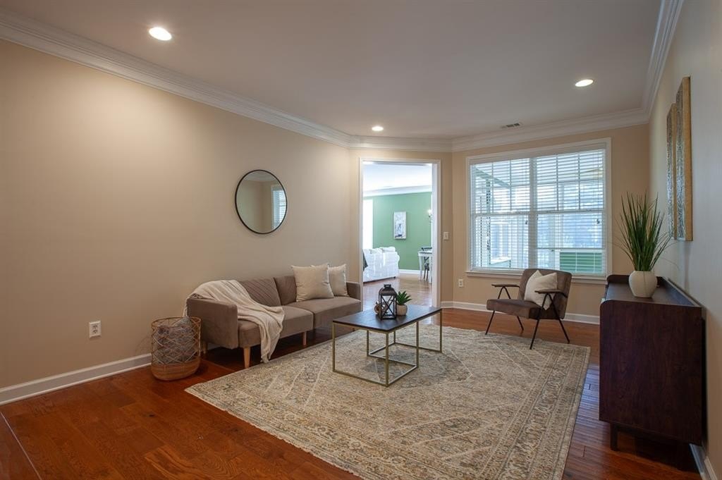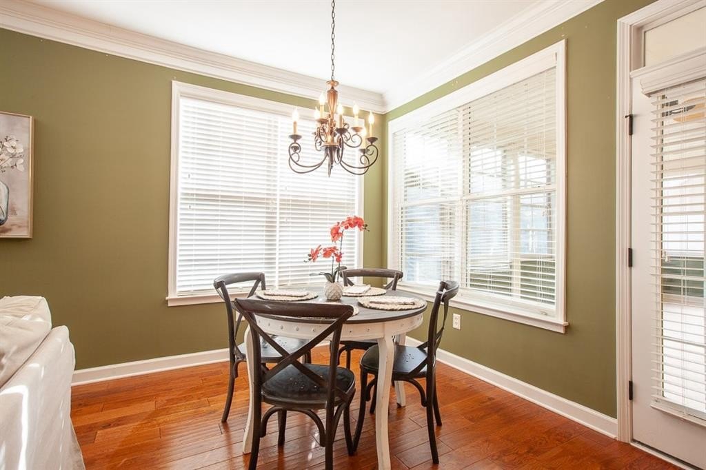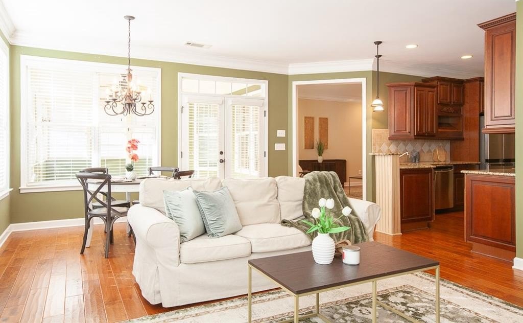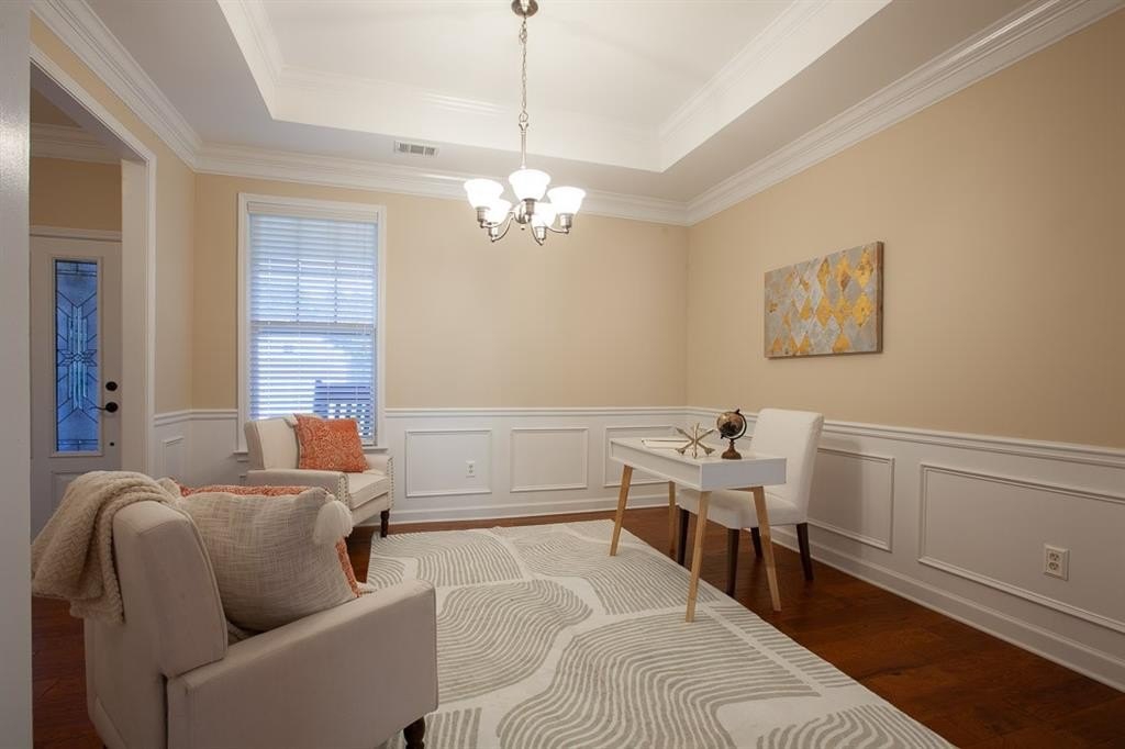 Welcome to the prestigious 55+ community of Cresswind at Lake Lanier. Nestled within a tranquil cul-de-sac, this Daylily model exemplifies meticulous ownership with hardwood flooring showcased throughout the main living spaces, plush carpeting in the bedrooms, and elegant double crown molding. The entrance features a leaded glass door leading into a refined foyer adorned with wainscoting and crown molding. The dining room is distinguished by detailed wainscoting and a dramatic tray ceiling, accommodating seating for twelve or more; this space can also be adapted as a sophisticated home office. A formal living room provides an additional separate gathering area.