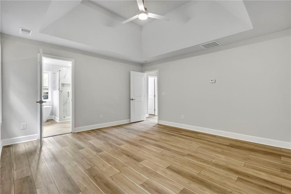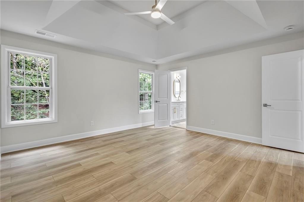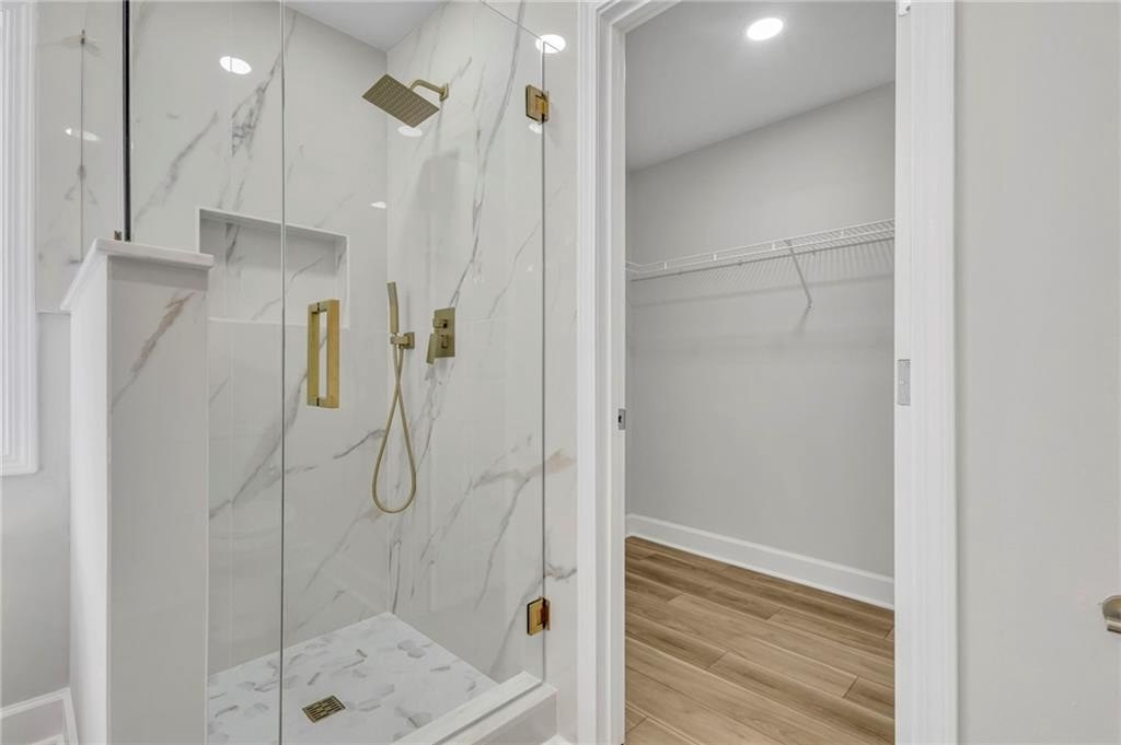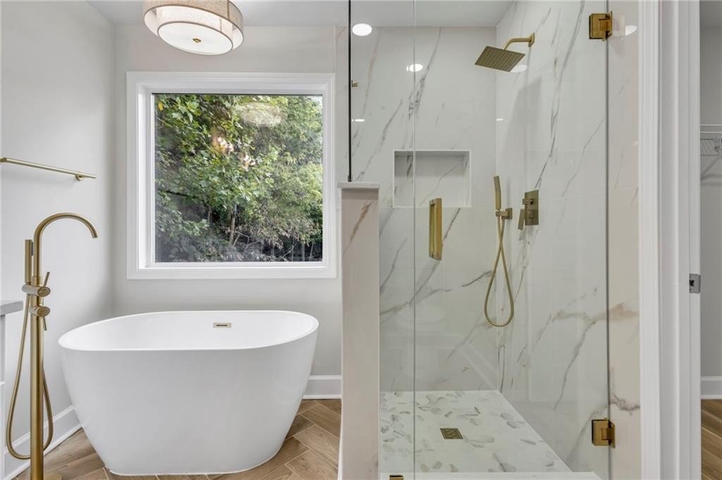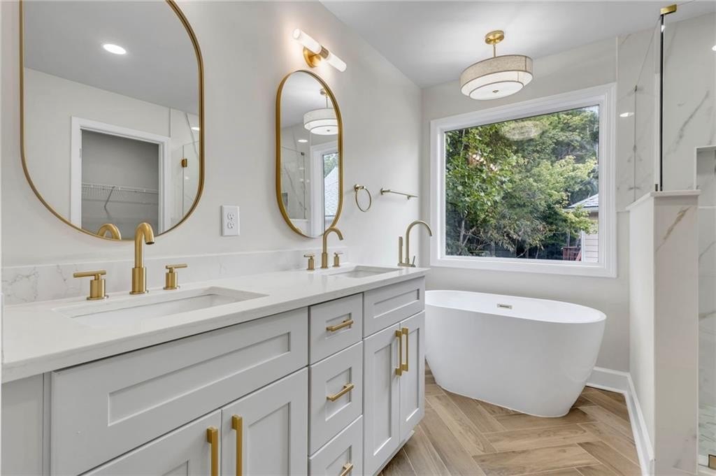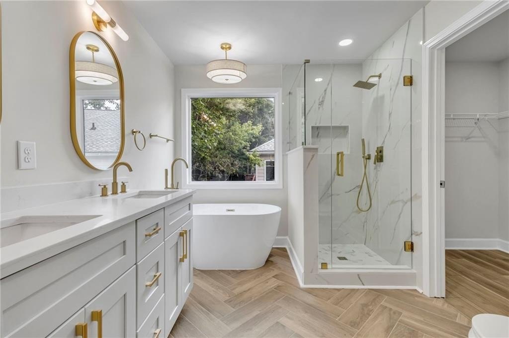 Retreat to the spa-inspired master suite, where you'll find herringbone tile floors, a soaking tub, custom gold fixtures, a walk-in closet, and a designer standing shower—all creating a peaceful, luxurious escape.