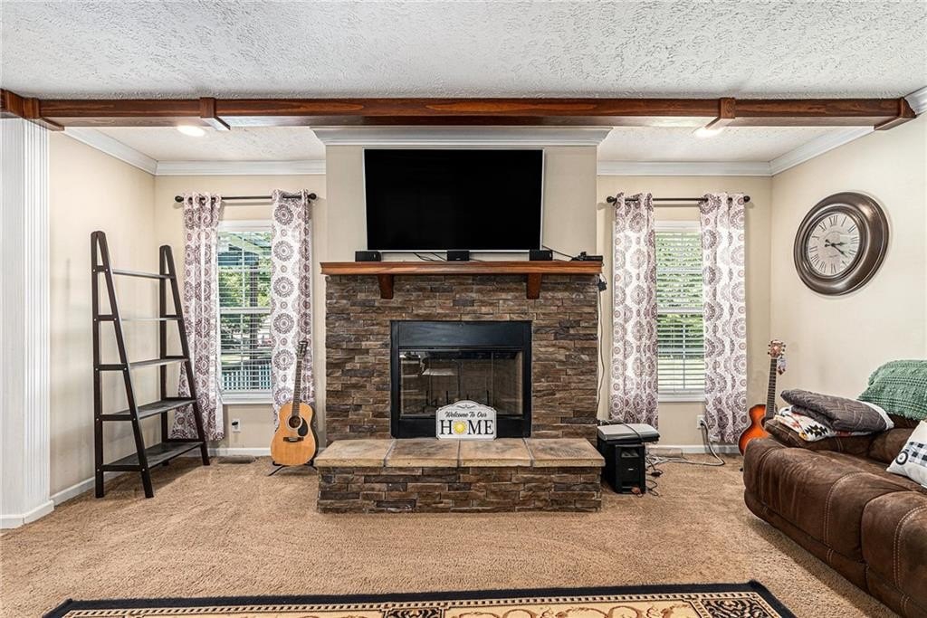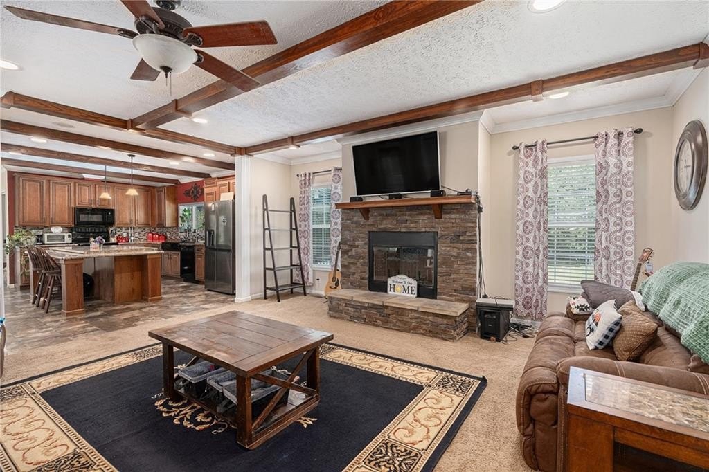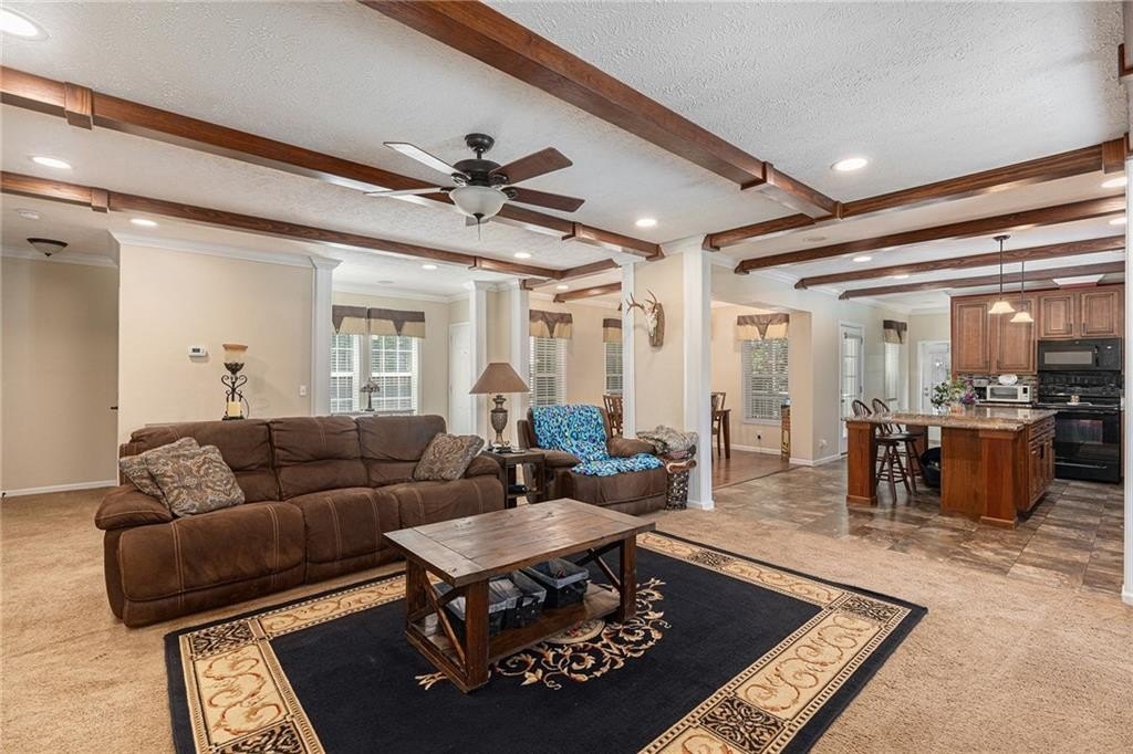 beams throughout, an entrance with a foyer, and a front porch that wraps around the left side of the