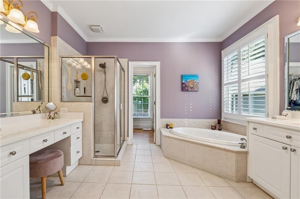 The primary suite on the main level is a true retreat—complete with a walk-in closet and a spa-like ensuite bath offering dual vanities, a soaking tub, and separate shower. Upstairs, you’ll find four generously sized bedrooms and two full baths, offering flexibility for guests, home offices, or hobbies.