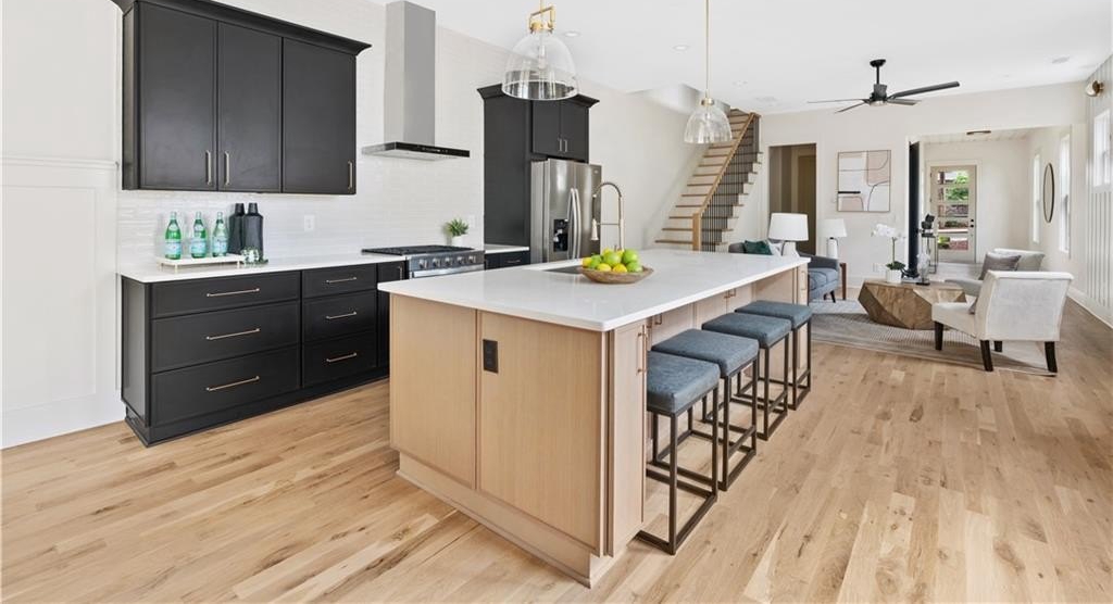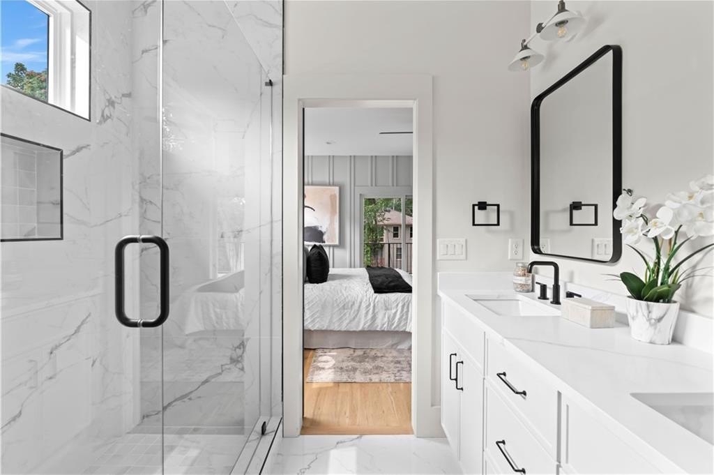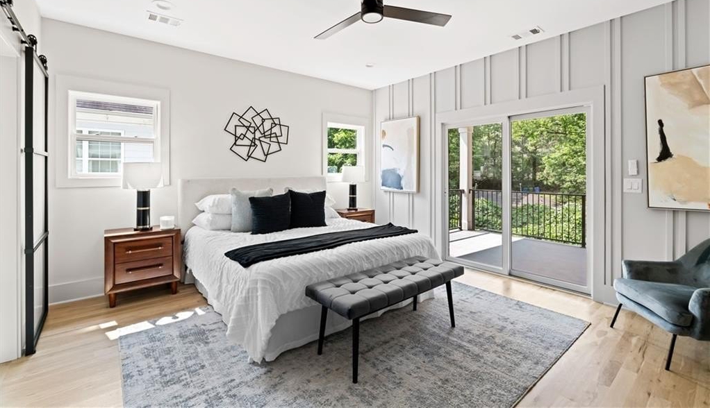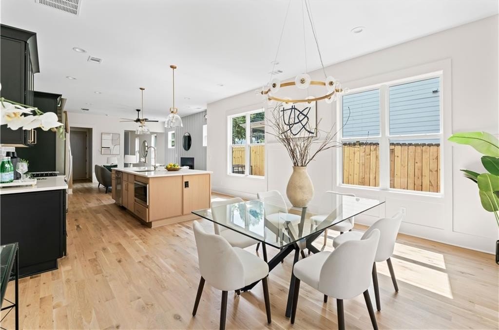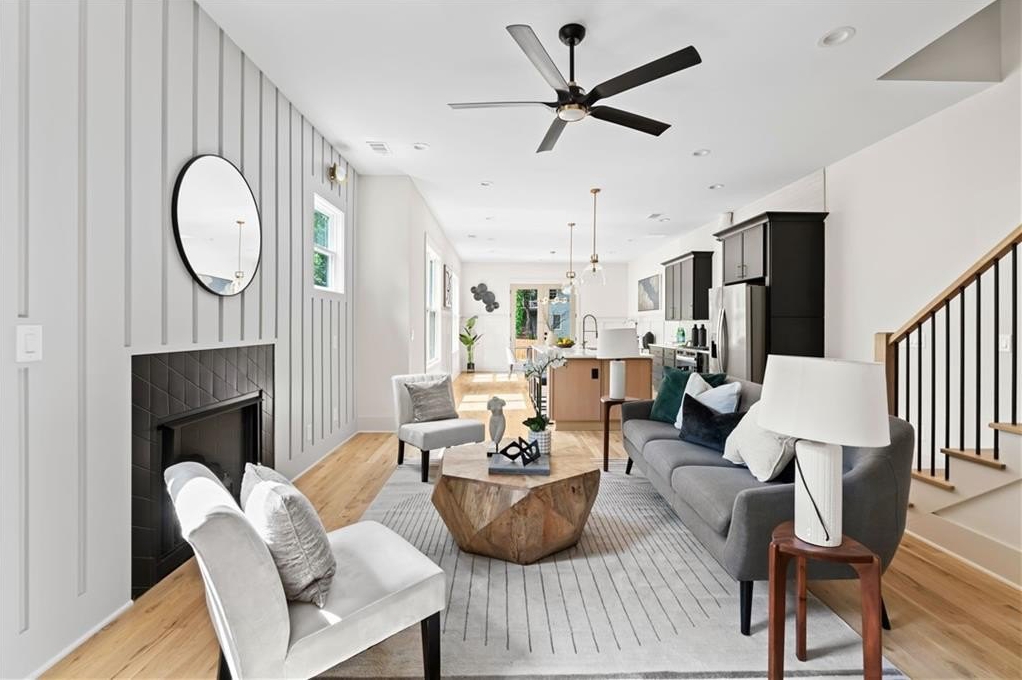 Elegant new construction with a private fenced yard, at a hard-to-find price point. Enter the wide front foyer to soaring 10-foot ceilings and stunning finishes in this well-designed townhouse. The open floorplan boasts accent walls, custom lighting and plumbing fixtures, and natural hardwood floors. Don't miss the upgraded "thin" shaker cabinets and oversized quartz island in this impressive kitchen. Separate, but open, dining area flows seamlessly to the back patio and the ample backyard! The open living room is anchored by a cozy fireplace with quartz surround. Main level also features a stylish half bath, mudroom with built-ins, and attached garage, with 240-volt plug-in for electric vehicles. Upstairs you will be wowed by the bonus loft living area, three bedrooms and two more bathrooms. The primary suite will not disappoint - accent walls, sunny bath with dual vanity, dual shower heads and upgraded finishes, and a large private porch with treetop views so peaceful you might forget you're minutes from the Beltline, Madison Yards, Edgewood Retail District, Ponce City Market, and much more. Intown living at its finest!