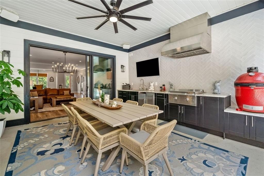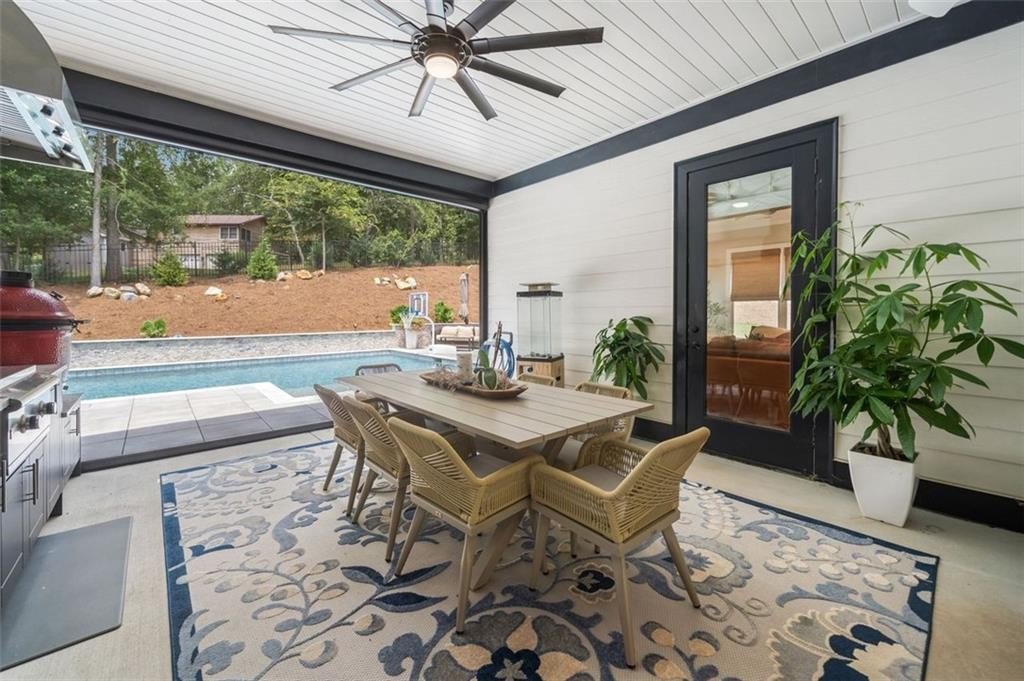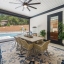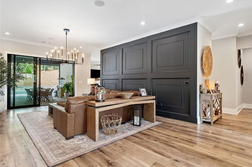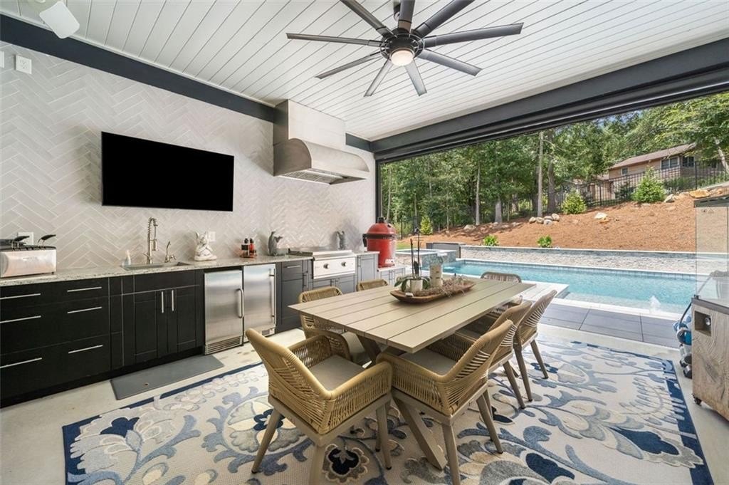 From the moment you walk through the front door, you're greeted by a stunning open living area framed by a dramatic wall of sliding glass doors that offer a direct view of the outdoor kitchen and resort-style pool. These wide-opening doors blur the line between indoor comfort and outdoor entertaining, creating a seamless, light-filled space that feels like a private retreat.