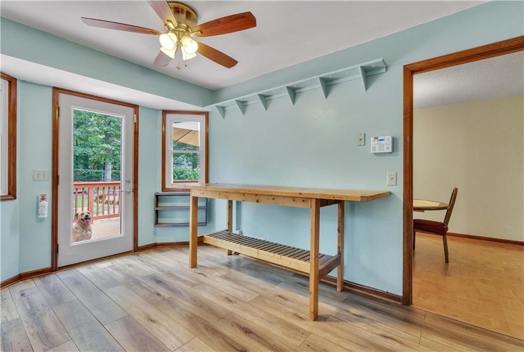 Seller is offering a Choice Ultimate One Year Home Warranty with accepted contract! Come discover this lovely, contemporary retreat in an unbeatable location: 1797 Kelvin Drive is a unique raised ranch in the heart of Gwinnett County. This desirable neighborhood is located just minutes from I-85, GA-316, the Mall of Georgia, The Exchange at Gwinnett, Rock Springs Park, and downtown Lawrenceville's shops, restaurants, and cultural venues. Inside, you will enjoy the vaulted family room with its charming stone fireplace, parquet hardwoods, and custom built-ins. The kitchen features abundant and freshly painted cabinetry, newer stainless steel appliances, and a window that frames the view of the lush rear yard. Step out to the private deck and experience the peace of your own backyard oasis. The spacious primary suite includes a private bath and a separate dressing area, while two additional bedrooms share a freshly painted hall bath. Downstairs, the partially-finished basement provides ample storage, a large laundry room, and flexible living space with a broadcast-quality recording studio. This incredible feature is a 6x9 pro isolation booth finished with panels of Owens-Corning 703 acoustic fiberglass insulation which was designed by an acoustician. Vocal artists and musicians will appreciate this unique and valuable addition to this wonderful home. The flat, lush yard is truly a hidden gem-fenced and beautifully landscaped with mature trees and expansive greenery that create a sense of serenity. Whether sipping coffee on the deck or gardening in the sun, it provides retreat from the everyday hustle. A large outbuilding adds even more storage for outdoor gear, tools, or weekend projects.