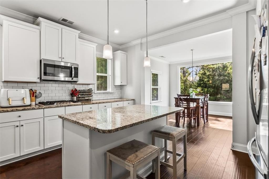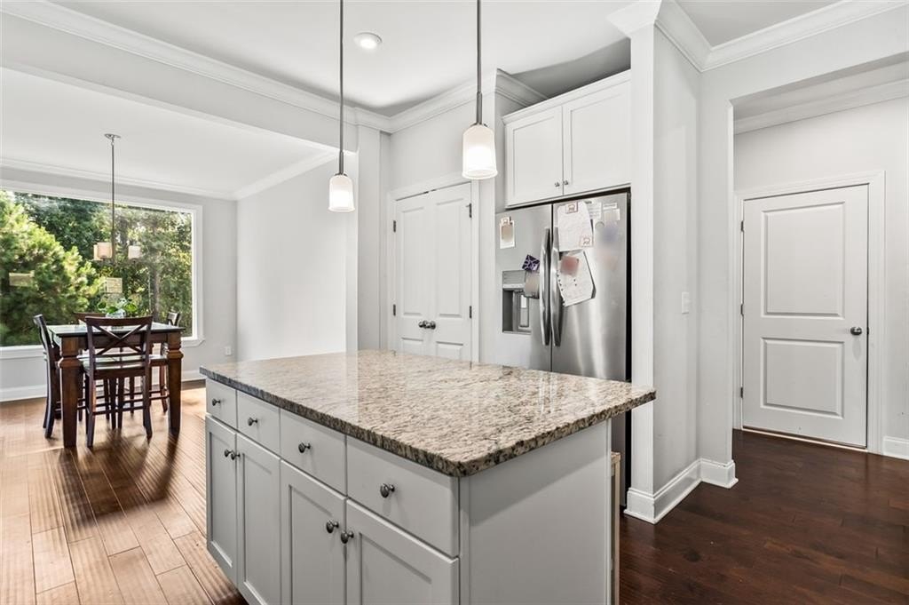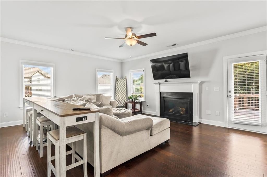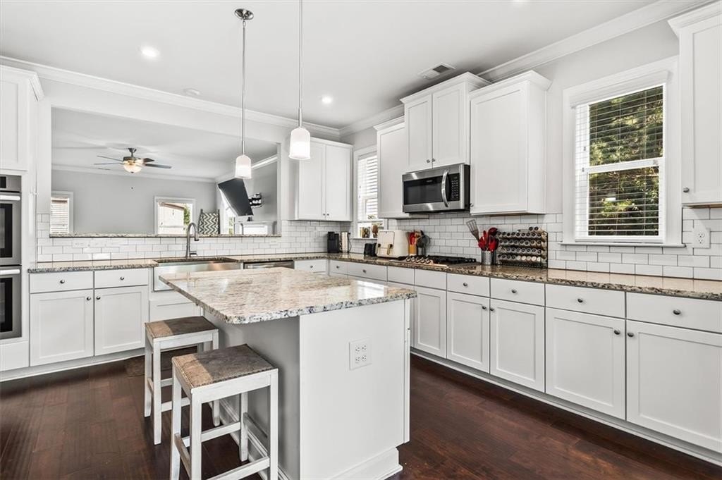 Step inside to discover an impressive foyer, gorgeous hardwood floors, and abundant natural light throughout. The open-concept chef’s kitchen features premium appliances, granite countertops, custom cabinetry, and an expansive center island, seamlessly flowing into a spacious family room with a cozy fireplace.