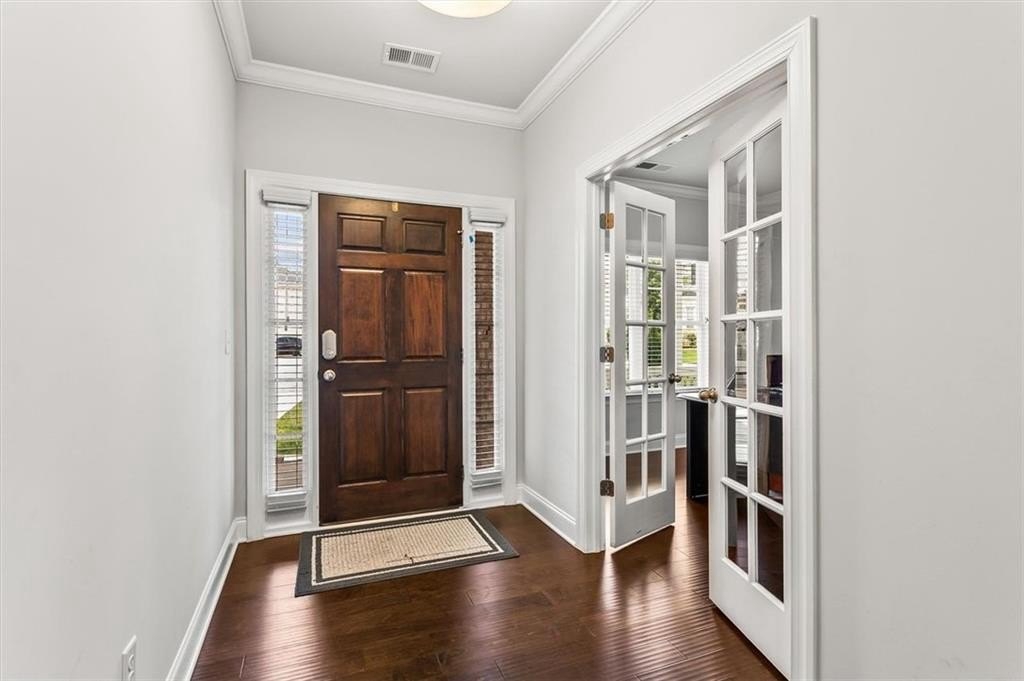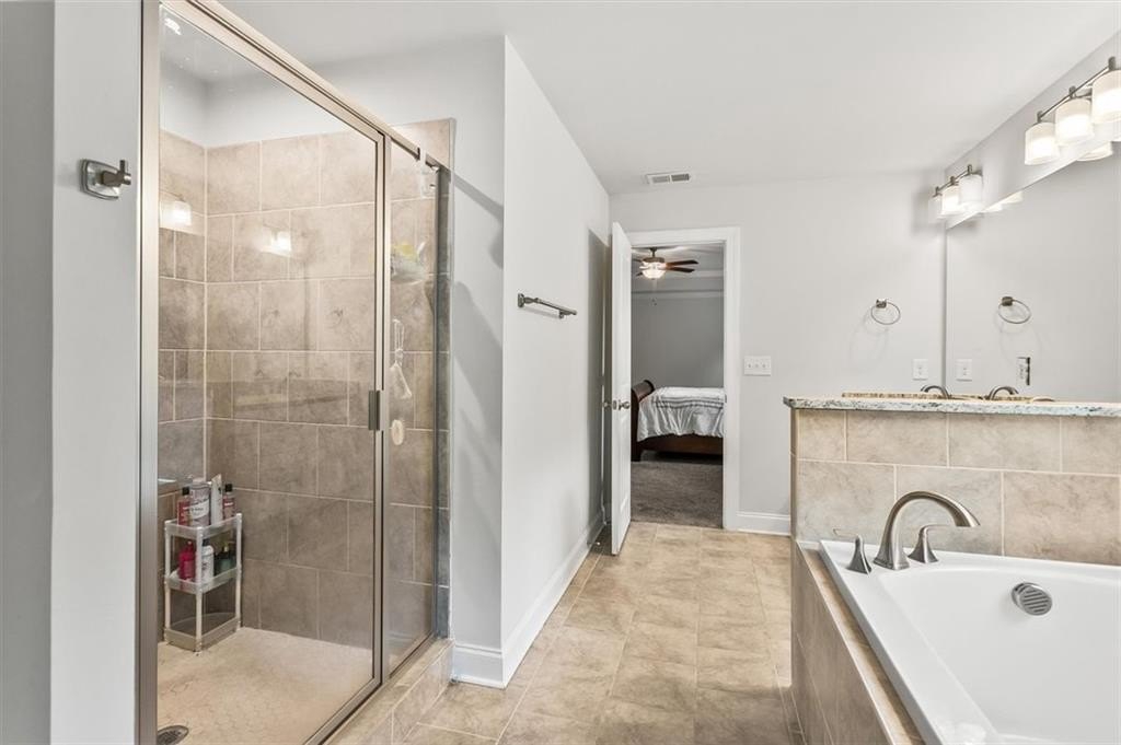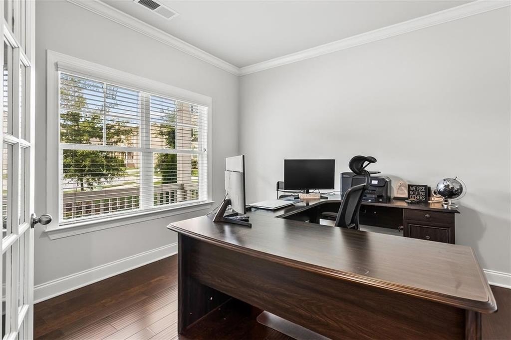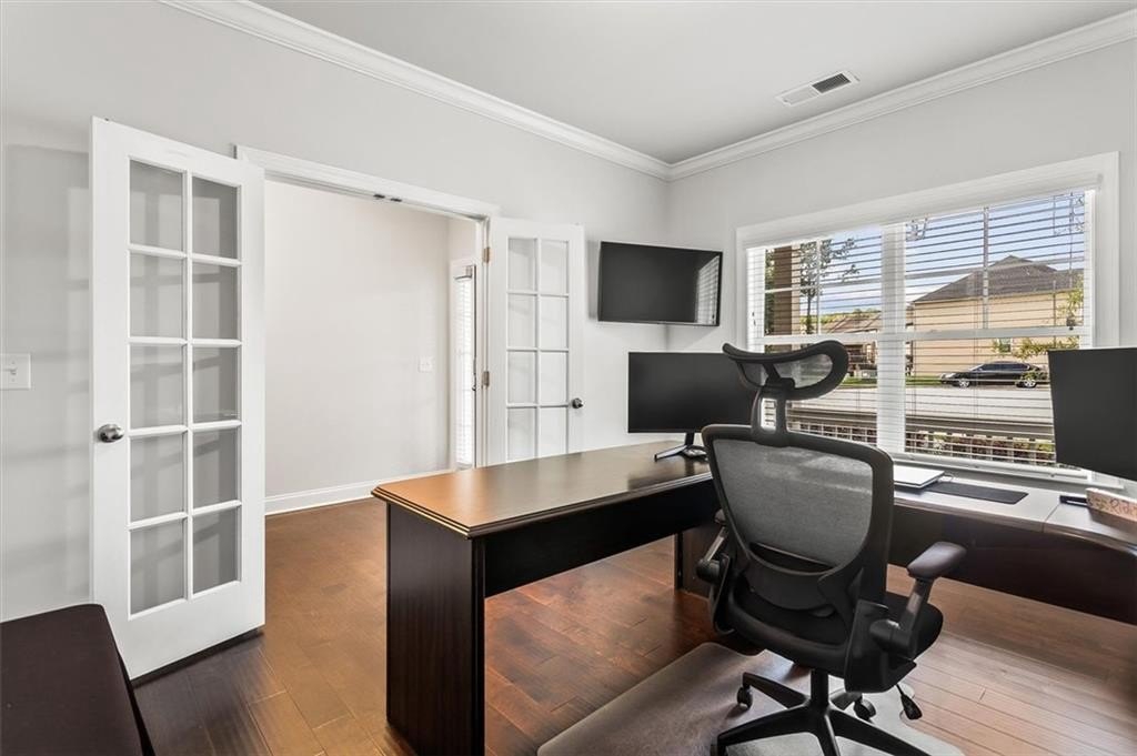 The luxurious primary suite upstairs is a private retreat, offering a spacious sitting area, walk-in closet, and spa-like bath complete with dual vanities, a soaking tub, and a separate shower. Each additional bedroom is generously sized, offering flexibility for guests, home offices, or a growing family. A conveniently located office with french doors on the main level adds to this home's thoughtful design.