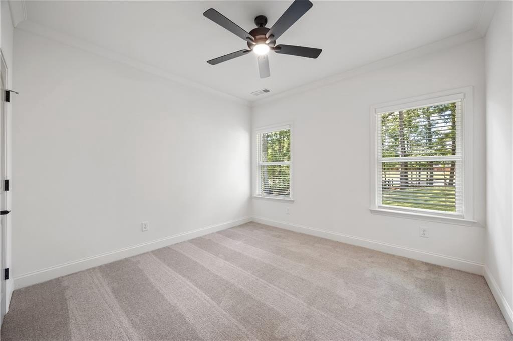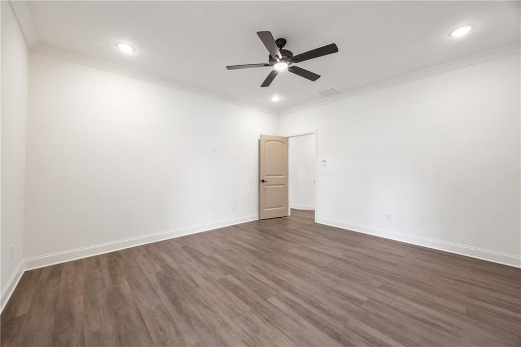 The primary suite is a true retreat, featuring a spacious layout, walk-in closet, and a luxurious en-suite bath with dual vanities and elegant finishes. Three additional bedrooms offer flexibility for family, guests, or a home office — all with ample closet space and one having its own bathroom and the others having easy access to the third full bathroom.