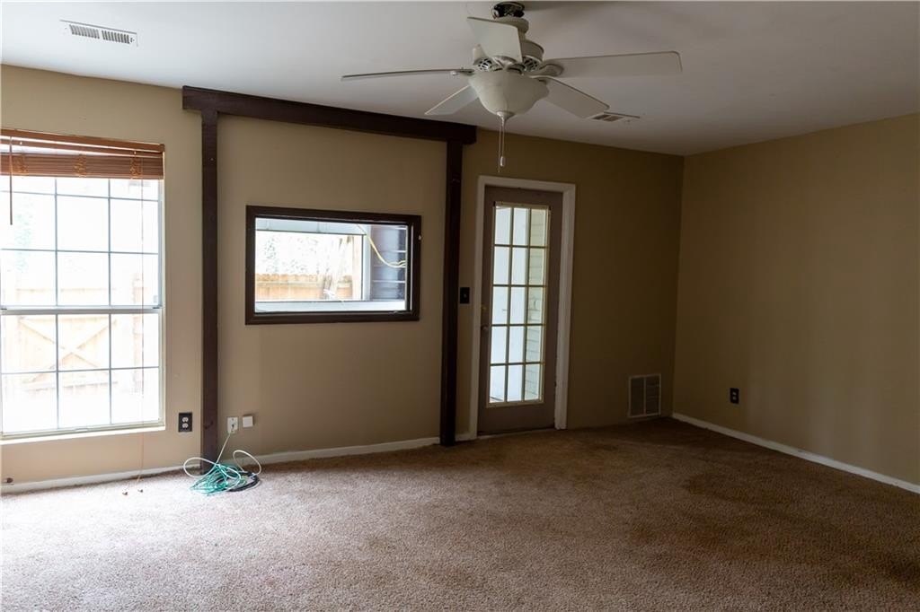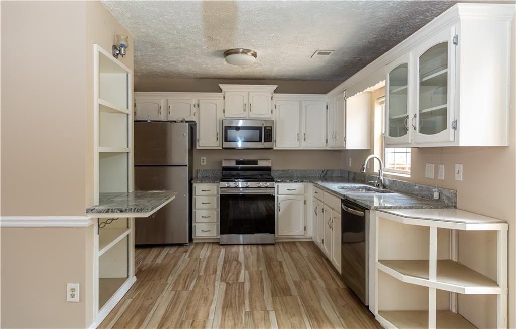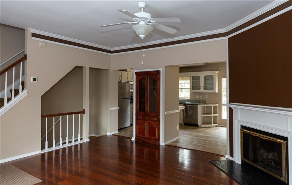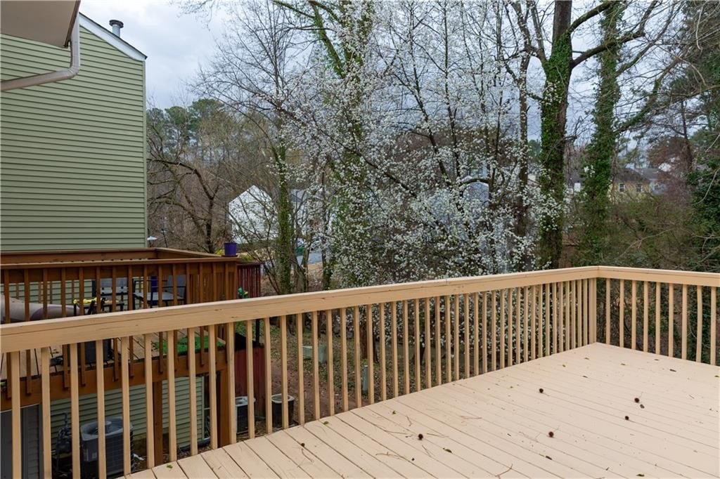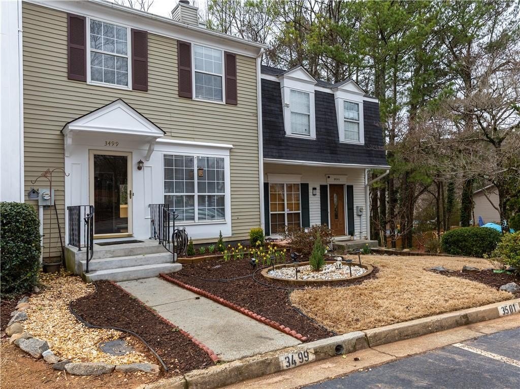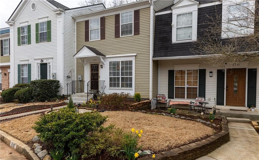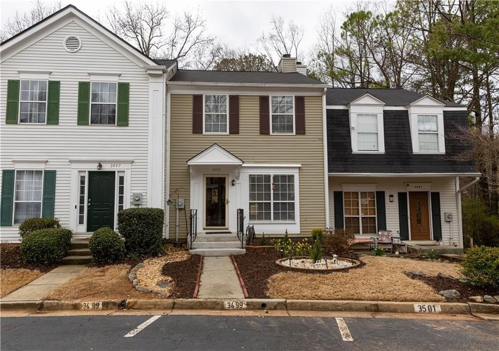 Welcome to this beautifully updated townhome located in the sought-after Washington Square gated community! As you step inside, you'll be greeted by a spacious living room featuring warm hardwood floors and a cozy fireplace, perfect for relaxing or entertaining. The open kitchen is a standout with sleek stone countertops, white cabinets, and stainless steel appliances-including a refrigerator with icemaker, stove, microwave, and dishwasher. There's also a comfortable eat-in dining area, and from the kitchen, you can step right out onto a lovely wood deck that overlooks a peaceful creek and tree-lined view-an ideal spot for morning coffee or unwinding in the evening. Upstairs, you'll find two generously sized bedrooms, each with its own private ensuite bathroom and ample closet space. The lower level offers a third bedroom, a half bath, and a bright sunroom that opens to a fenced outdoor area for added privacy. The home is surrounded by thoughtful landscaping and includes an irrigation system in the front yard for easy maintenance. Additional perks include two assigned parking spaces, access to the community pool, and HOA coverage for water, sewer, and trash. You'll love being part of a friendly neighborhood just steps from Graves Park, a 70-acre public space with walking trails, tennis and volleyball courts, a dog park, and a playground. This home truly has it all-style, space, and a prime location.