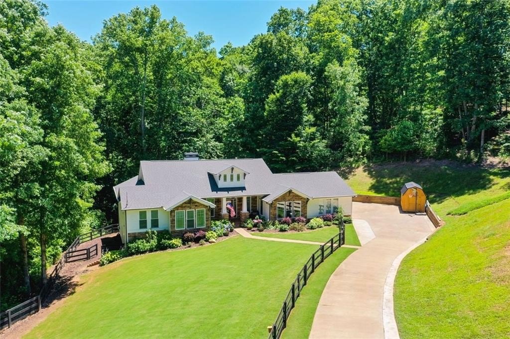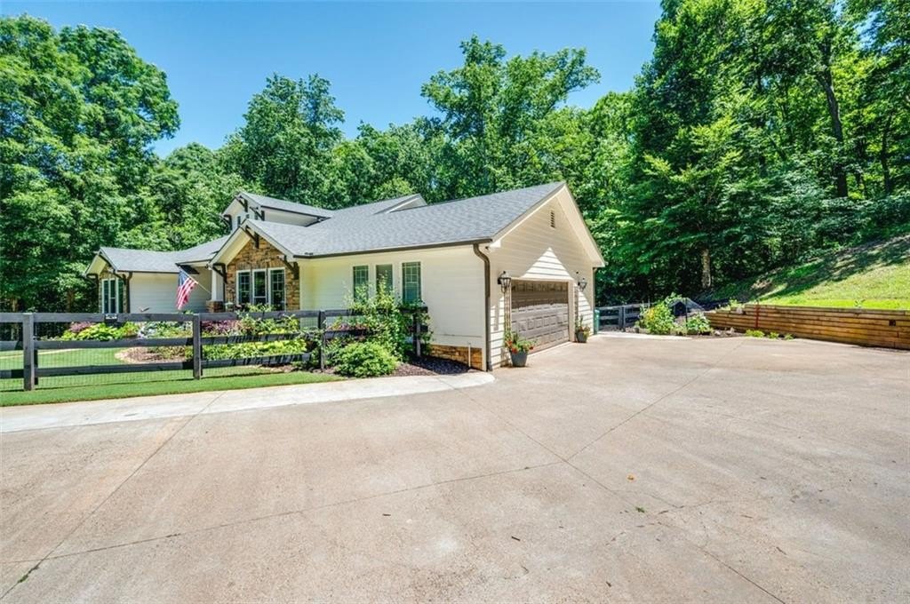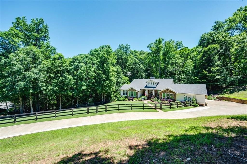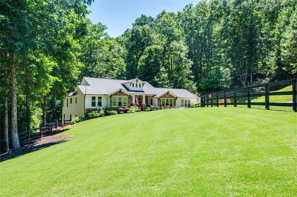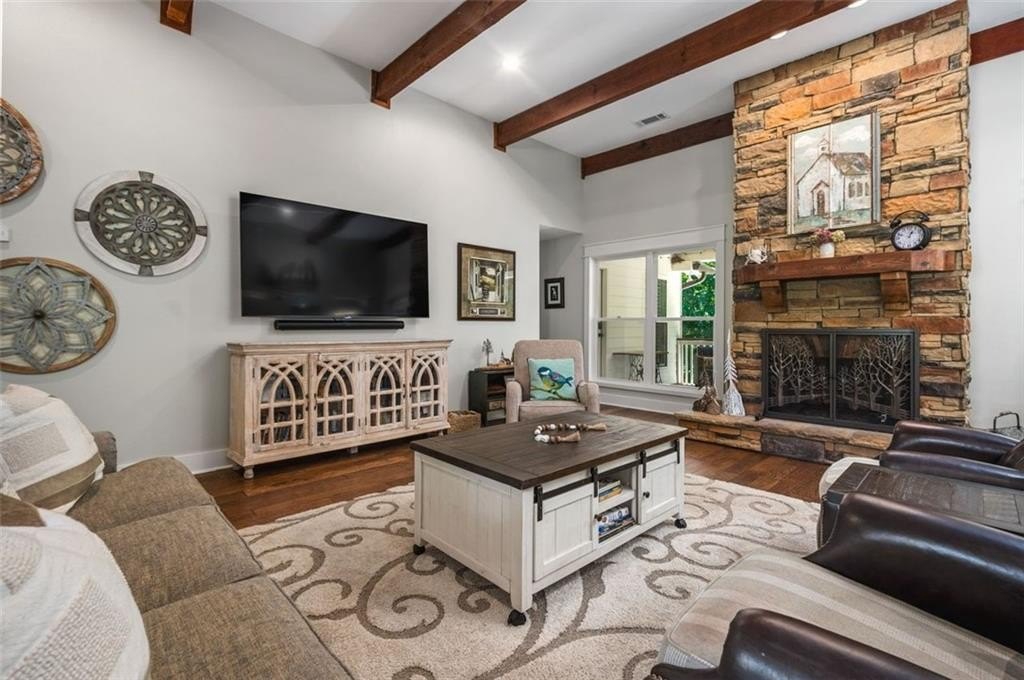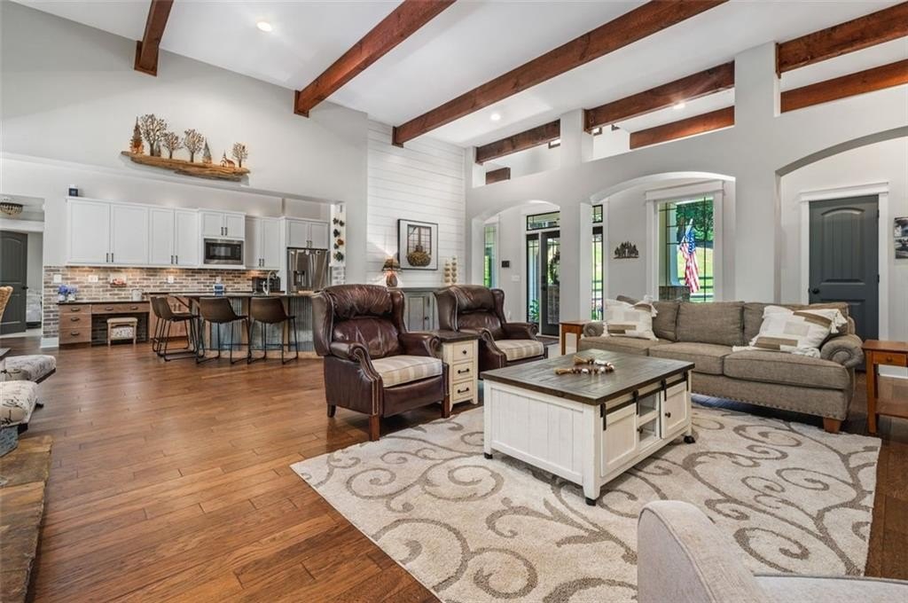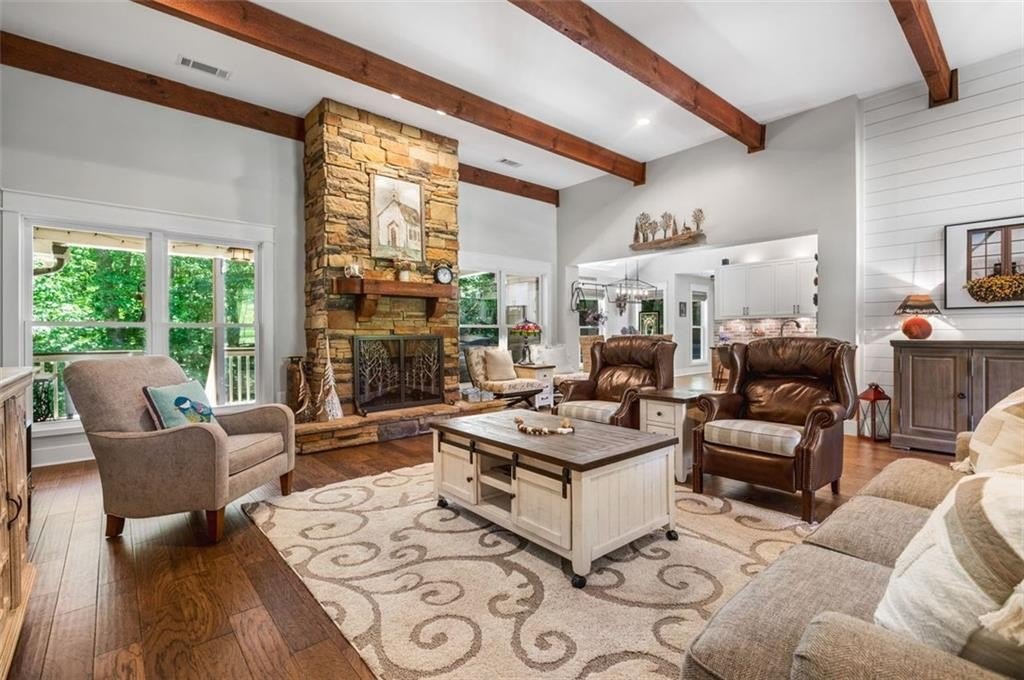 This Dreamy Ranch is Tucked away on a quiet, wooded lot, this Custom Ranch isn’t just a home—it’s a lifestyle. Picture yourself sipping morning coffee as deer wander through 2+ peaceful acres, the soft rustle of leaves replacing the noise of the city. Here, you’ll find the perfect balance of nature, luxury, and convenience—just minutes from Thriving Canton’s best shopping and dining, and top-rated Cherokee County schools. Inside, over 5,000 square feet of beautifully renovated living space blends rustic charm with modern elegance. Soaring beamed ceilings and a dramatic floor-to-ceiling stone fireplace set the tone, while fresh designer-selected finishes and newly painted interiors make every room feel warm and inviting.