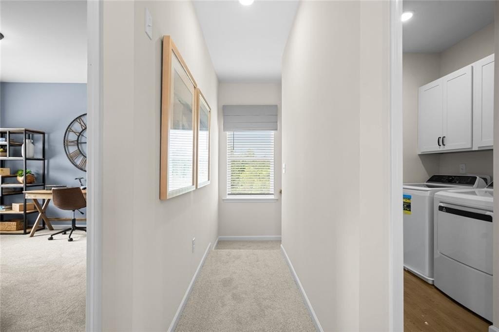 Move-In Ready January 2026! The Braselton II plan in Sanders Park by Smith Douglas Homes on an unfinished basement is now available in-a sought-after new home community in Austell, GA offering future resort-style amenities including a neighborhood pool. This thoughtfully designed home combines flexible living with modern style and energy efficiency. The open-concept main level features durable vinyl plank flooring throughout, a spacious family room with a linear fireplace, and a bright eat-in kitchen with direct access to a corner rear covered patio-perfect for entertaining. The kitchen showcases Quartz countertops, a central island with pendant lighting, upgraded stainless steel appliances, tile backsplash, and 42" upper cabinets for plenty of storage. Added windows in the breakfast area, family room, and stair landing fill the home with natural light. Upstairs, a versatile loft separates the primary suite from the two secondary bedrooms, providing privacy and flexibility. The tray ceiling adds spaciousness to the room. The luxurious primary bath includes a double vanity, separate shower and a garden tub with picture window above, black finishes, and marble countertops. The laundry room is conveniently located on the second floor near all bedrooms. Additional highlights include 9-foot ceilings on both levels, an open iron railing staircase, a 3/4 glass front door, and a large unfinished basement offering endless possibilities for future expansion. Photos are representative of the plan and not the actual home. Seller incentives available with the use of our preferred lender.