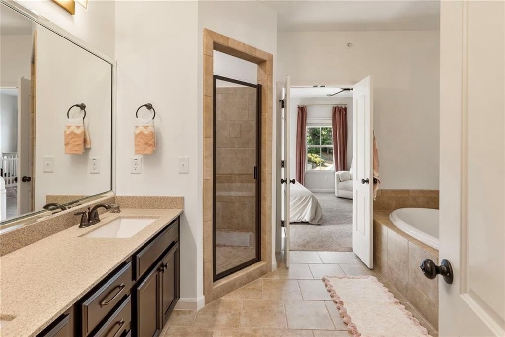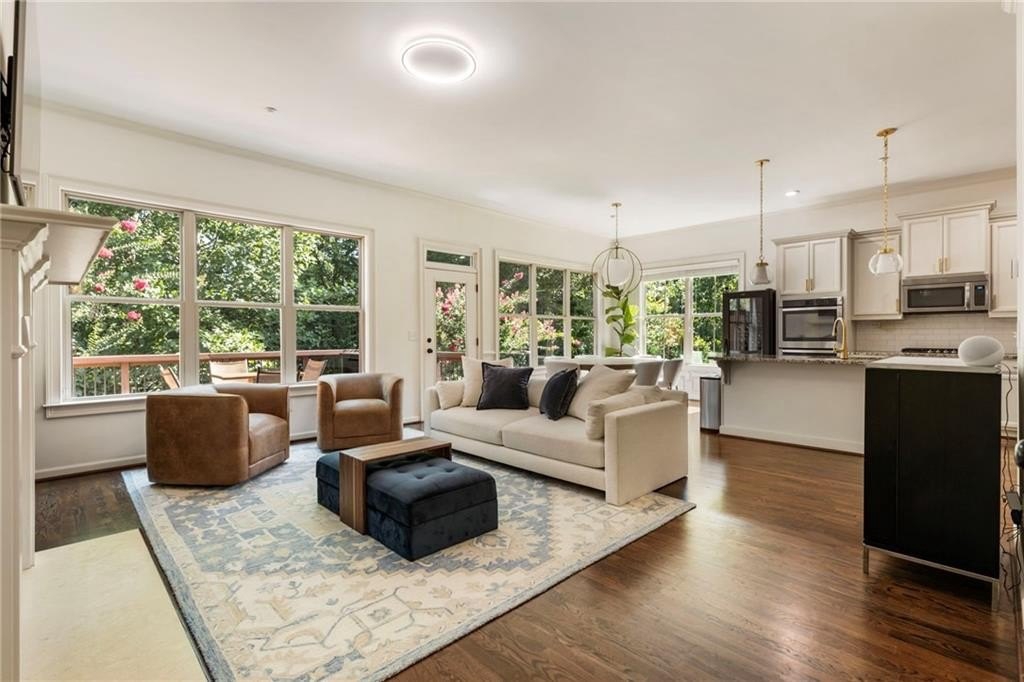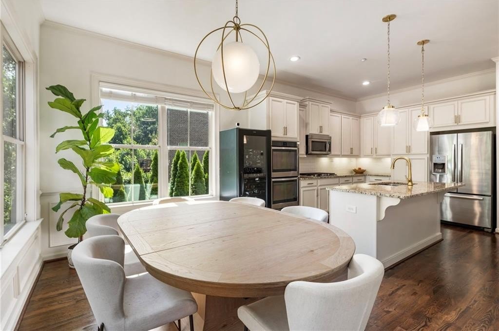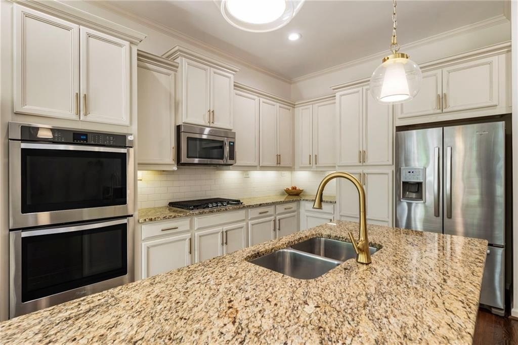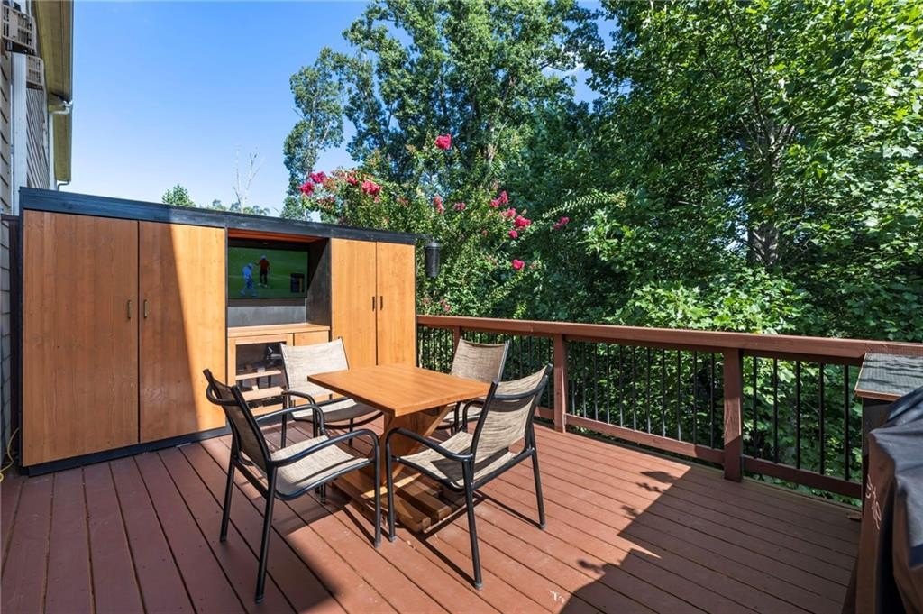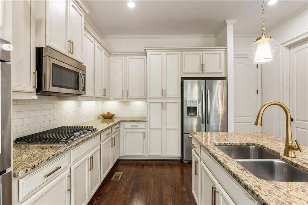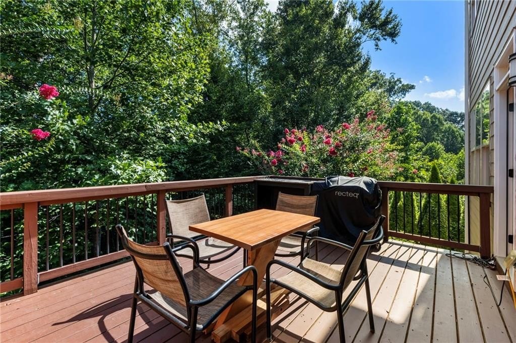 Beautiful End-Unit Townhome with Modern Upgrades and Exceptional Natural Light. This bright and spacious end-unit townhome offers garage parking conveniently located on the main living level and boasts a serene natural backyard view. With abundant windows throughout, this home is filled with natural light and features hardwood floors across the main level. The chef’s kitchen is equipped with a gas cooktop, double ovens, generous cabinetry, and an island with storage and room for addiitaonl seating making it ideal for cooking and entertaining. Step outside to a newly built (2025) entertainer’s dream deck with a built-in media cabinet. Upstairs, the primary suite features a large spa-style bathroom with a separate soaking tub and shower, dual vanities, and a walk-in closet with custom built-ins. A second upstairs bedroom includes its own ensuite bath and walk-in closet, also with custom shelving. The upper level also includes a laundry room with custom cabinetry. The fully finished terrace level offers a flexible family room, an additional bedroom, a full bathroom, and extra storage space, with direct access to a private, quiet patio. Located in a gated community, this townhome includes numerous recent upgrades: New Trane 2-speed high-efficiency HVAC condensers, Smart thermostats on all levels, New epoxy garage floor, High-lift garage door with side mount motor and remote access, EV charging cable infrastructure and pressure washer installed in garage, New cabinet hardware and kitchen sink, Updated lighting fixtures throughout,