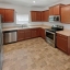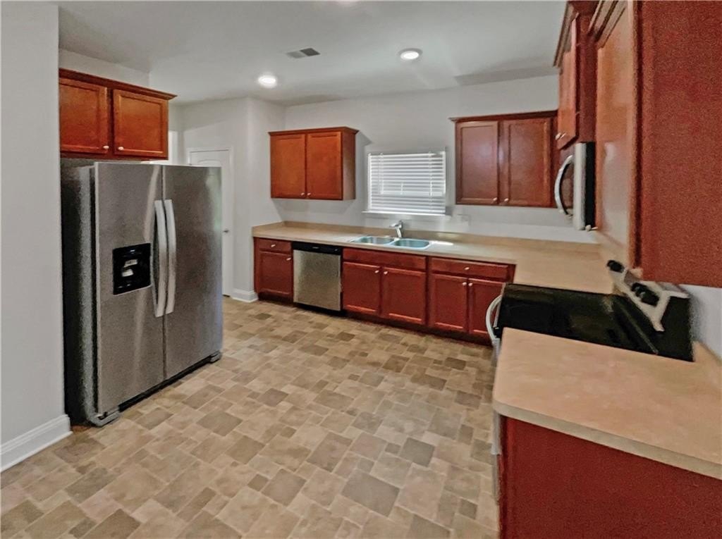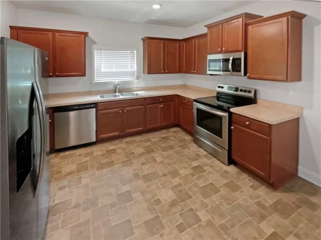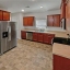 kitchen features stained cabinets, stainless steel appliances, and a convenient layout that opens to the cozy family room,