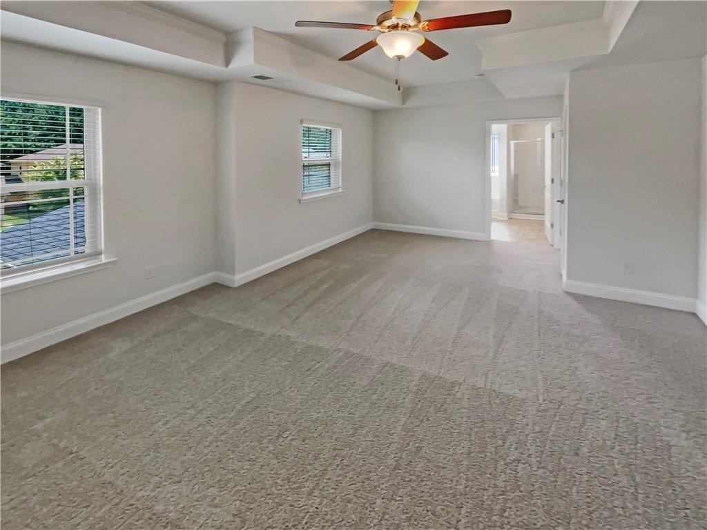 Upstairs, the spacious primary suite boasts a tray ceiling, his-and-her closets, and an en-suite bathroom with a double