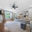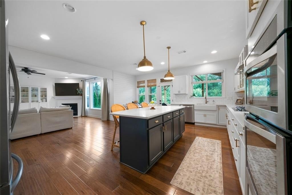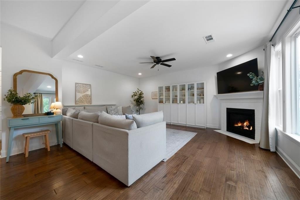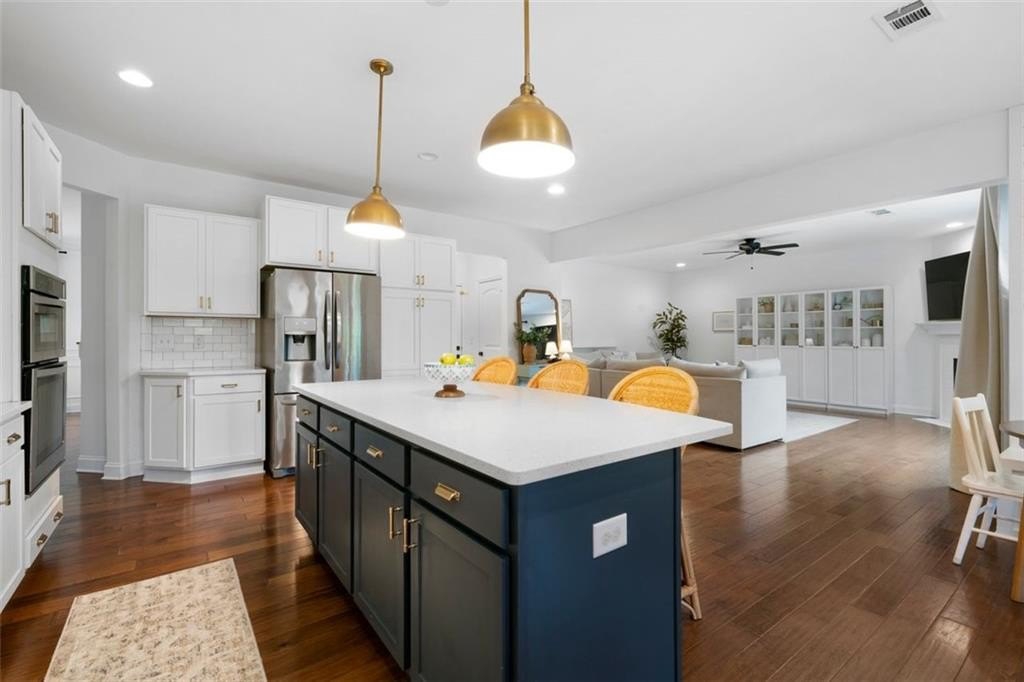 The heart of the home lies in its open-concept living space — where the cozy fireplace anchors the family room, seamlessly connecting to a spacious, sun-filled chef's kitchen complete with upgraded lighting, a breakfast nook, a kitchen island and views of the beautifully landscaped, fenced-in backyard. Enjoy morning coffee or evening dinners on the covered patio, a peaceful retreat designed for relaxation and entertaining.