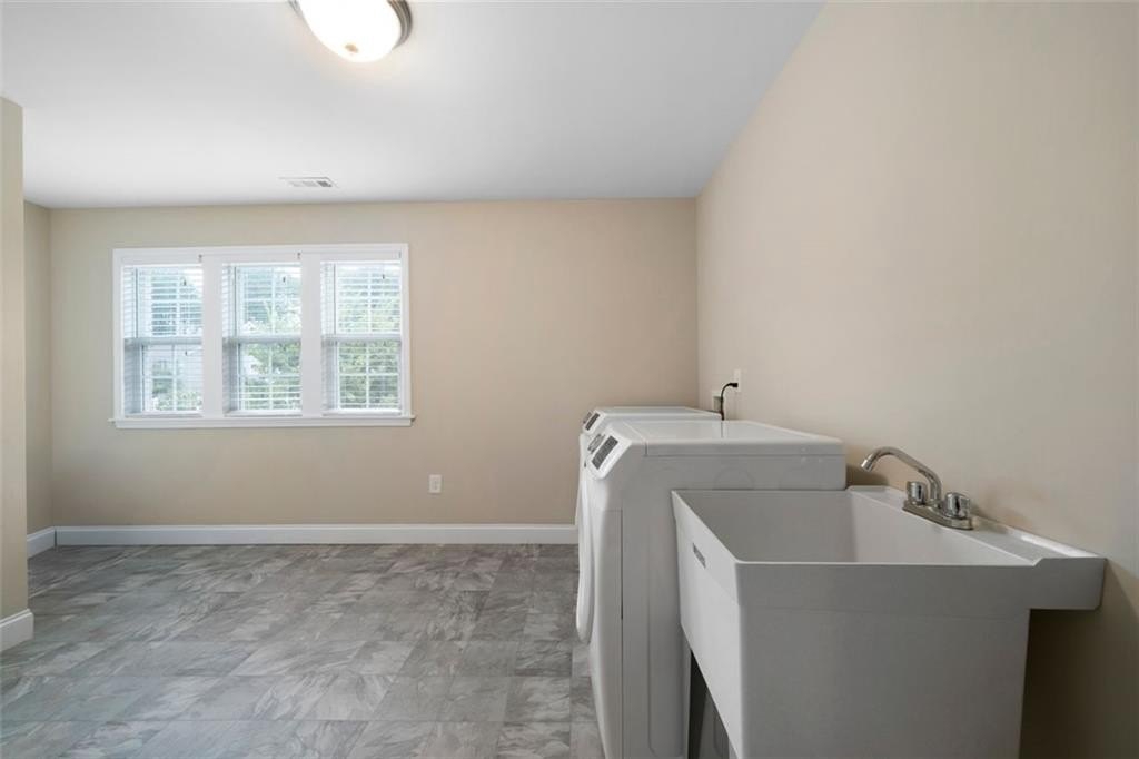 The two-car garage boasts coated floors and plenty of room for a workstation or extra storage.
