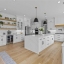 The chef’s kitchen is a culinary masterpiece, boasting multiple quartz countertop areas, a magnificent marble backsplash, and pristine white cabinetry. A custom-built hood with oak accents complements the top-of-the-line modern appliances, including a double built-in oven/microwave and a beautiful cooktop with pot filler. Flow seamlessly into the dining area, featuring oversized windows that flood the space with natural light, along with a stylish nook bench and contemporary chandelier.