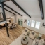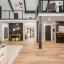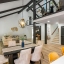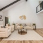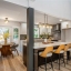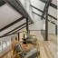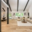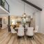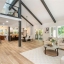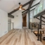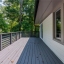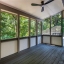 The open-concept main level features vaulted ceilings with dark wood beams, modern railings, a wood burning fireplace, and abundant natural light. The completely renovated kitchen includes new cabinetry, quartz countertops, a large quartz island with seating, and stainless steel appliances—perfect for both everyday living and entertaining. Adjacent to the living area is a spacious screened deck that overlooks the wooded backyard and Sope Creek, providing a peaceful outdoor retreat.