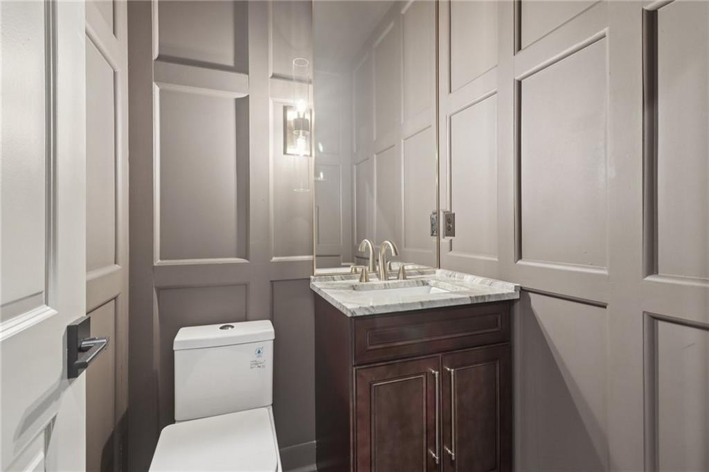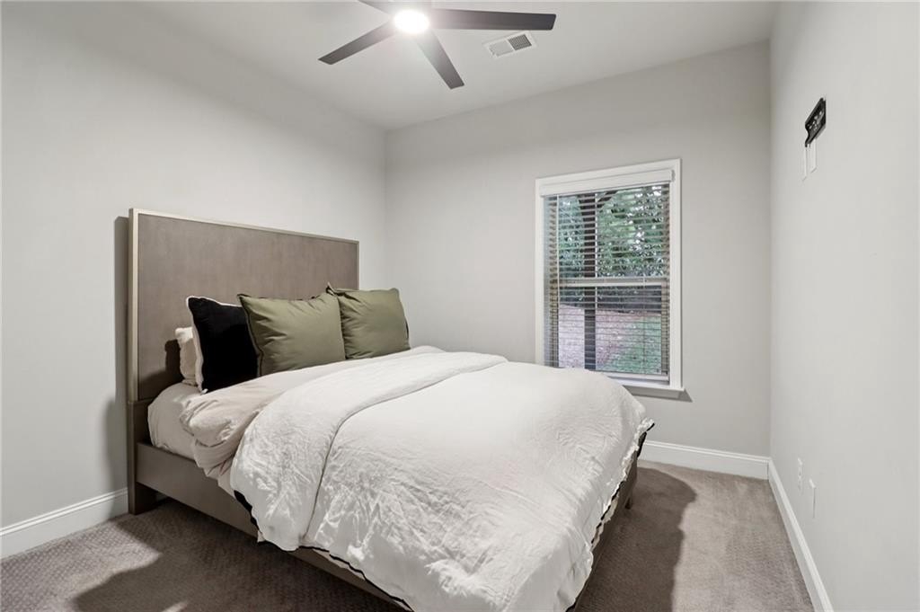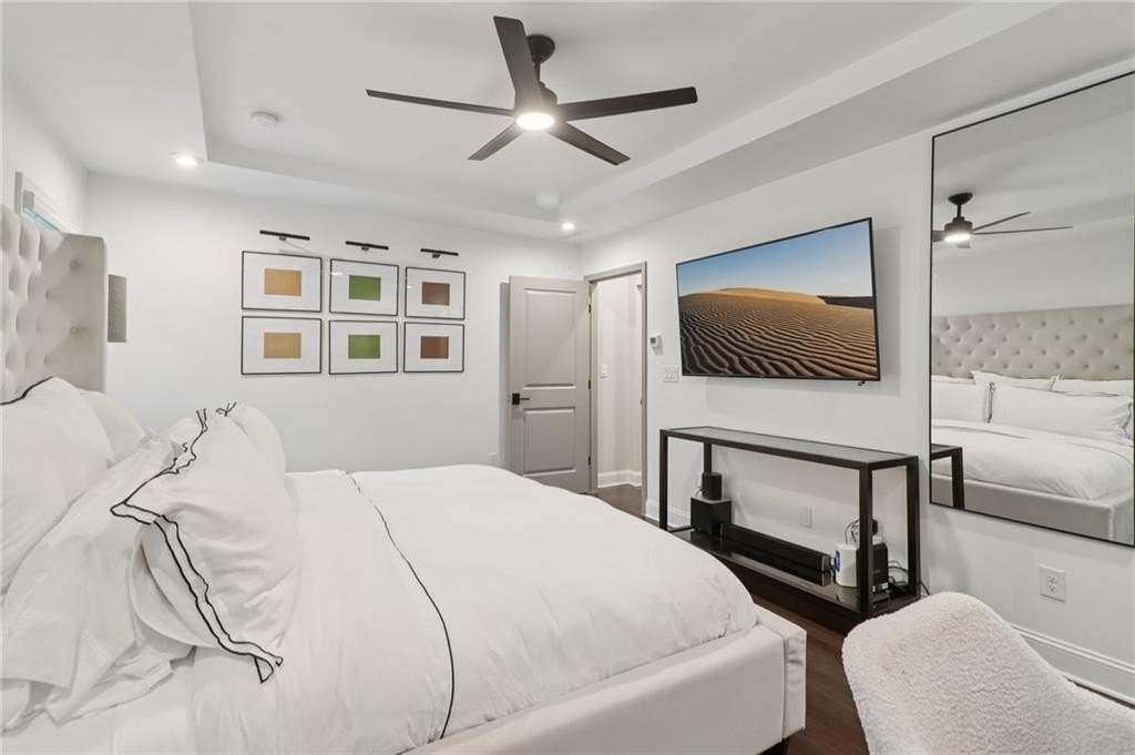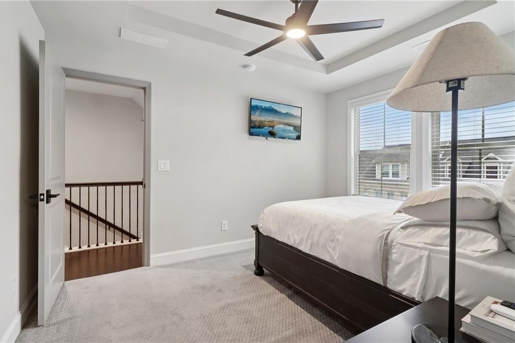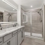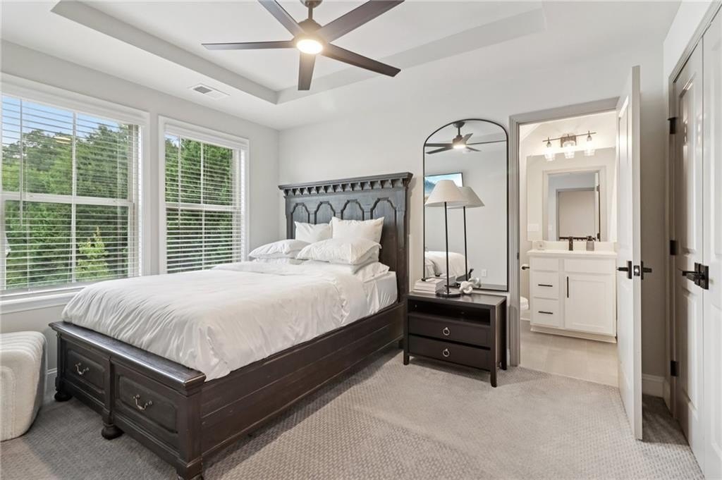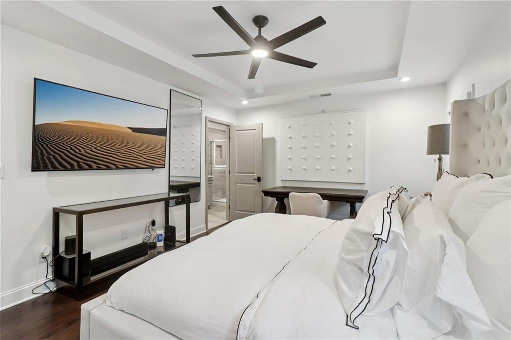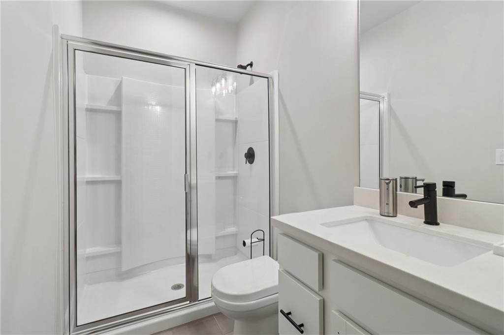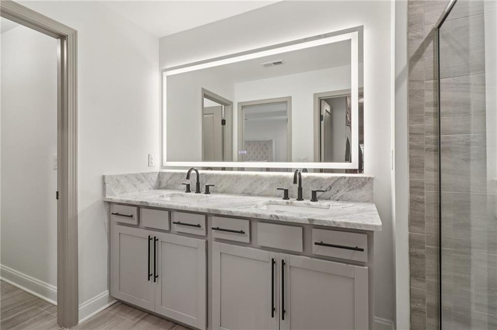 Upstairs, retreat to the expansive primary suite with vaulted ceilings, a walk-in closet with built-in storage, and bathroom featuring double vanities, LED mirror and elegant designer tilework. Two additional bedrooms each have bathrooms attached or conveniently nearby, offering flexibility and comfort for guests, a home office, or a growing household.