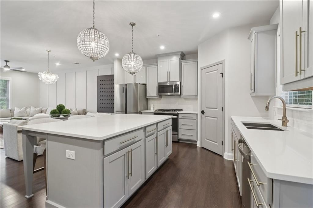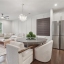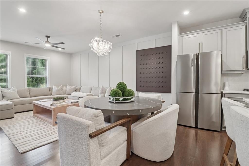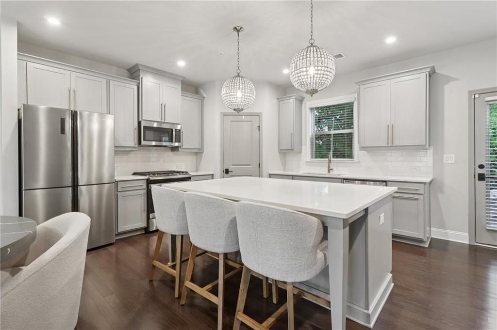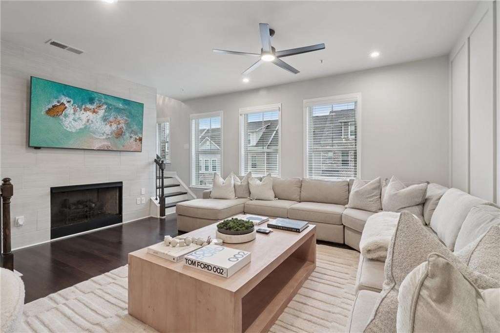 The open-concept main level offers a warm, inviting fireside living room that flows effortlessly into the dining space—ideal for hosting gatherings or cozy evenings at home. The beautifully designed kitchen is a true focal point, boasting quartz countertops, a custom tile backsplash, sleek stainless steel appliances, and a stylish breakfast bar with significant storage—perfect for morning coffee or casual bites.