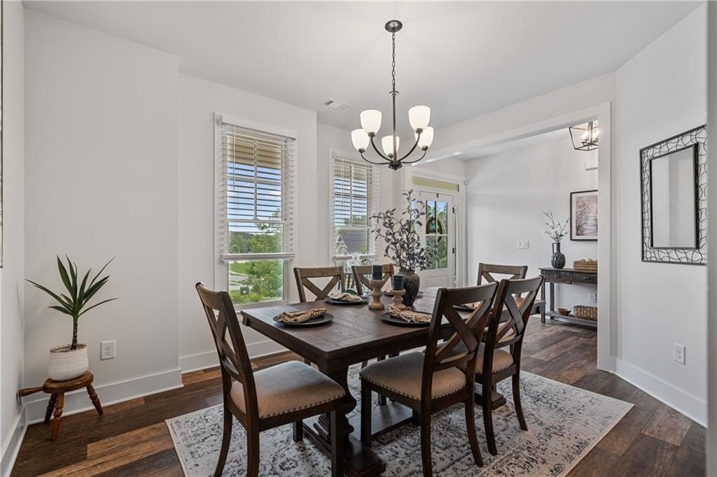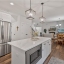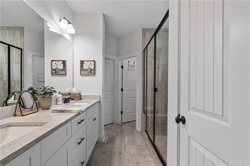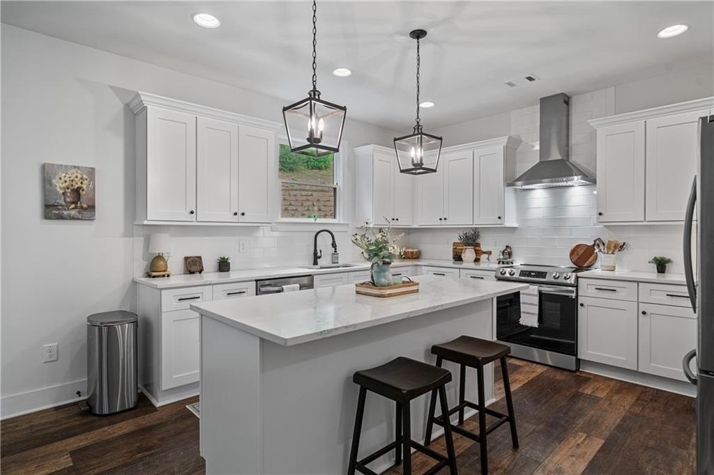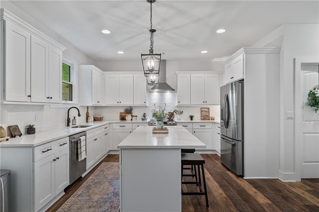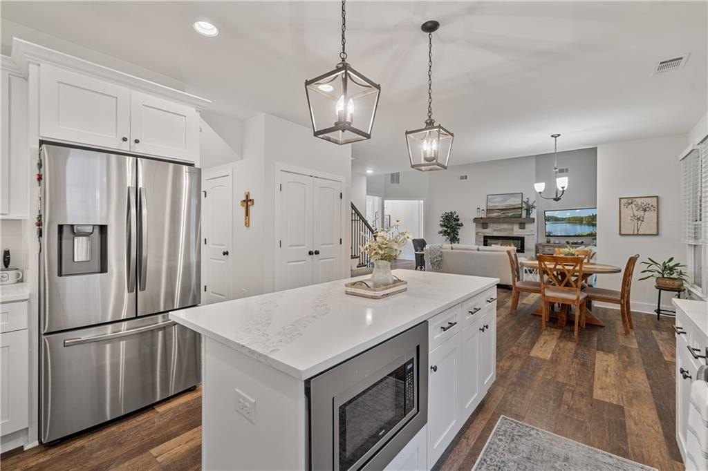 The main level is thoughtfully designed for convenience and sophisticated living. The gourmet kitchen is a chef’s delight, equipped with pristine white cabinetry, quartz countertops, a generous island, and high-end stainless-steel appliances. This space is perfect for preparing meals and hosting gatherings. Adjacent to the kitchen, a separate dining room provides a dedicated area for more formal meals and special occasions, adding to the home’s versatile appeal. The owner's en-suite, also located on the main floor, is a private retreat. It features a spacious bedroom with an elevated tray ceiling and an elegant bathroom with a double vanity, a large walk-in shower, and a substantial walk-in closet.