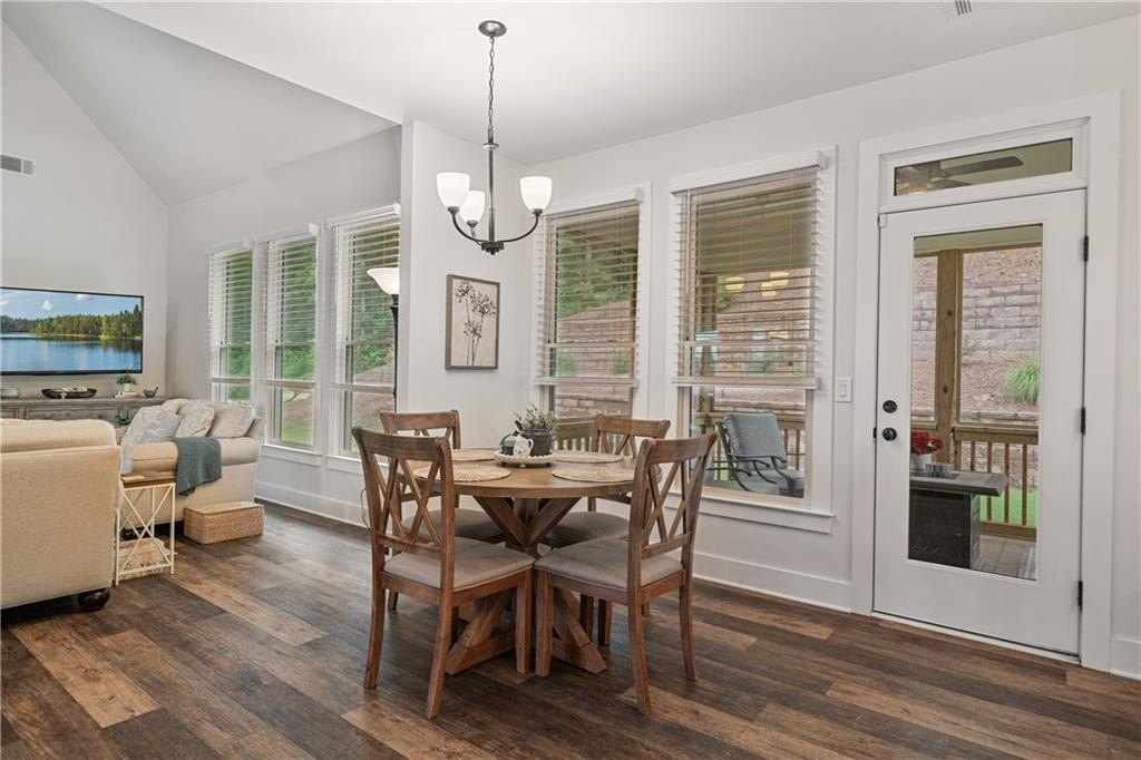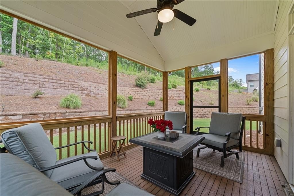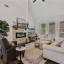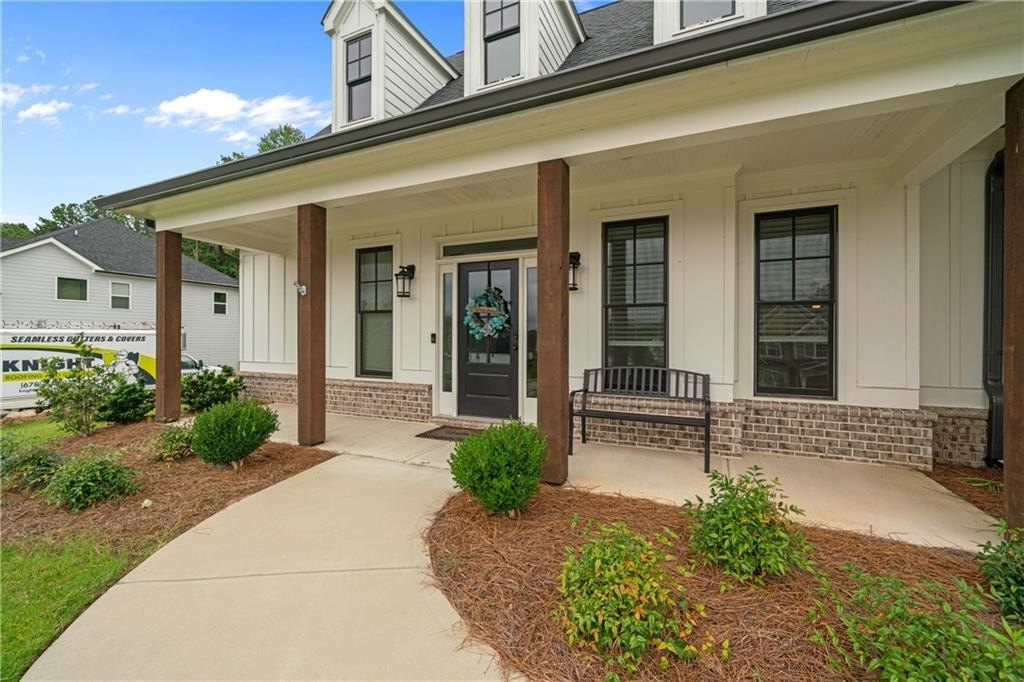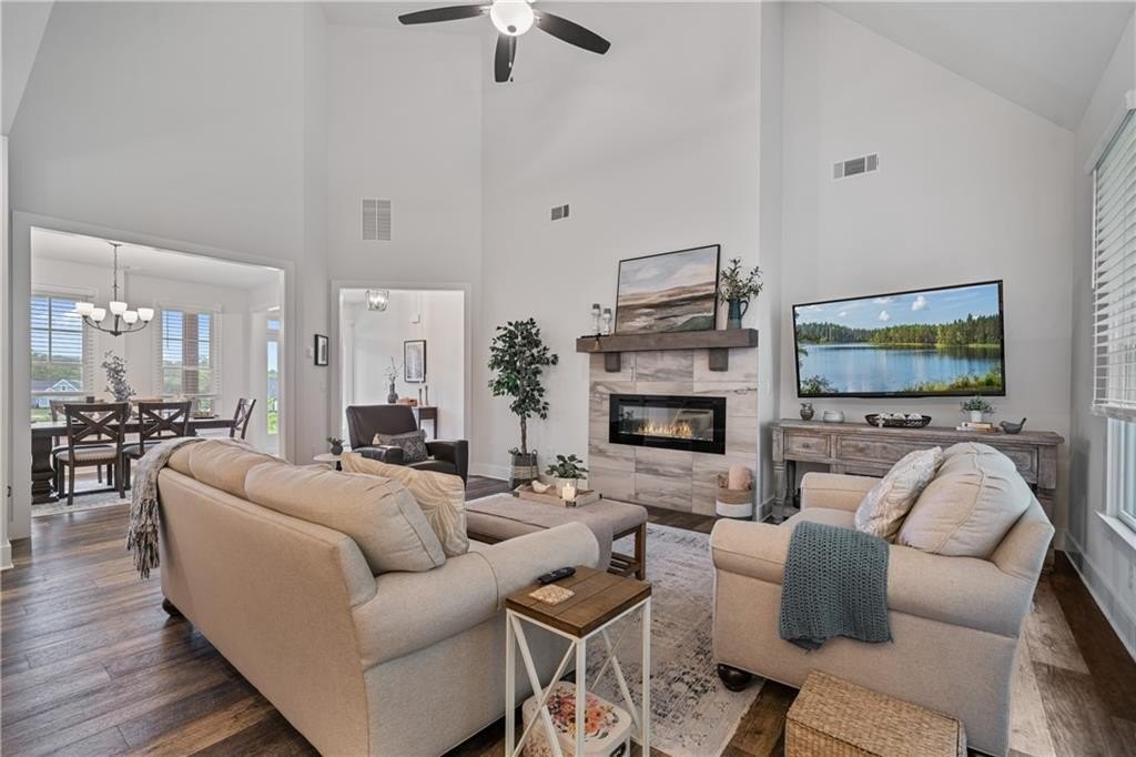 This exceptional property presents a harmonious blend of classic elegance and modern comfort, situated in a highly desirable community. The home’s exterior features a welcoming board and batten design with clean lines and striking black window accents. As you step inside, the open-concept floor plan immediately draws you in, with a stunning two-story living area that feels both grand and inviting. Large windows flood the space with natural light, offering views of the surrounding landscape and creating a bright, airy atmosphere. A modern fireplace serves as a central focal point, providing a cozy element for cooler evenings.