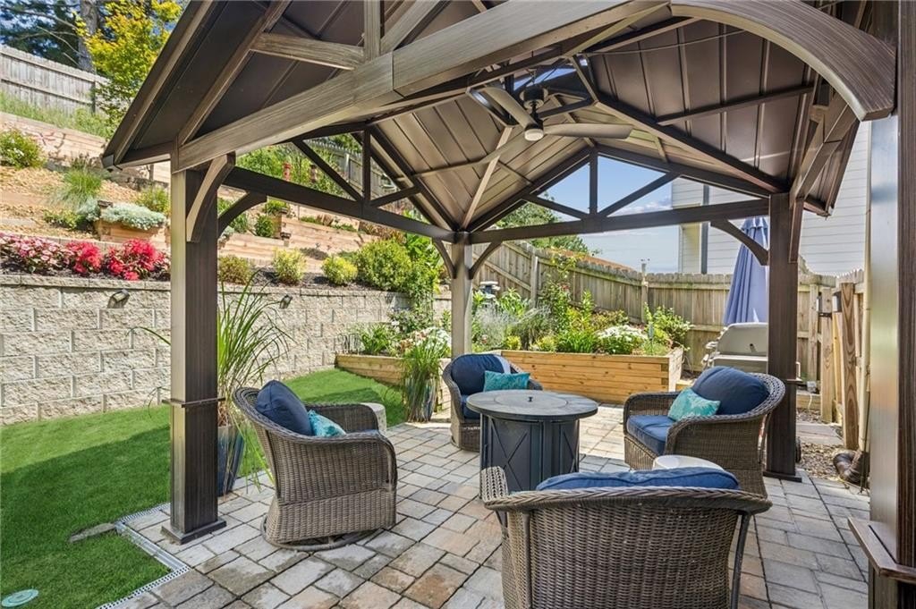 view of the terraced backyard providing a serene, very private place to relax. The patio is