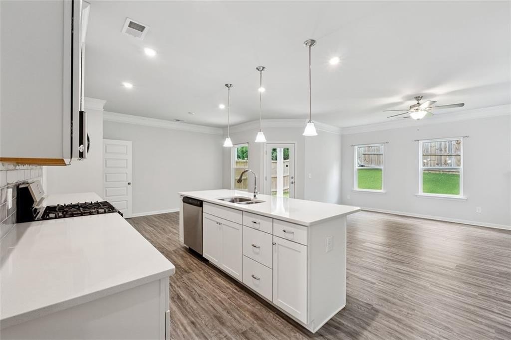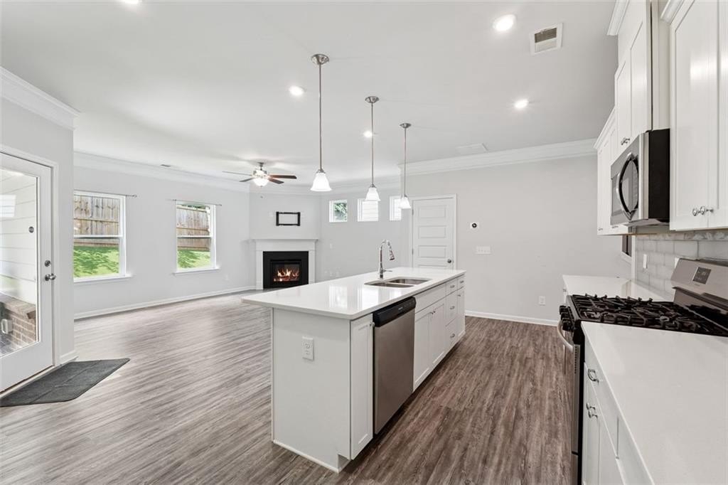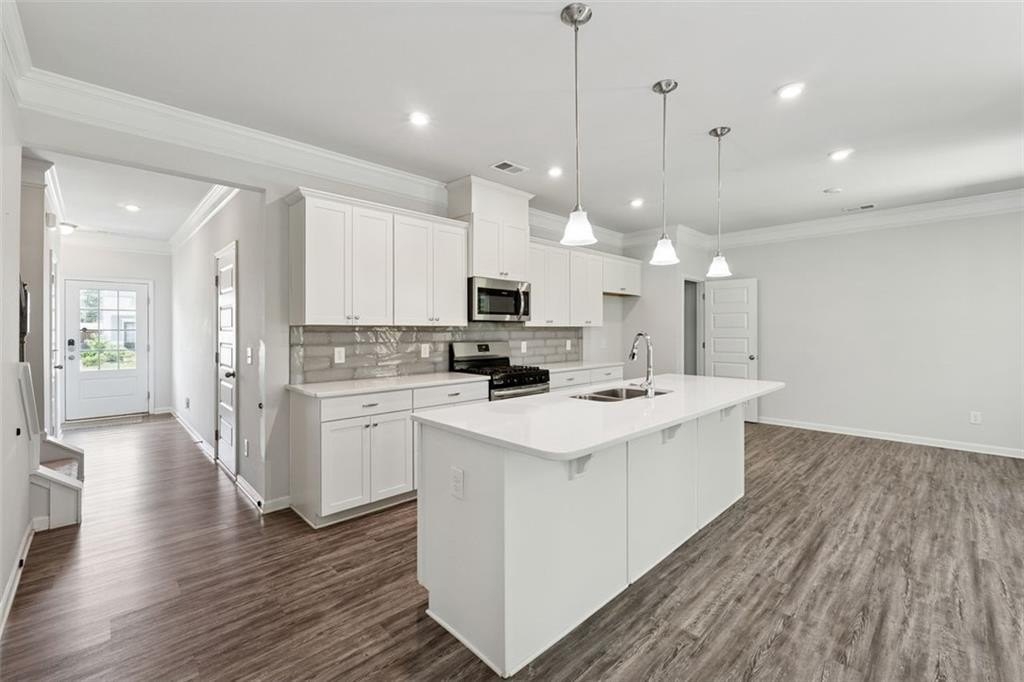 Step inside to a bright, open-concept main level filled with high-end upgrades. Host unforgettable gatherings in the spacious great room featuring a cozy gas fireplace and seamless flow into the gourmet kitchen. The kitchen boasts a large center island, designer quartz countertops, stainless steel appliances including a gas range and microwave, stylish subway tile backsplash, and crisp white shaker cabinetry.