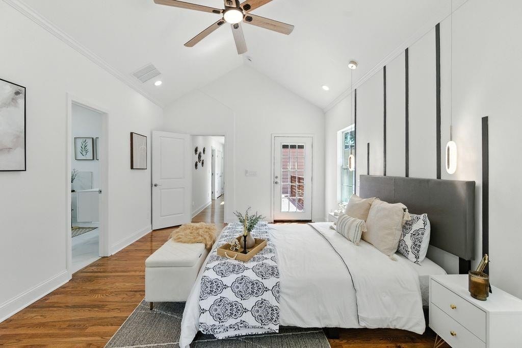 Looking for a private retreat? Escape to the owner’s suite oasis, where vaulted ceilings, elegant accent walls, and a custom walk-in closet elevate the space. Step through your private access to the backyard deck and enjoy serene mornings or peaceful evenings. The spa-like owner’s bath offers ultimate relaxation with a deep soaking tub, double vanities, and a freestanding glass shower.