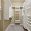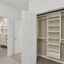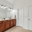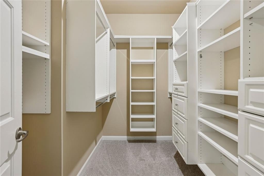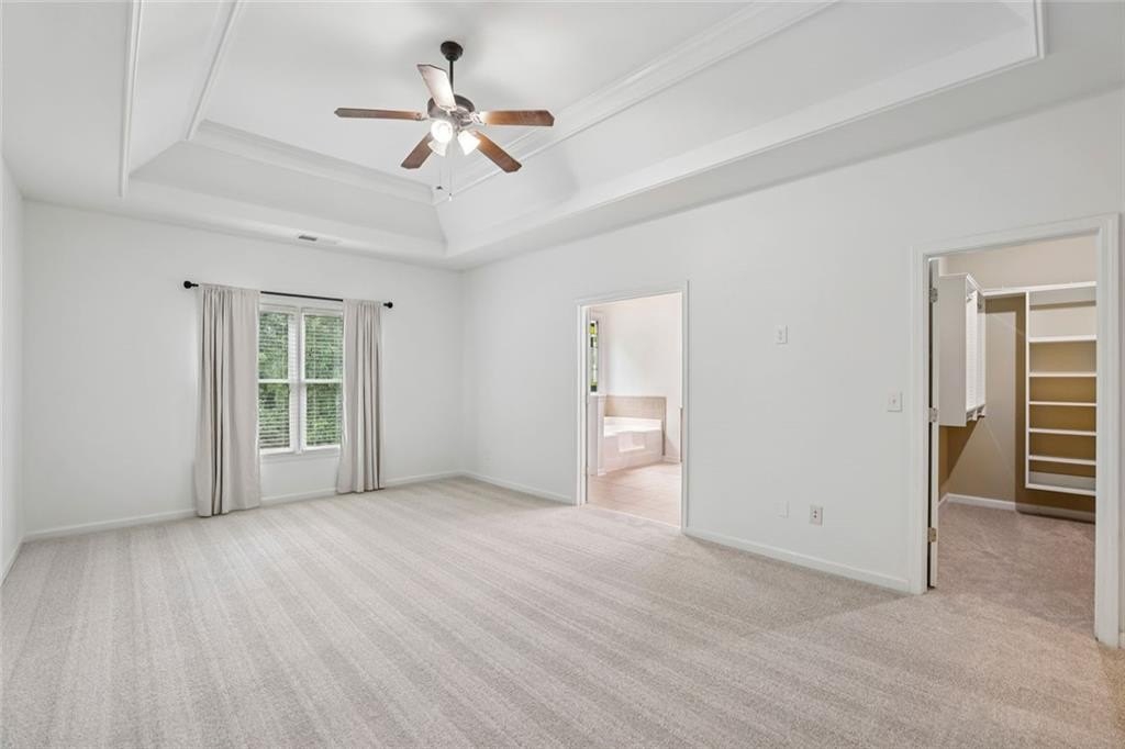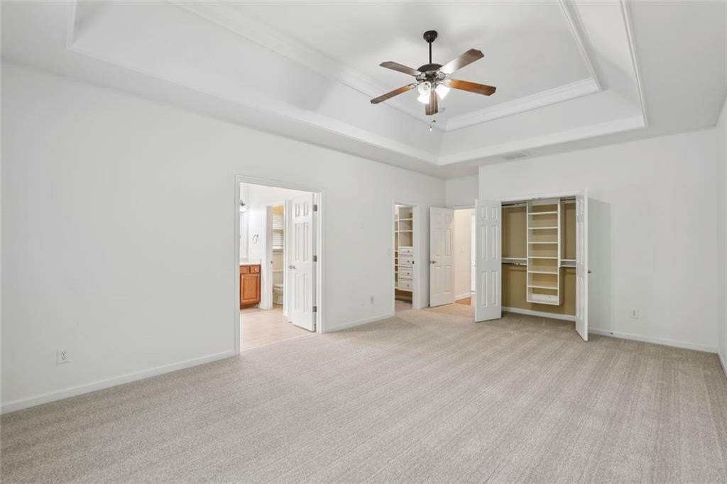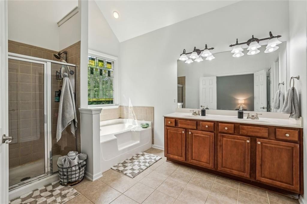 The main-level primary suite offers custom dual closets, spa-style bath with soaking tub and separate shower, dual vanities, and a private water closet. Two additional main-floor bedrooms share a full bath and feature cathedral ceilings and generous closet space.