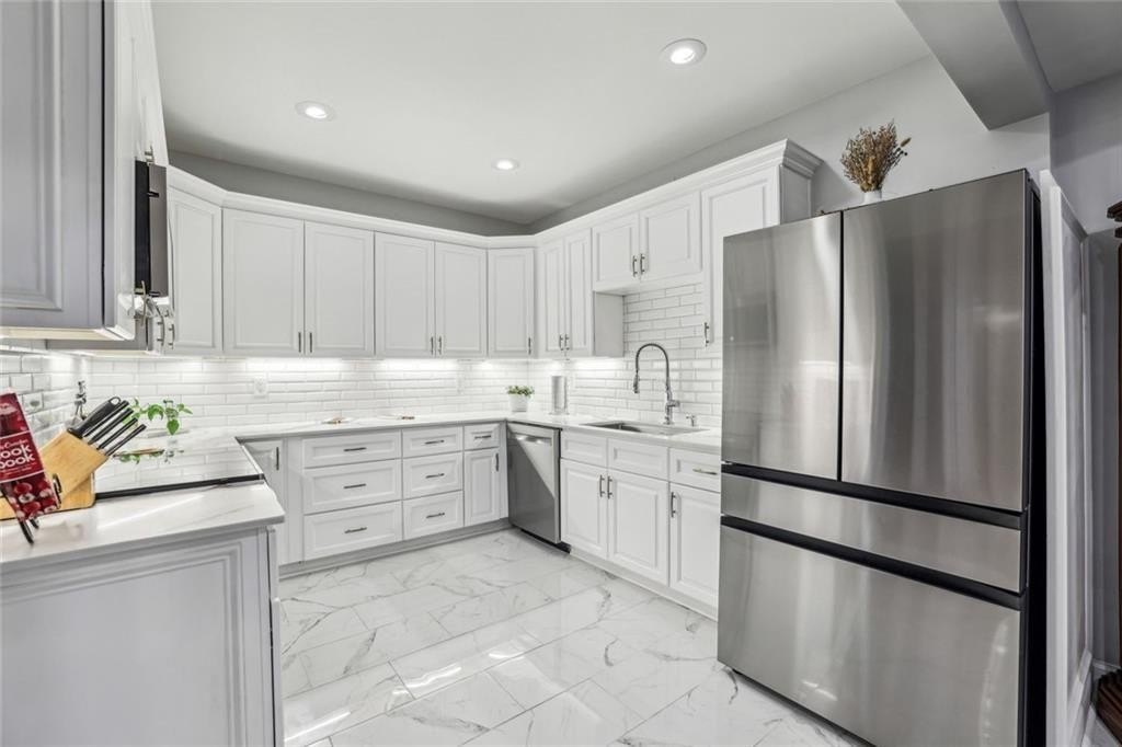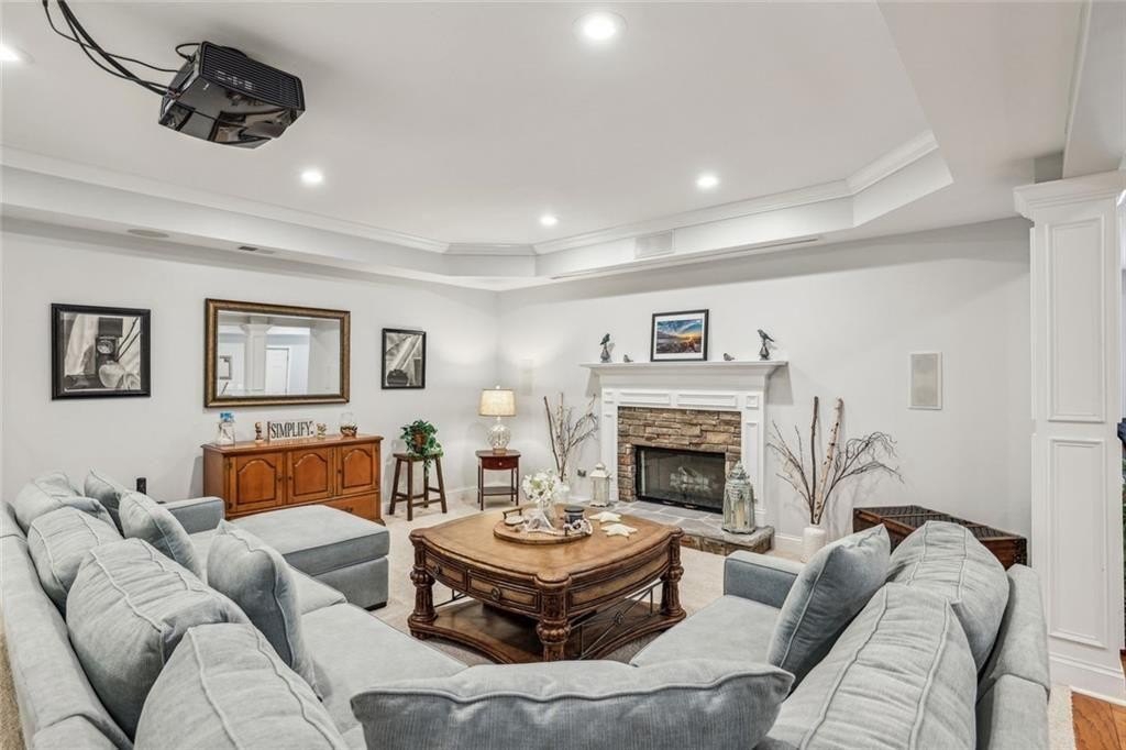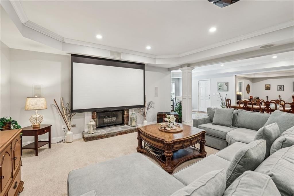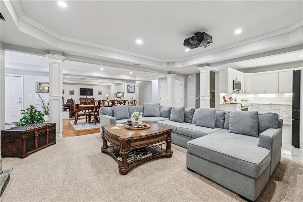 Designed with versatility and multigenerational living in mind, the home features 6 to 7 bedrooms, 4.5 bathrooms, and multiple living and entertaining spaces across three finished levels. The terrace level is a standout feature—ideal for in-laws, guests, or rental income—with its own private entrance, full white kitchen with quartz countertops and induction range, stainless steel appliances, butler’s pantry, gas fireplace, dropdown projector screen, private office/flex room, two bedrooms (one with dual closets, one with a secure hidden closet), a full laundry area, and ample storage.