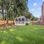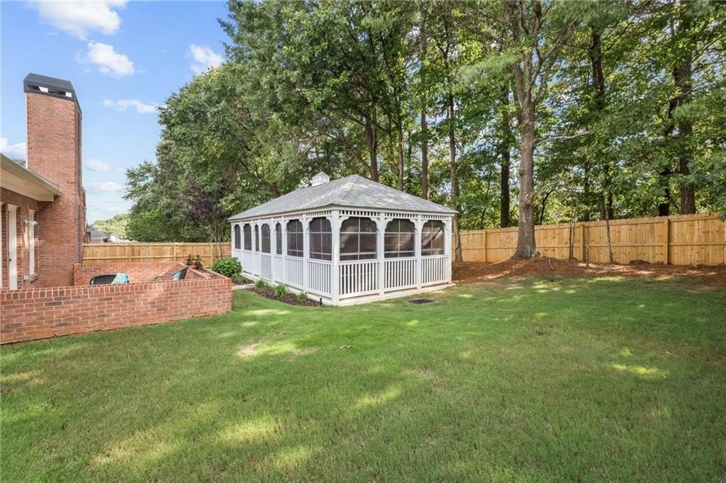 Expansive fenced backyard with gazebo, lap pool, and jacuzzi water feature