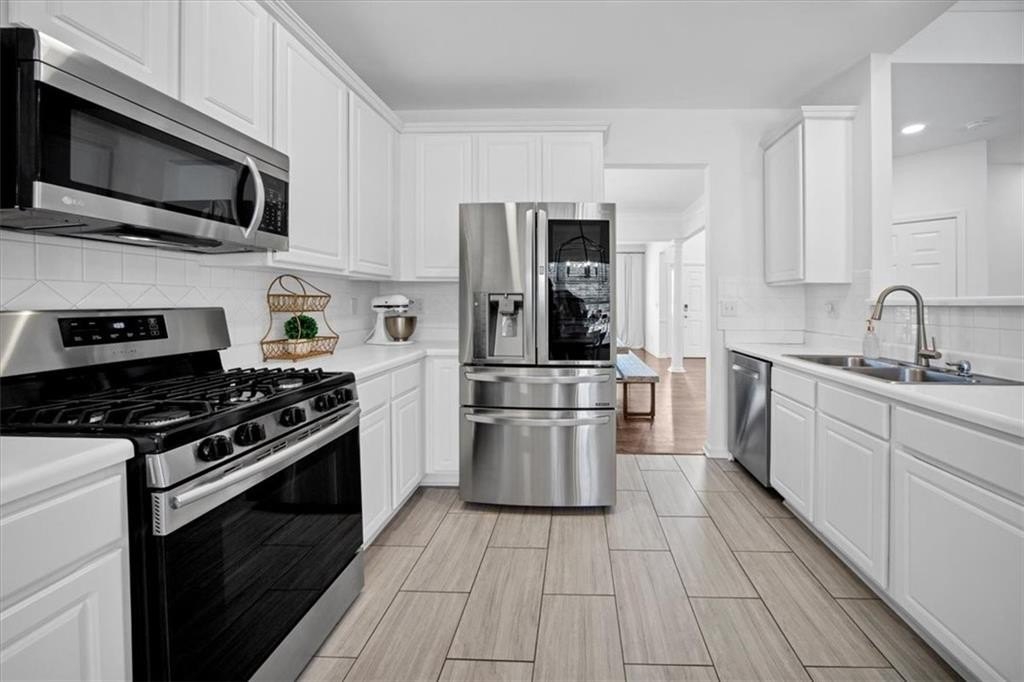 The heart of this home beats in the spacious kitchen, equipped with sleek stainless steel appliances, crisp white cabinets, and an inviting breakfast space, ideal for morning coffee or as a multifunctional space; along with a pantry and recessed lighting. The open layout seamlessly connects the kitchen to the 2-story living and formal dining room, perfect for entertaining and everyday living.