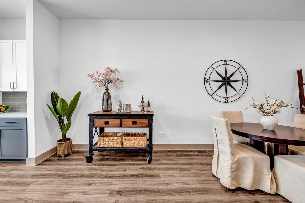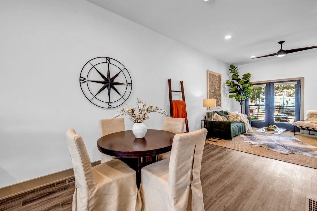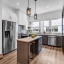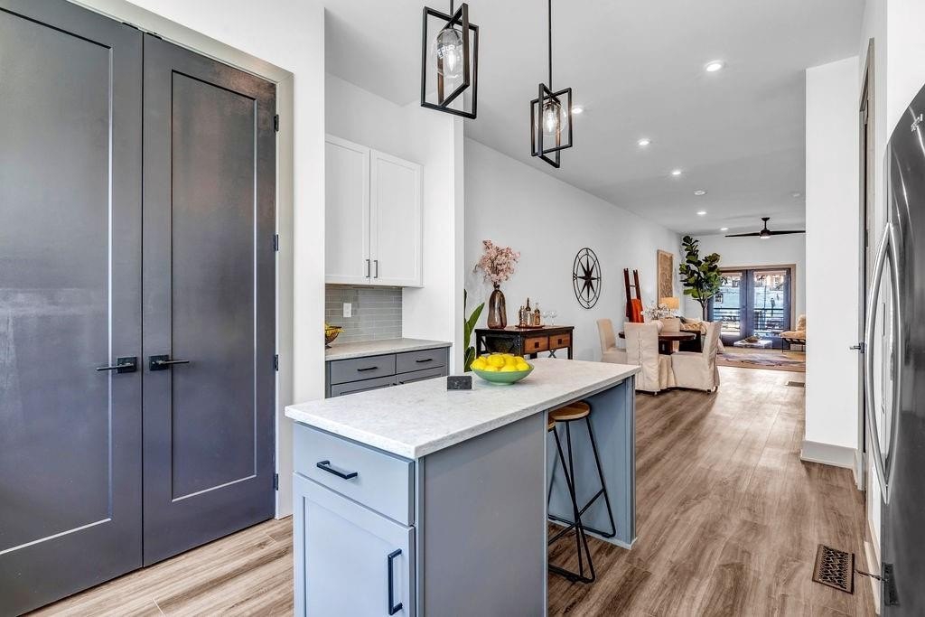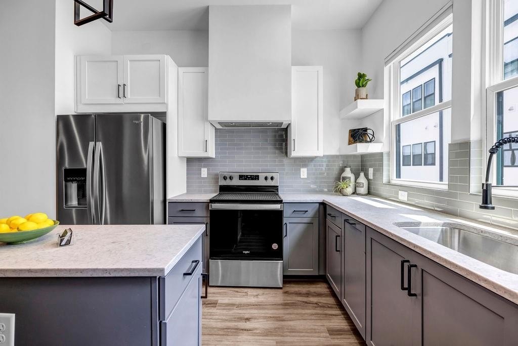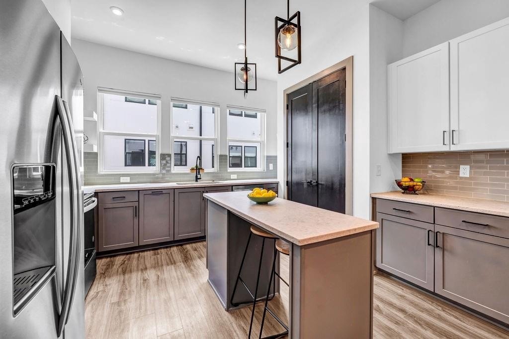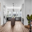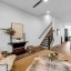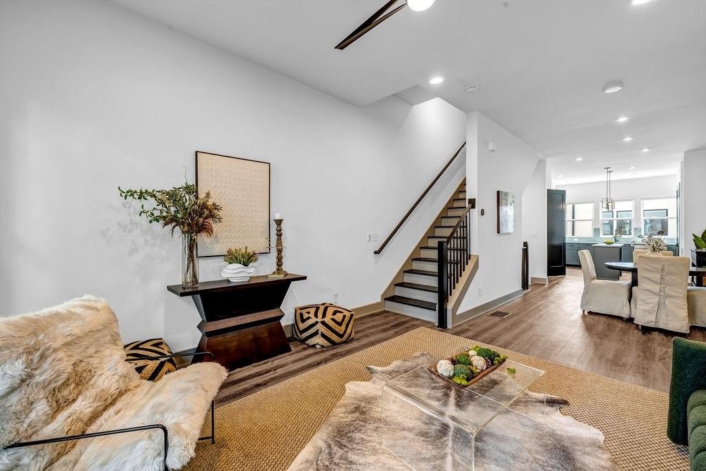 The main living level is a statement in itself. It's open, airy, and perfect for both refined entertaining and relaxed daily living. At its heart, the designer kitchen stuns with sleek Quartz countertops, custom cabinetry, premium stainless steel appliances, and an island ready for gatherings. A wall of dramatic windows frames the space like art, while a chic powder room adds convenience for guests.