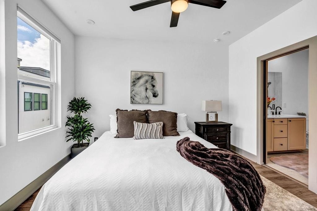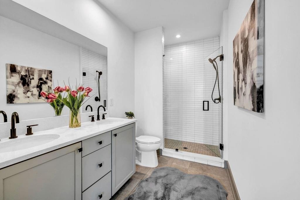 On the upper level, the primary bedroom offers a serene retreat, complete with a spa-caliber ensuite featuring dual vanities and a frameless glass-tiled shower. The secondary bedroom and full bath are equally inviting, ideal for guests or a private home office. Completed with a tandem two-car garage with abundant storage.