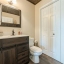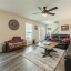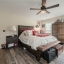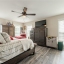 The main-level master suite is a private retreat with a sliding barn door, double vanities, garden tub, separate shower, and a large walk-in closet. Wood floors flow throughout the home, complemented by 9-foot smooth ceilings, electronic thermostats, and keyless entry for modern convenience.