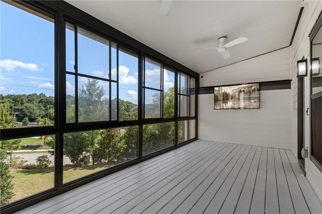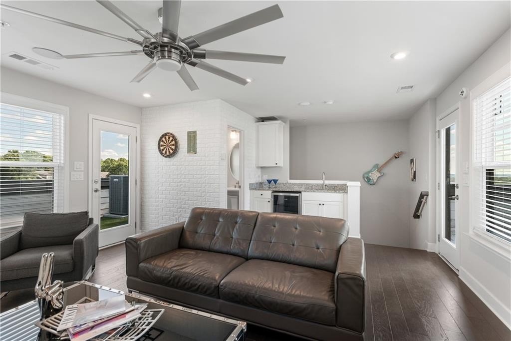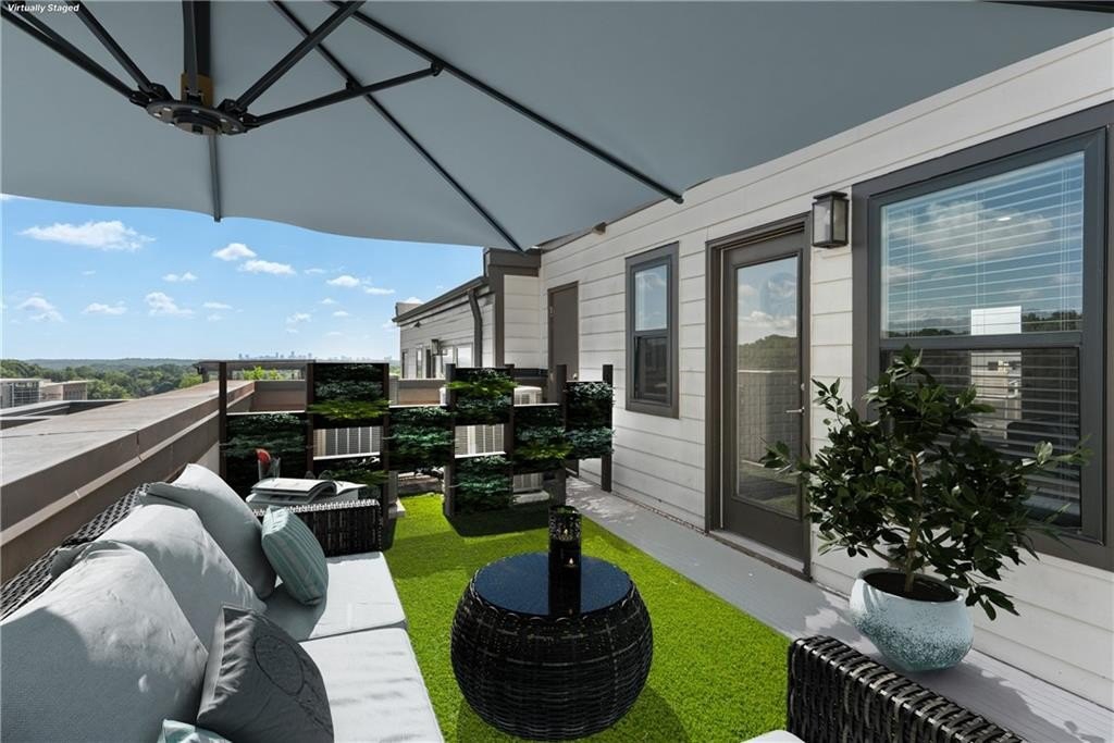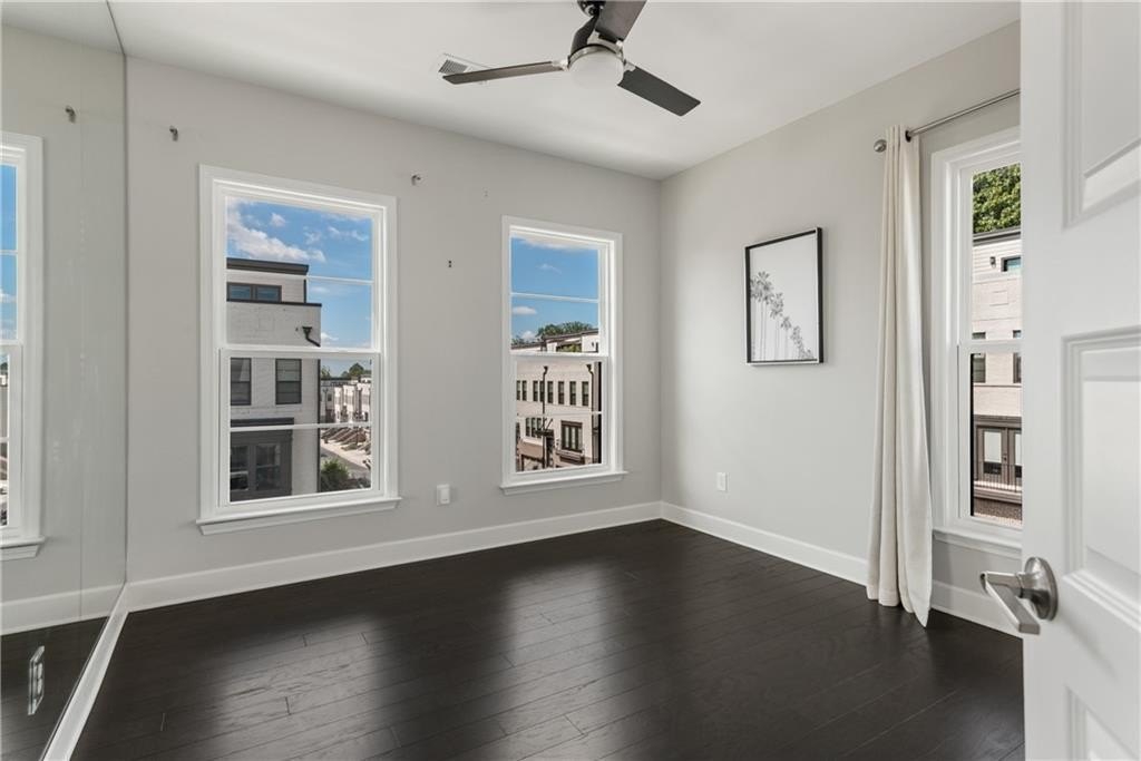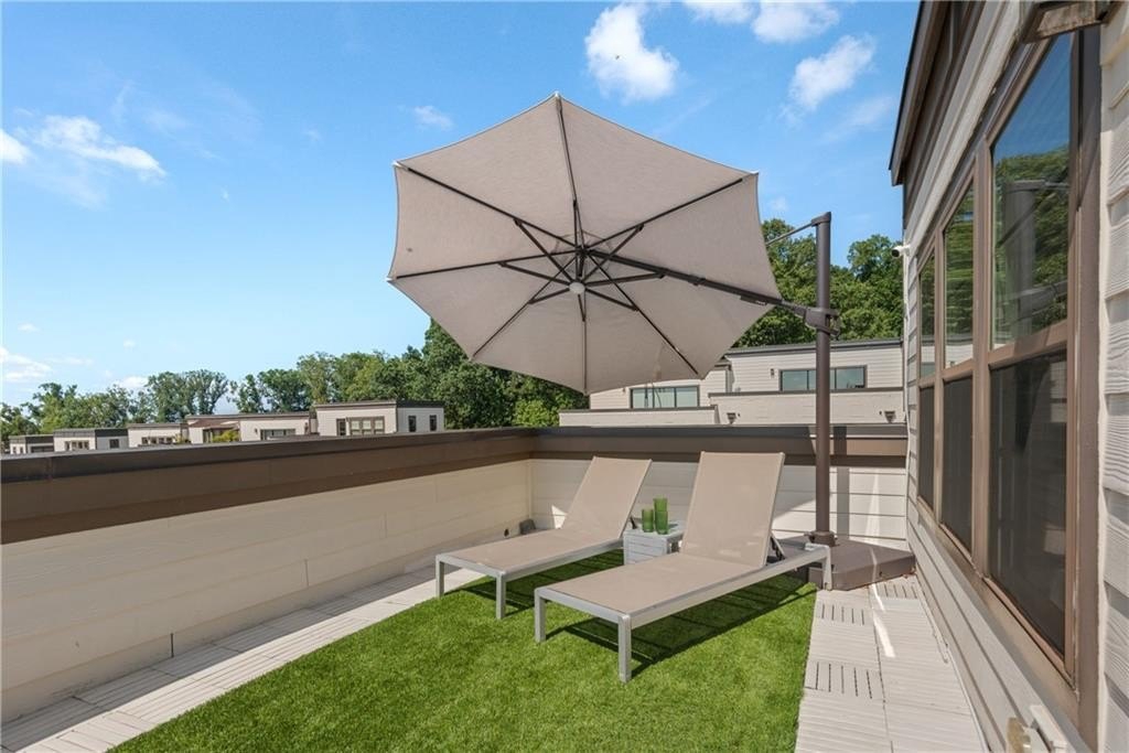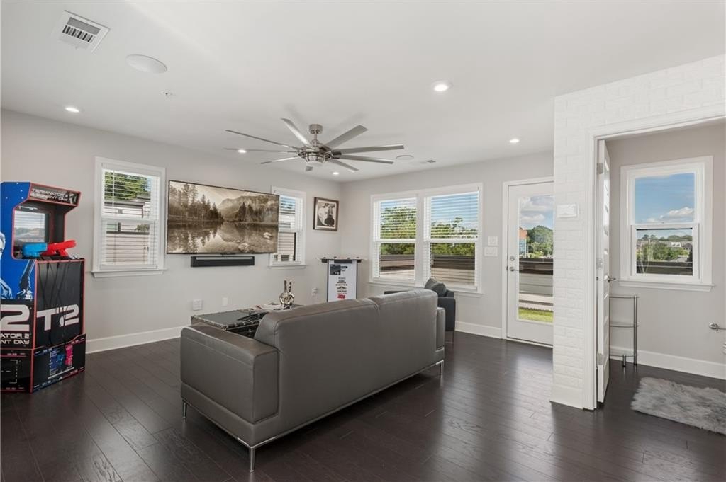 Stunning Luxury West Village 4-Level Townhome! This architecturally beautiful modern end-unit offers unparalleled rooftop views of downtown and midtown. Enjoy a live-work-play lifestyle with walkability to West Village's vibrant mix of retail, restaurants, and amenities, including gyms, salons, coffee shops, medical centers, and more. Conveniently located - minutes from the Battery, Buckhead, downtown Atlanta, Vinings, the Beltline, and Midtown, with easy access to I-75 and I-285, and zoned for desirable Cobb County schools. Unique Features to this unit: Screened porch addition on the main level* Custom built-in desk/office with high-end cabinetry * Wet bar with wine refrigerator in the top-floor game room * Custom fireplace on the main level * Espresso-stained hardwood floors throughout * Wrought iron railings, designer paint colors, shiplap accents, painted brick, and mirrored workout walls * Custom high-end sisal-style carpets * French doors to a Juliette balcony * Upgraded light fixtures and fandeliers * California Closet systems throughout * Hardwired UBIQUITY internet booster * ADT Security system with cameras, alarms, and mobile control * Artificial turf and deck wood tile on rooftop balconies * Covered terrace patio with greenspace access * Steps to community fire pit and dog walk * newer LG SMART INSTAVIEW refrigerator and Bosch dishwasher.