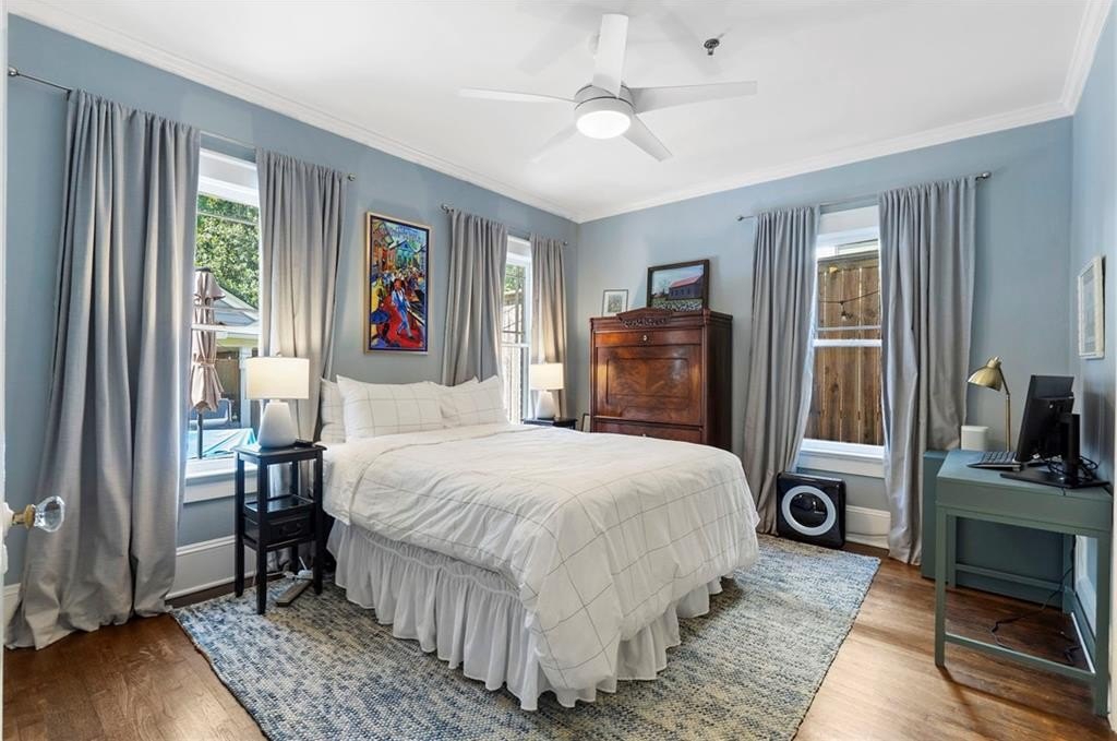 On the main floor, enjoy hardwoods throughout with two bedrooms and a renovated full bath, a light-filled, fireside living room, a separate dining room, and an updated kitchen. French doors open to the flat, deep backyard complete with abundant green space and a rare, detached two-car carport - the outdoor living here is just as impressive as indoor!