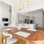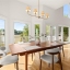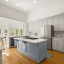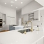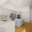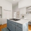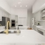 A fully renovated chef’s kitchen with an expansive island, new countertops, and designer backsplash