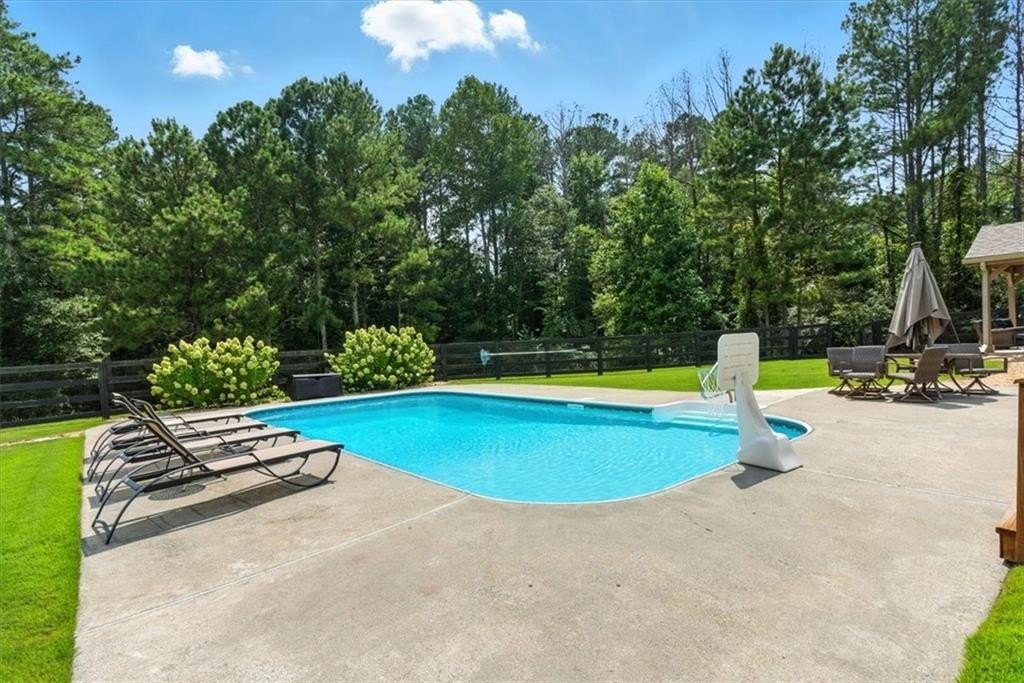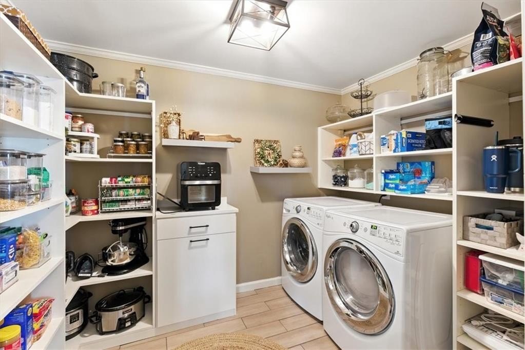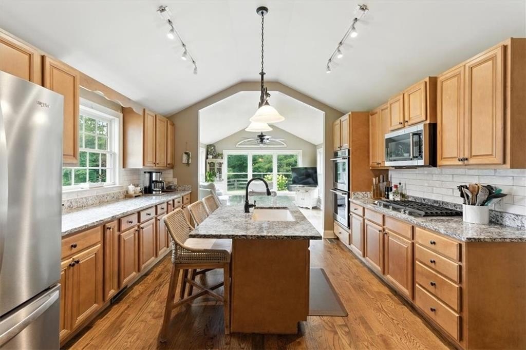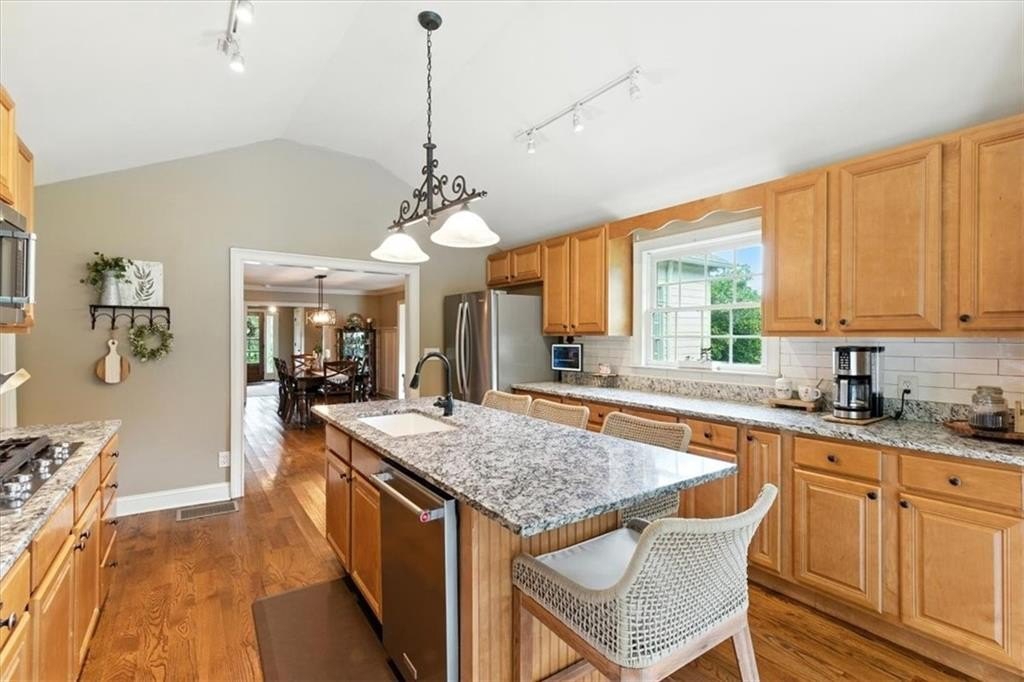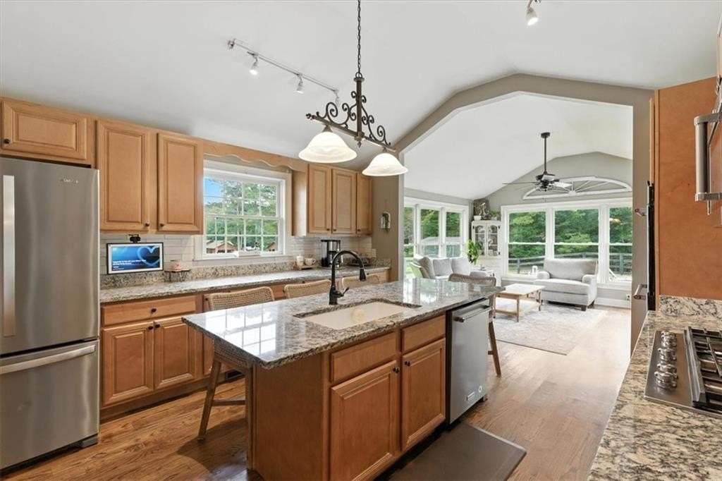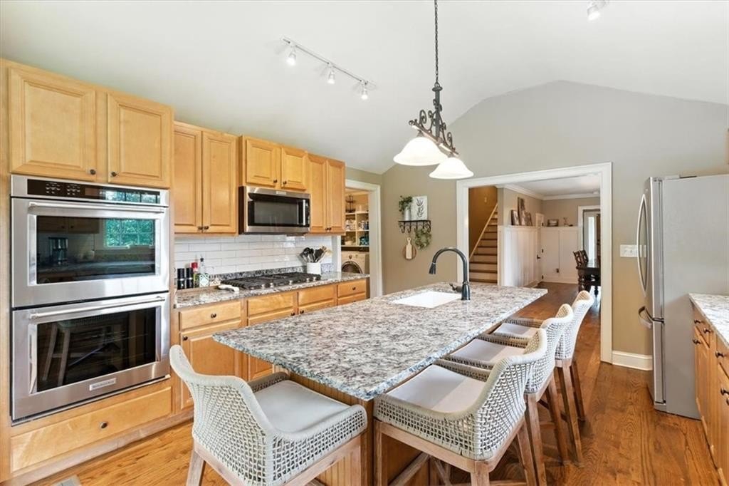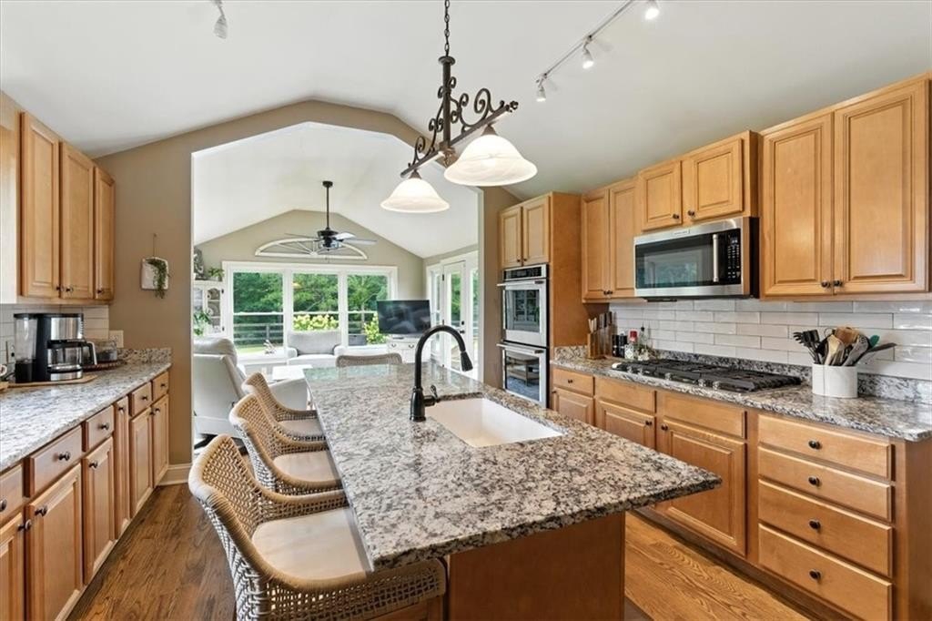 Updated, open-concept kitchen with granite countertops, KitchenAid stainless appliances, California Closet pantry/laundry system, and a charming keeping room with views of the pool