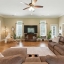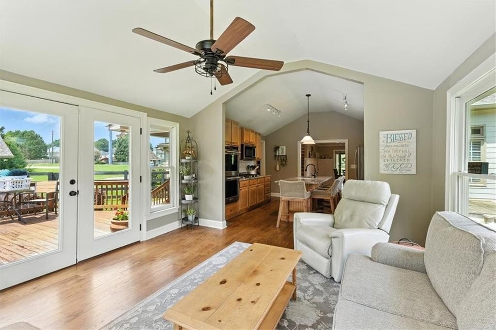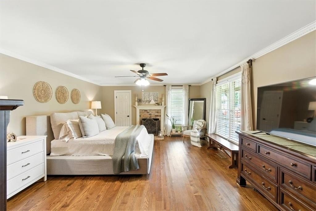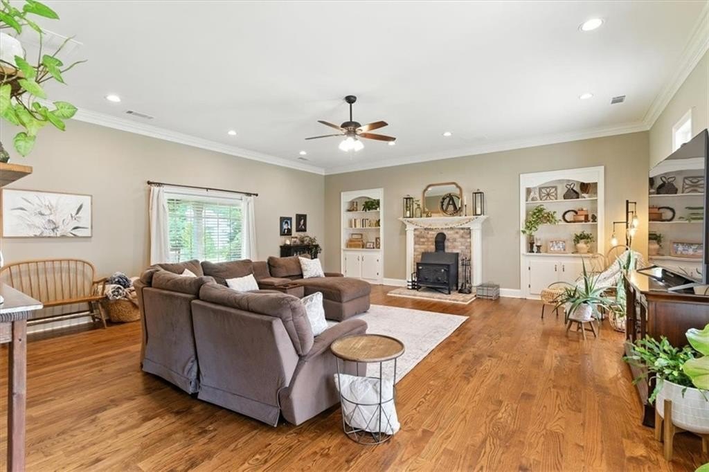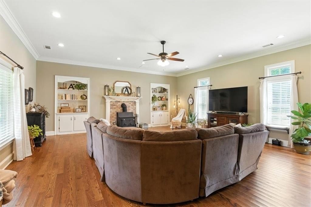 Large, cozy family room with a brick fireplace, wood-burning stove, and abundant natural light