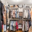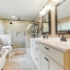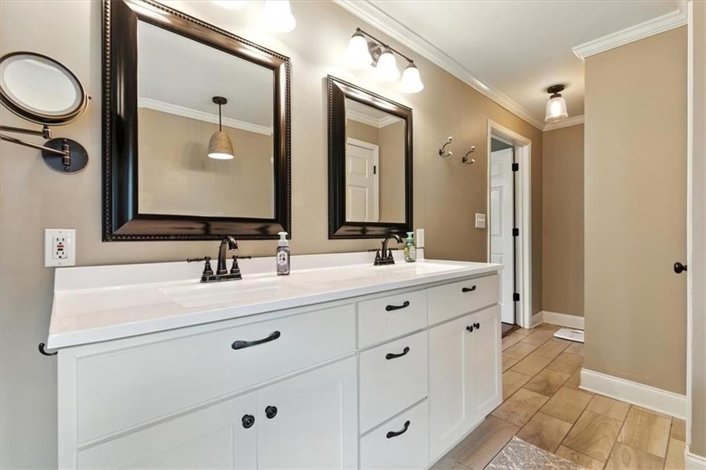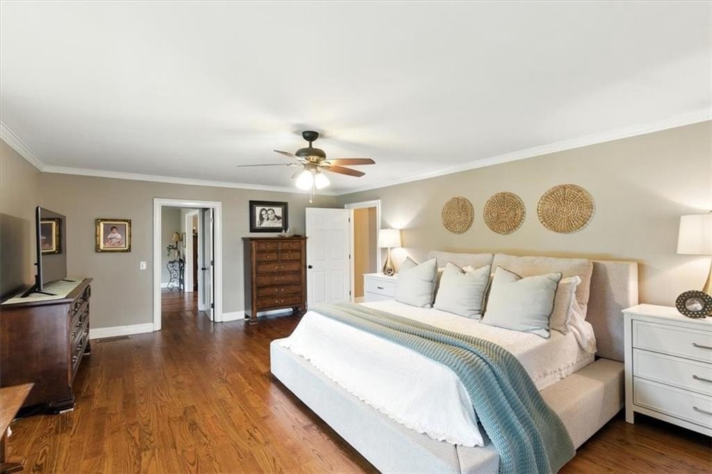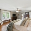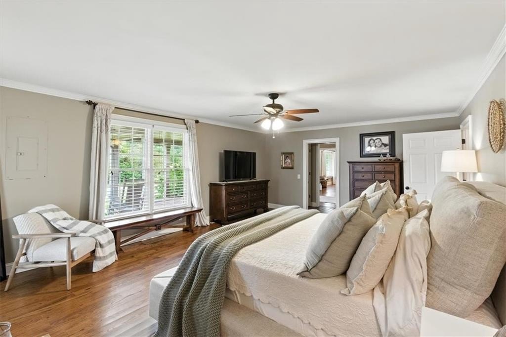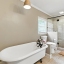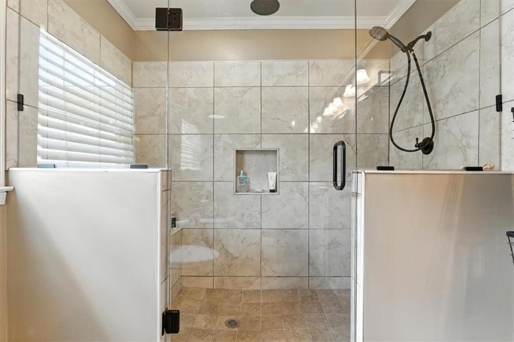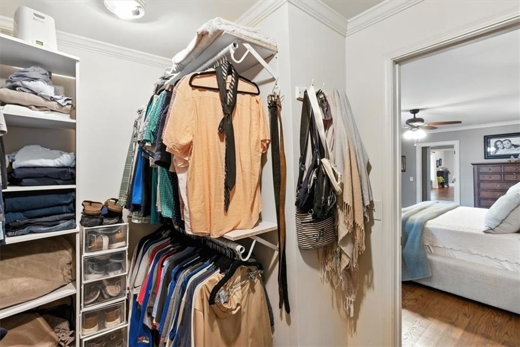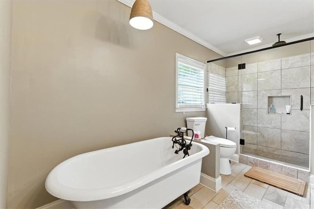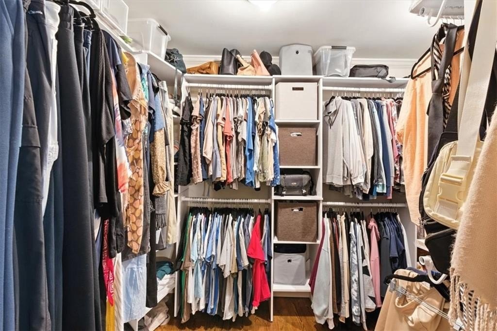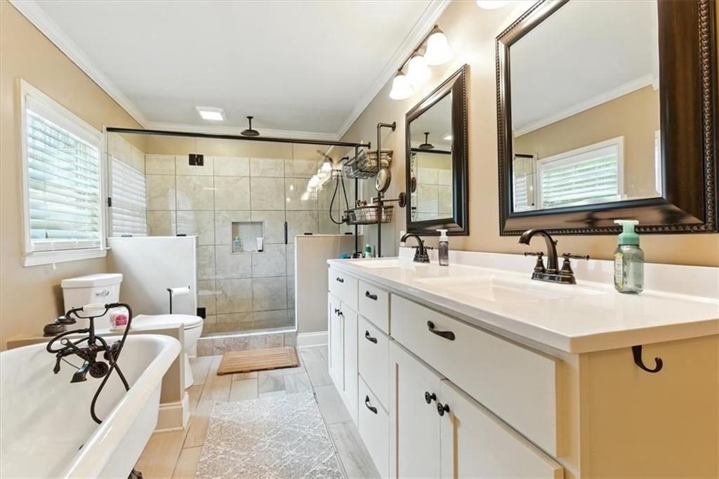 Oversized primary suite on the main level, featuring a large walk-in closet with California Closet system, ensuite bath with a tiled shower, double vanity, and a classic clawfoot tub